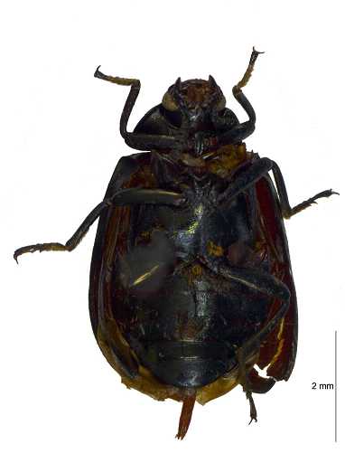 描述:身体椭圆形,高隆,有光泽。体暗红棕色;头和前胸背板棕黑色,些微铜蓝色;鞘翅铜黑色,刻点行和行间多少有些紫色;鞘翅缘褶紫罗兰色;腹面和足暗红棕色,反射绿色光泽;触角浅褐色;唇基红棕色。