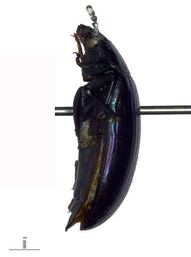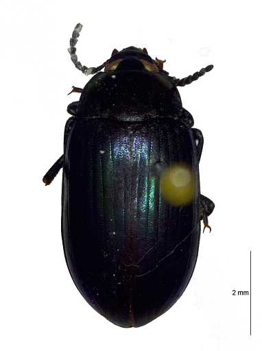 描述:长卵形。背表蓝黑色,有弱丝质光泽;腹面黑色;鞘翅无虹彩,两侧有纵向蓝紫色光泽。