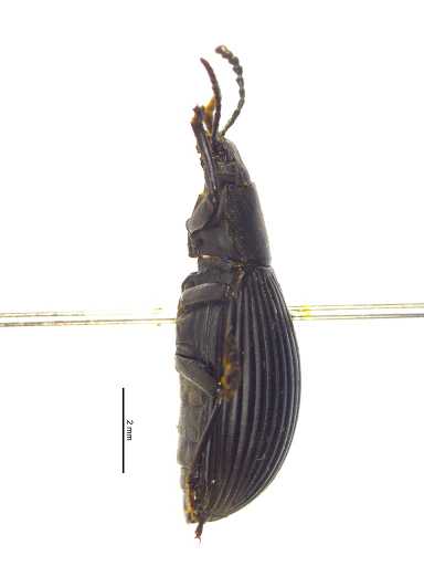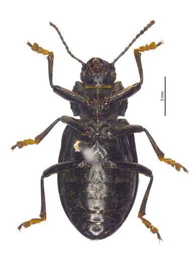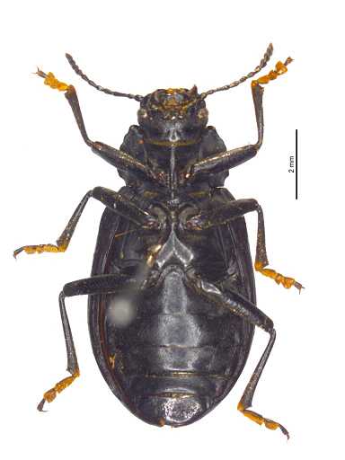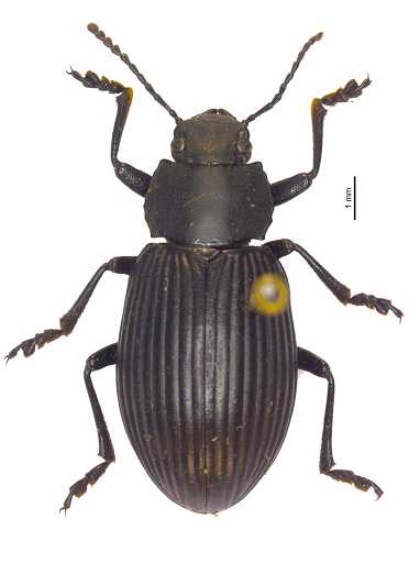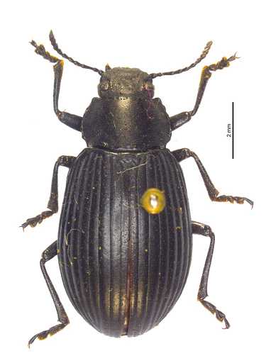 描述:鞘翅行间明显隆起,纵条很窄且明显eingeachinitten,刻点行的刻点很细以至于几乎消失或行上没有蔓延,底暗淡。前胸背板圆盘形,相当扁平,暗淡,中部有稀疏的、向两侧皱纹状逐渐消失的刻点。前缘近于直,几乎不弯曲,有光泽的饰边围绕,侧缘弯曲,波浪状,后角略突出,直角形,前角微圆,近直角形。前胸腹板几乎直,基节突后部长直角形突出。中胸深V字形凹。