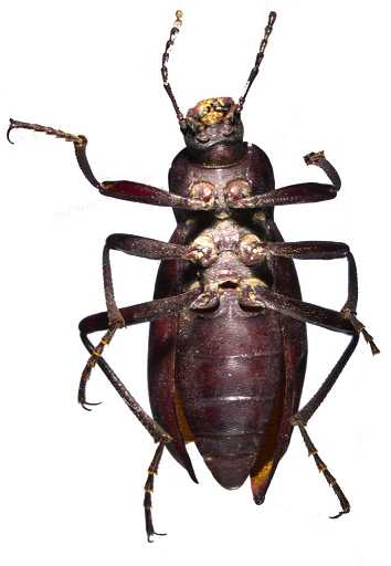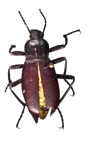 描述:体扁长,棕黑色无光泽。上唇前缘略弯,密布棕色刚毛;颏前后缘平直,两侧突出,有稠密的皱纹状刻点;唇基前缘凹陷;额脊强烈隆起;头顶扁平,有稠密的圆刻点。触角第2-11节长(宽)比为:2.5(2.5): 19(3): 6(2.5): 6(2.5): 5(2): 6(3): 4.5(3): 5(3): 5(2.5): 6(3),第2节粗短,第3节是第4节的2.3倍,第3-7节圆柱形,末节尖卵形,端部4节端半部有密毛和少量长毛。前胸背板近于方形,宽为长的1.35倍,前缘、最宽处、基部之比为:31: 50: 40,有稠密的深圆刻点,中部之前有2个压迹;前缘略凹无饰边;侧缘中部之前圆形,向后收缩,后角之前有弯曲,饰边完整;基部近于平直,饰边粗;前角钝圆,后角较尖。前胸侧板有纵纹和小粒点;前胸腹突中沟深,垂直下折部分的端部倾斜地伸出前胸后缘,端部有毛。中后胸较光滑。小盾片三角形,密被长毛。鞘翅长卵形,扁平,有细纹和粗刻点;基部较前胸背板基部宽;侧缘饰边完整,由背面仅可见其肩部与后部;翅坡处急剧降落;♂性翅尾短小,♀性无;假缘折窄,有细锉纹和小粒点。足细长,前足腿节较粗,端部收缩明显,胫节下侧粗糙形成齿状附属物,端部向内弯曲;中、后足胫节粗糙有稠密刺毛和小粒突,端部喇叭口形;后足第1跗节不对称,长于第2+3节。腹部无光泽,♂性第1腹节中部横纹不明显,无刚毛刷,基部3节有小皱纹,端部2节有稠密圆刻点,肛节后部扁凹。阳茎基板为基侧突的1.8倍,基侧突细而尖削,长为宽2.5倍;♀性端生殖刺突两侧弯曲,顶较钝。 体长:♂22mm,♀27mm;宽:♂8.0mm,♀11mm。