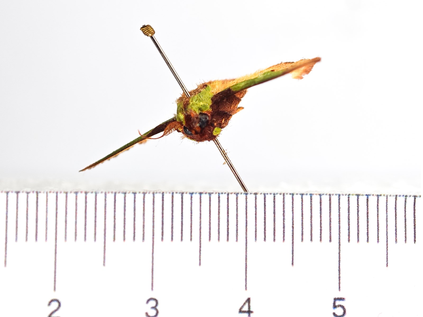 描述:翅展29-39毫米。头和胸背绿色,中央有一褐色纵纹向后延伸至腹背;腹部黄褐色;前翅绿色,基斑紫褐色,尖刀形,从中室向上约伸占前缘的l/4,外缘带宽,从前缘向后渐宽,灰红褐色,其内缘弧形外曲;后翅内半部黄稍带褐色,外半部褐色渐浓。幼虫粉绿色,背面稍白色,背中央有三条紫或暗绿色带,在亚背区和亚侧区上各有一列带短刺的瘤,前面和后面的瘤尖红色。