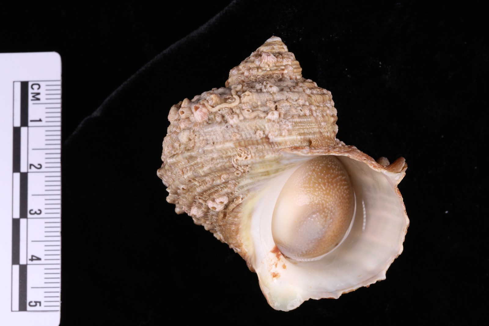 形态特征 壳体中型1),圆锥形,壳高54mm,壳宽53mm,壳质坚厚,周缘隆圆。壳体灰褐色。螺层6层,壳顶圆突,螺层粗肋与细肋相间,均由细薄鳞片组成,粗肋上长出一些中空的棘突,棘突环行排列,在螺旋部最大螺层中部和偏上方大多为2行,一般前者大,后者小在体螺层中部和偏下方大多为2行,一般前者较大,后者较小。多数个体棘突朝上,少数个体棘突偏左向在我所采到的12号57个标本中,棘突有较长、较短和中长型,较长型为较短型的5、6倍,为中长型的2、3倍。我所的标本中,以中长型居多,著者1960年6月在浙北外侧的青洪岛一一盐度较高海域采到的大个体角蝾螺(壳高98mm,壳宽95mm),其棘突即为中长型。由于只是面上采集,标签记录极为简略,我们从标本鉴察中,还看不出“生活于浪大高盐外海的角蝾螺为长棘型或有棘型,生活于波静低盐内海的角蝾螺为短棘型或无棘型”(吉良,1954大岛等,1965)。角蝾螺的底面隆突,肋条变粗,中央者更粗,结构与壳面同,但未生棘突。螺轴平滑,轴唇向下略伸,形成半圆头突起外唇有缺刻,内壁光滑,有虹彩亮泽。脐部为宽厚的内12缘覆盖,无脐孔。厣略呈椭圆形,浅黄色,厚重坚实,内凹面少旋,外凸面具一螺旋,密生许多大小不均的圆头短柄突起。
