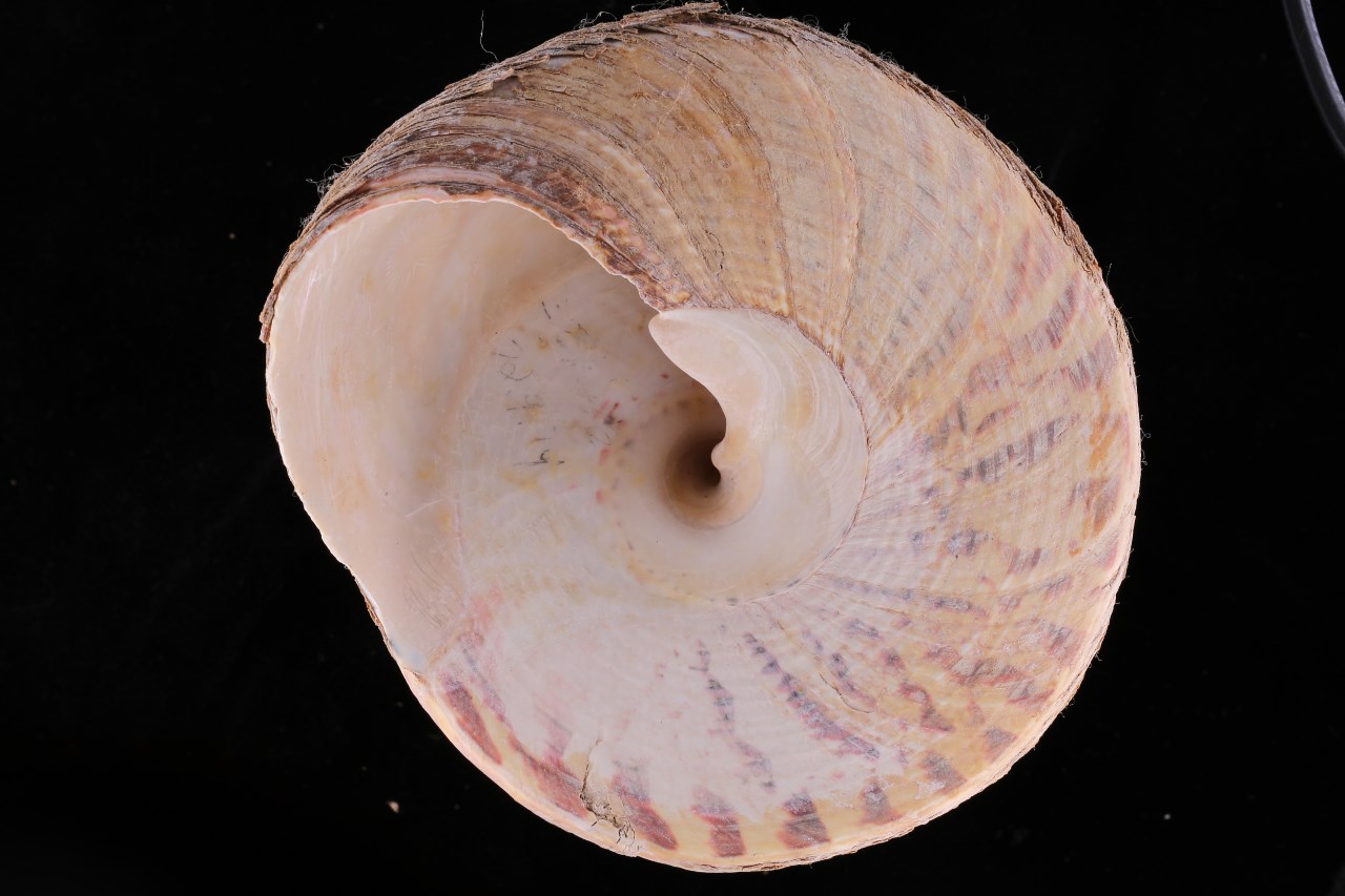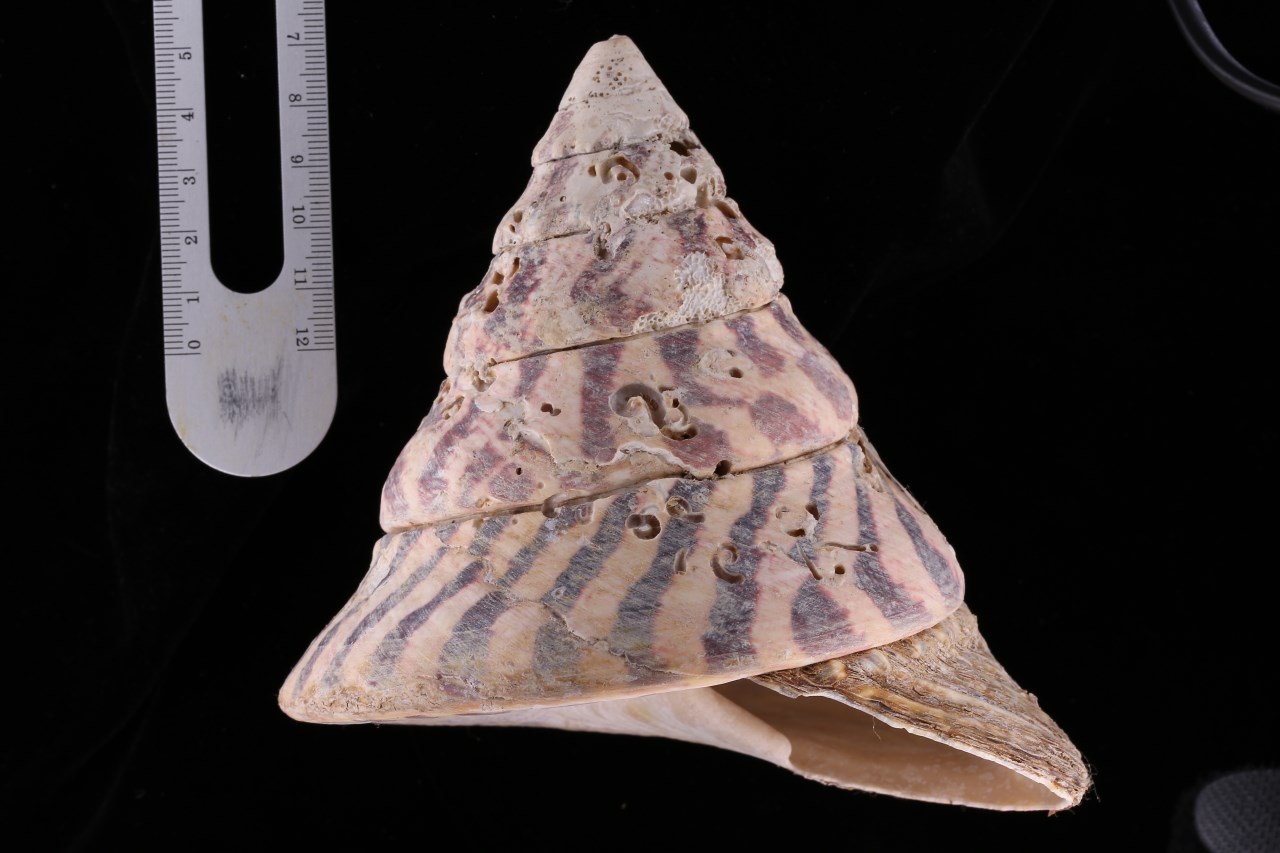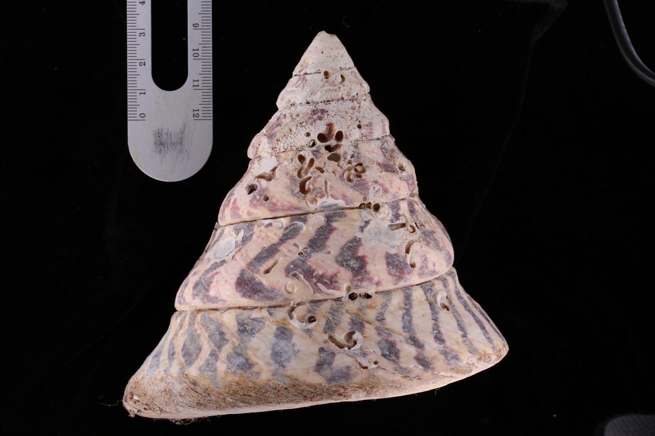 形态特征 壳体大型,正圆锥形,壳高100mm,壳宽100mm,壳质十分坚厚,体螺层壳周稍膨胀。壳面乳白、浅粉红或黄褐色,具明显暗红、粉红或褐紫色条斑,条斑呈放射状,纵向分布,愈向下愈粗,一直延伸到底面。螺层8、9层,螺面有细环肋与右斜螺纹交叉。螺旋部上方缝合线处生有一些短粗中空的棘状突起,但不很显著在小个体,中空粗棘明显突出,并遍布于整个螺旋部缝合线处,同时,小个体螺层与螺层间螺肋较粗,多由颗粒肋组成。底面较平,同心环肋光滑,有细螺纹交叉,大个体肋细不显,小个体肋粗突出。内唇和轴唇甚厚实,两者微隆,中间凹入,内外缘珍珠质层厚,虹彩光泽强外唇较薄,平滑,内壁光滑有亮泽,内侧平滑。脐部滑层发达,覆盖大半脐部,上部漏斗状,形成假脐。厣(口盖)圆形,薄而轻,黄褐色,为多旋型,核居中央。