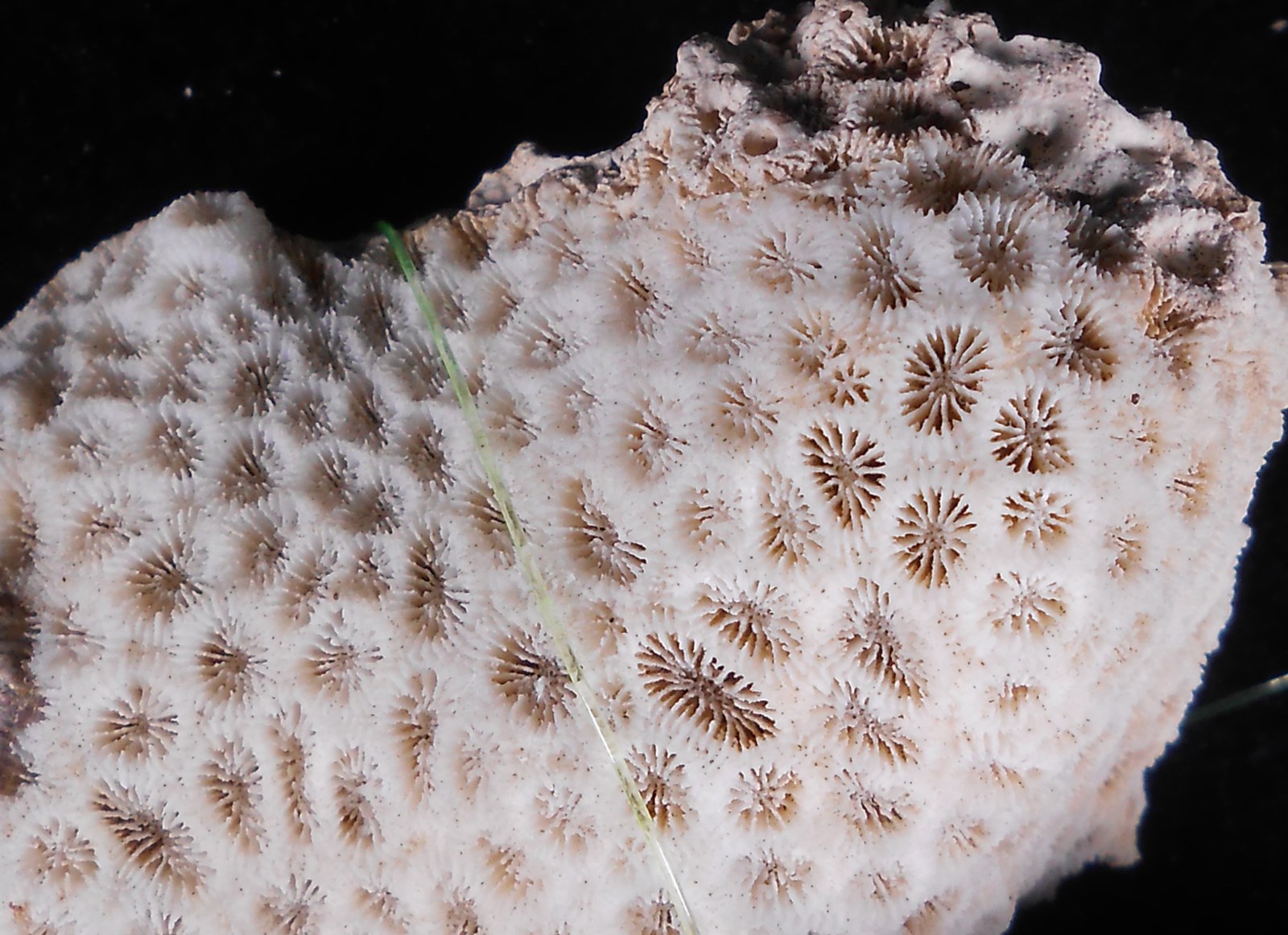 特征:珊瑚骼随附着基的形状生长成畸形块状。珊瑚杯多边形,大小悬殊甚大,直径2一lOmm,小杯中第Ⅰ、Ⅱ轮隔片与轴柱相连,大杯中有五轮隔片,第Ⅰ、Ⅱ、Ⅲ 轮隔片与轴柱相连,其中第1轮隔片大而厚,特别显著,大小隔片相间排列。隔片边缘有齿,两侧有颗粒。轴柱上有短棒状乳突。相邻二珊瑚杯的珊瑚肋不连,有漕相隔。杯壁薄,不超过lmm。