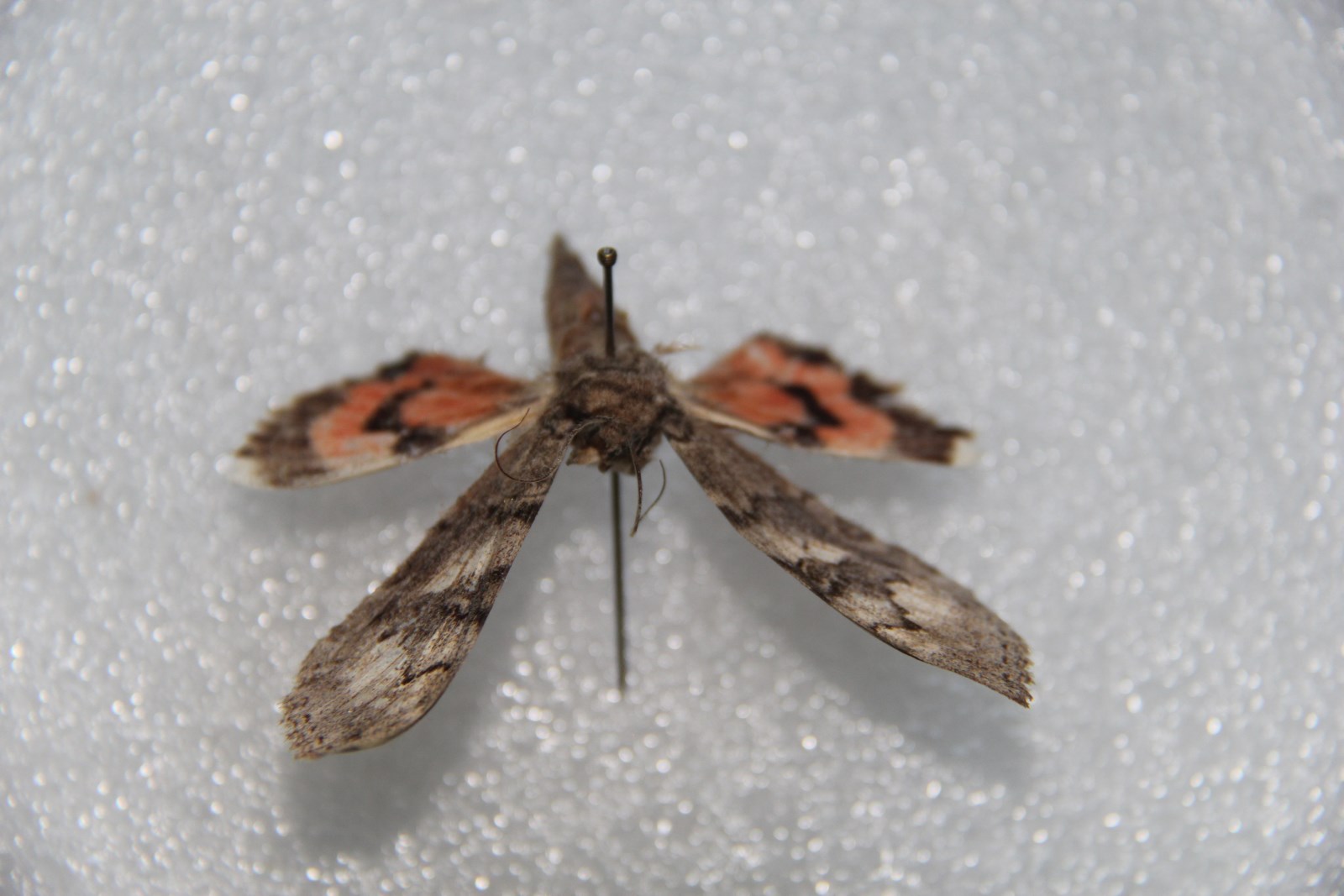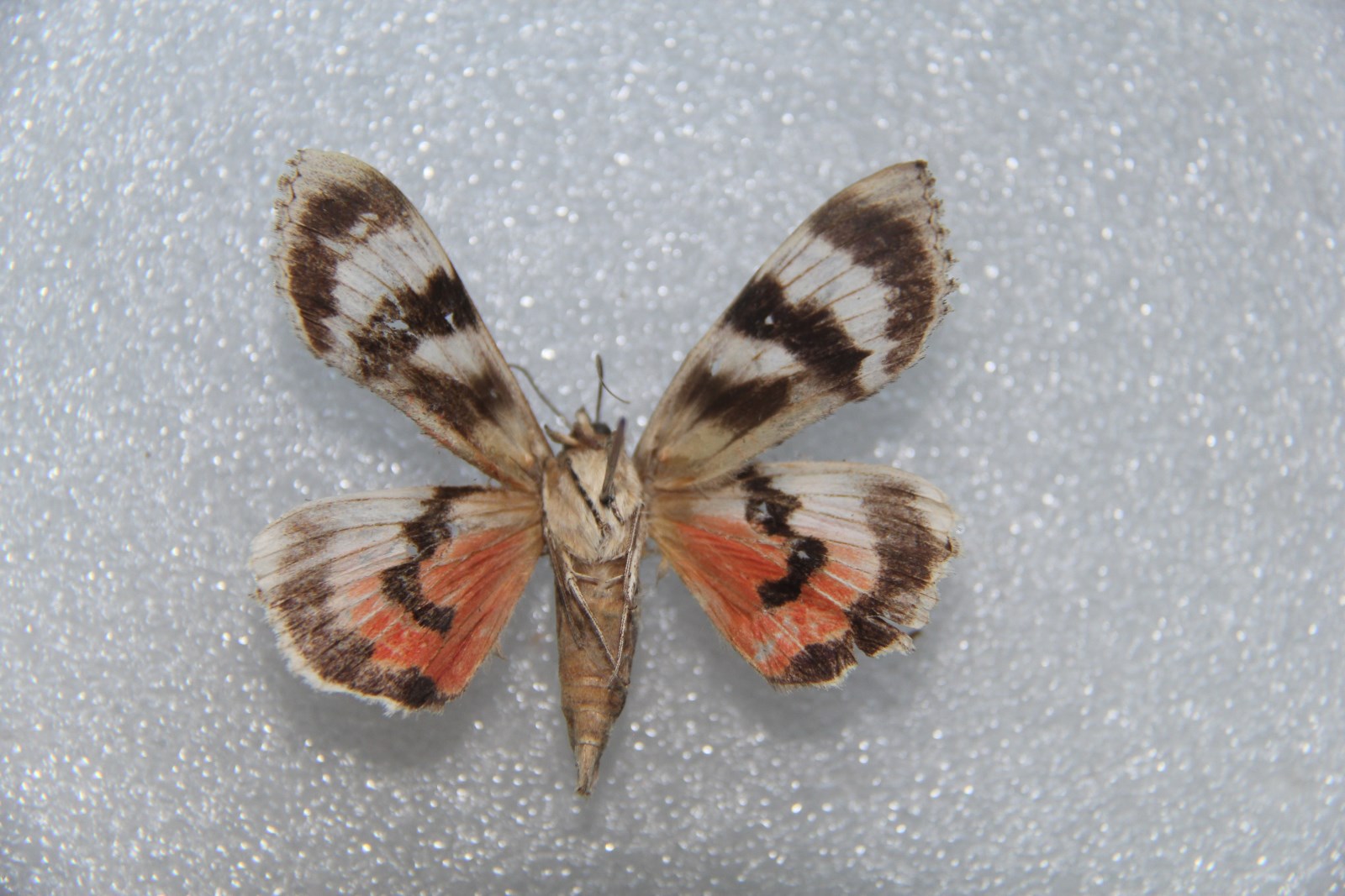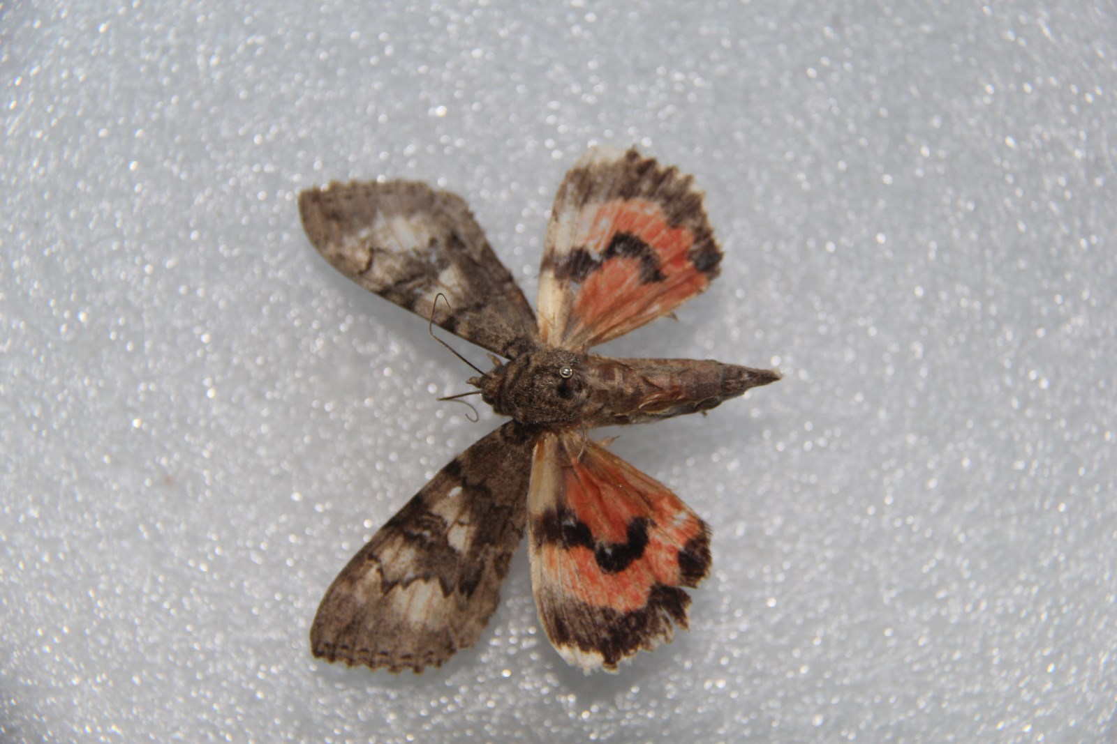 描述:翅展67-71mm。头、胸及前翅褐灰色,额、颈板、翅基片有黑纹,前翅亚中褶基部一黑纹,基、内线黑色,,后者锯齿形,肾纹内缘黑色,外缘锯齿形,中有褐环,前方一黑褐纹,外线黑色锯齿形,在2脉处内突至肾纹后,亚端线灰白色锯齿形,端线由黑色衬白的点组成后翅红色,中带黑色弯曲,端带黑色腹部灰褐色。雄蛾抱器瓣背缘近中部拱起,右瓣端尖,左瓣背端一指形突(图601)。