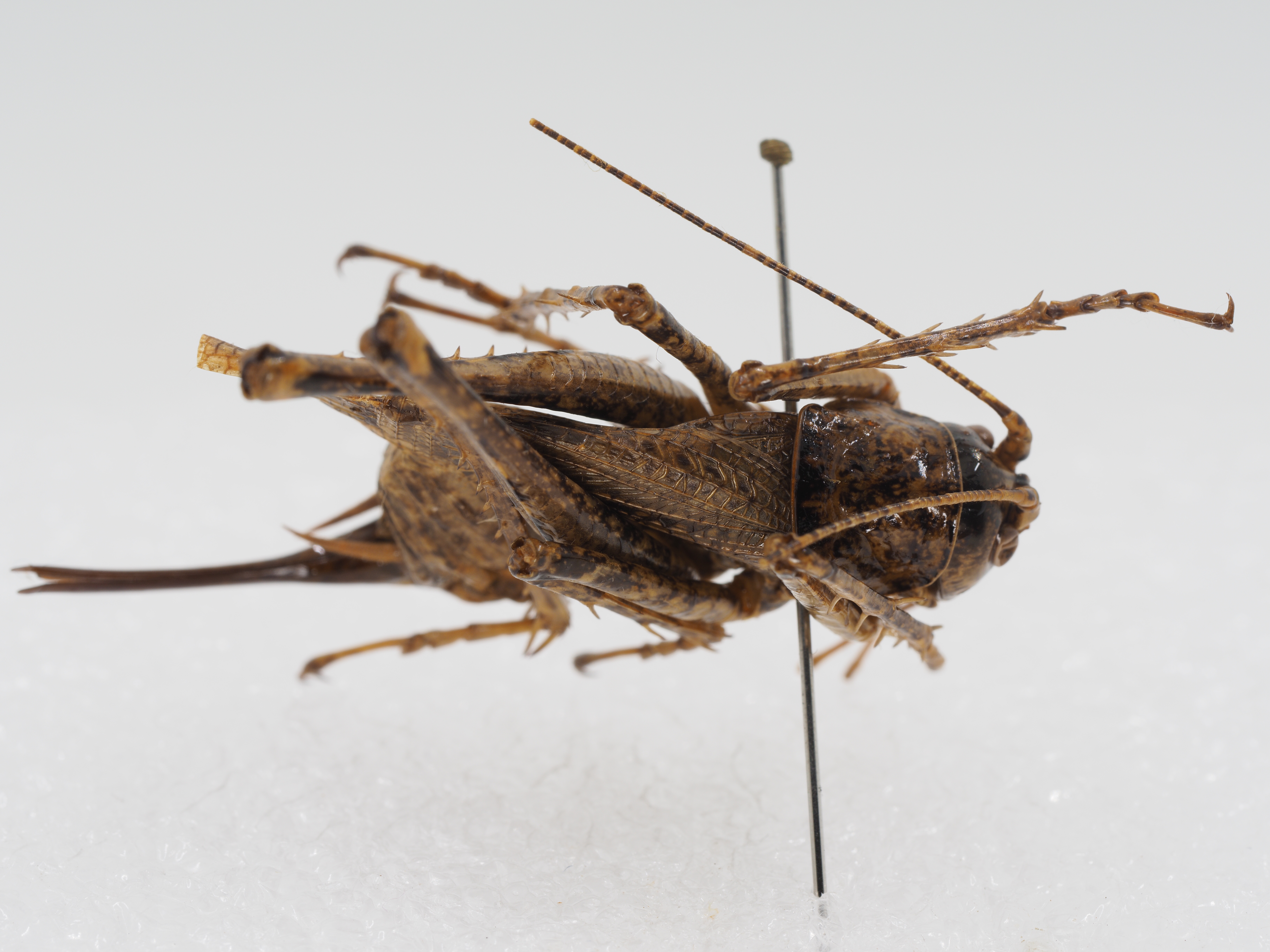 描述:Description. Male: Body medium size. Pronotum shouldered. Prosternum with 1 pair of slender, long spines. Meso- and metasterna lobate, the lobes of metasternum triangular with apex pointed. Tegmina and wings well developed. Tegmina exceeding apex of hind femur, hind wings nearly equal to tegmina. Fore coxa with 1 spine, interno-ventral margin of fore femur with 2 spines, but externo-ventral margin without spine, knee lobe with 1 spine, fore tibia with 2 internal spines and 1 external spine above, with 5 pairs of spines below, tympanal organ open. Middle femur unarmed below, middle tibia with 4 external and 3 internal spines above, with 5 pairs of spines below. Both ventral margins of hind femur with 3–4 spines, hind tibia with 9–10 spines each margin above. Hind margin of ninth abdominal tergite with 1 pair of processes, wrinkled above. Tenth abdominal tergite with 1 pair of hooks upcurved. Epiproct roundly triangular, paraproct tapering apically, slightly exceeding hind margin of subgenital plate, with apex acute and strongly diverged. Cerci thin and long, distinctly longer than subgenital plate. Lateral margin of subgenital plate parallel in apical half, hind margin of subgenital plate truncate. Female: Body roughly similar to that of male. Subgenital plate protractedly triangular with pointed apex (Fig. 24). Ovipositor upcurved in apical half, with apex obtuse. Coloration. Body dark grayish brown, with pale yellowish spots. Antennae dark brown, with light rings. Legs light brown, with darkish stripes, hind femur with an interrupted longitudinal blackish stripe in outer side. Fore wings brown, transparent, with dark stripes. Cerci lightish brown.