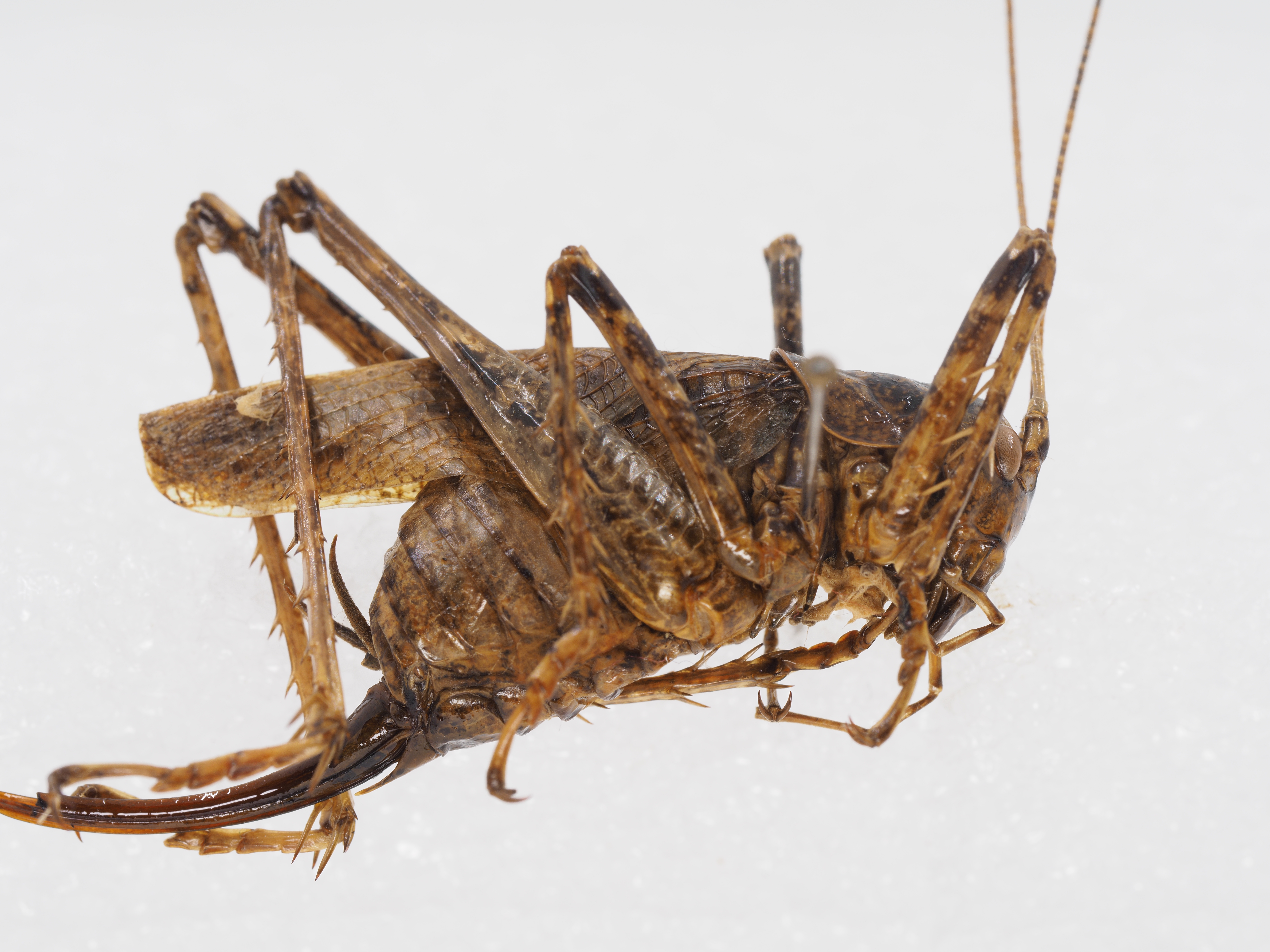 描述:Description. Male: Body medium size. Pronotum shouldered. Prosternum with 1 pair of slender, long spines. Meso- and metasterna lobate, the lobes of metasternum triangular with apex pointed. Tegmina and wings well developed. Tegmina exceeding apex of hind femur, hind wings nearly equal to tegmina. Fore coxa with 1 spine, interno-ventral margin of fore femur with 2 spines, but externo-ventral margin without spine, knee lobe with 1 spine, fore tibia with 2 internal spines and 1 external spine above, with 5 pairs of spines below, tympanal organ open. Middle femur unarmed below, middle tibia with 4 external and 3 internal spines above, with 5 pairs of spines below. Both ventral margins of hind femur with 3–4 spines, hind tibia with 9–10 spines each margin above. Hind margin of ninth abdominal tergite with 1 pair of processes, wrinkled above. Tenth abdominal tergite with 1 pair of hooks upcurved. Epiproct roundly triangular, paraproct tapering apically, slightly exceeding hind margin of subgenital plate, with apex acute and strongly diverged. Cerci thin and long, distinctly longer than subgenital plate. Lateral margin of subgenital plate parallel in apical half, hind margin of subgenital plate truncate. Female: Body roughly similar to that of male. Subgenital plate protractedly triangular with pointed apex (Fig. 24). Ovipositor upcurved in apical half, with apex obtuse. Coloration. Body dark grayish brown, with pale yellowish spots. Antennae dark brown, with light rings. Legs light brown, with darkish stripes, hind femur with an interrupted longitudinal blackish stripe in outer side. Fore wings brown, transparent, with dark stripes. Cerci lightish brown.