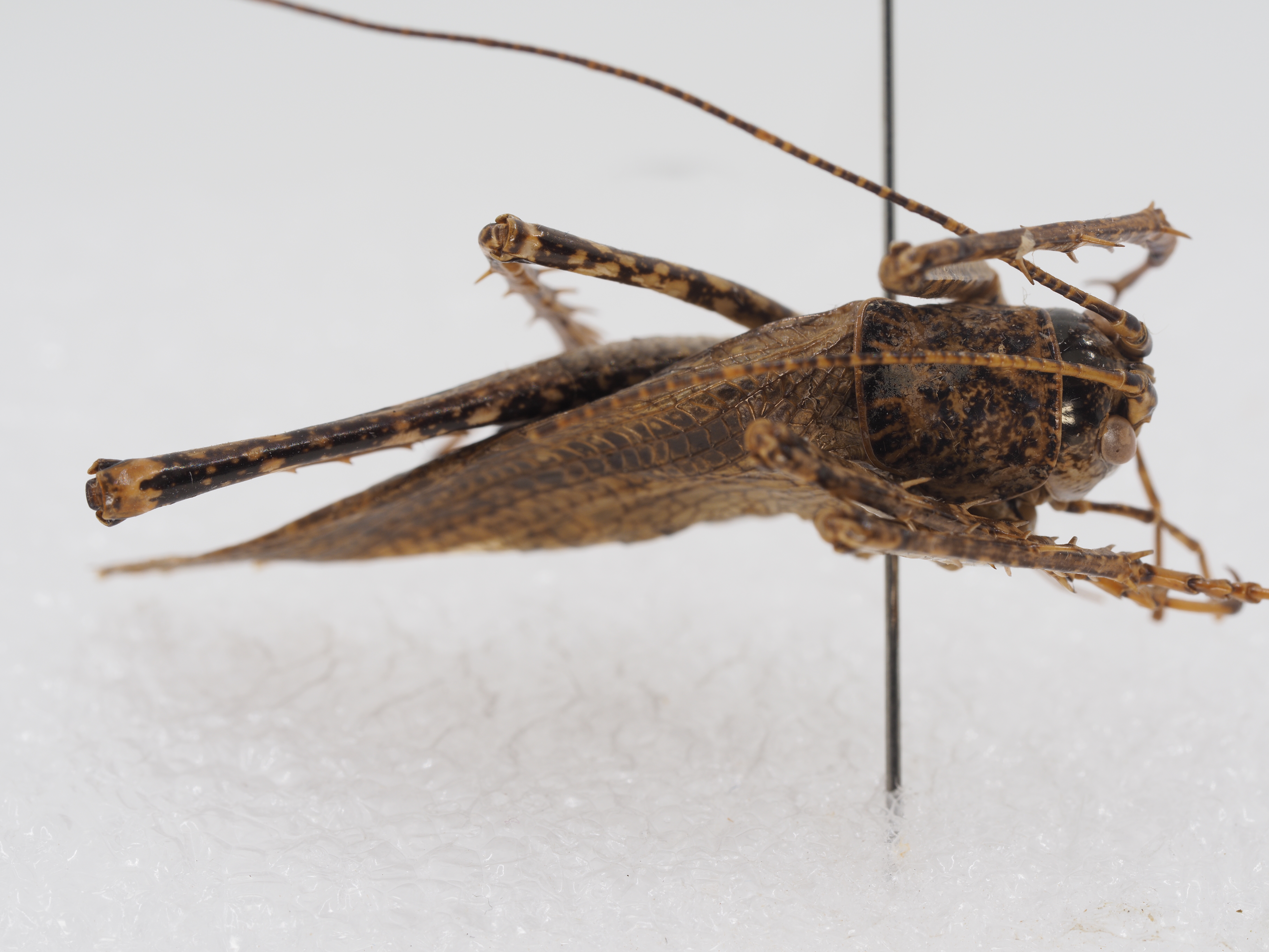 描述:Description. Male: Body medium size. Pronotum shouldered. Prosternum with 1 pair of slender, long spines. Meso- and metasterna lobate, the lobes of metasternum triangular with apex pointed. Tegmina and wings well developed. Tegmina exceeding apex of hind femur, hind wings nearly equal to tegmina. Fore coxa with 1 spine, interno-ventral margin of fore femur with 2 spines, but externo-ventral margin without spine, knee lobe with 1 spine, fore tibia with 2 internal spines and 1 external spine above, with 5 pairs of spines below, tympanal organ open. Middle femur unarmed below, middle tibia with 4 external and 3 internal spines above, with 5 pairs of spines below. Both ventral margins of hind femur with 3–4 spines, hind tibia with 9–10 spines each margin above. Hind margin of ninth abdominal tergite with 1 pair of processes, wrinkled above. Tenth abdominal tergite with 1 pair of hooks upcurved. Epiproct roundly triangular, paraproct tapering apically, slightly exceeding hind margin of subgenital plate, with apex acute and strongly diverged. Cerci thin and long, distinctly longer than subgenital plate. Lateral margin of subgenital plate parallel in apical half, hind margin of subgenital plate truncate. Female: Body roughly similar to that of male. Subgenital plate protractedly triangular with pointed apex (Fig. 24). Ovipositor upcurved in apical half, with apex obtuse. Coloration. Body dark grayish brown, with pale yellowish spots. Antennae dark brown, with light rings. Legs light brown, with darkish stripes, hind femur with an interrupted longitudinal blackish stripe in outer side. Fore wings brown, transparent, with dark stripes. Cerci lightish brown.