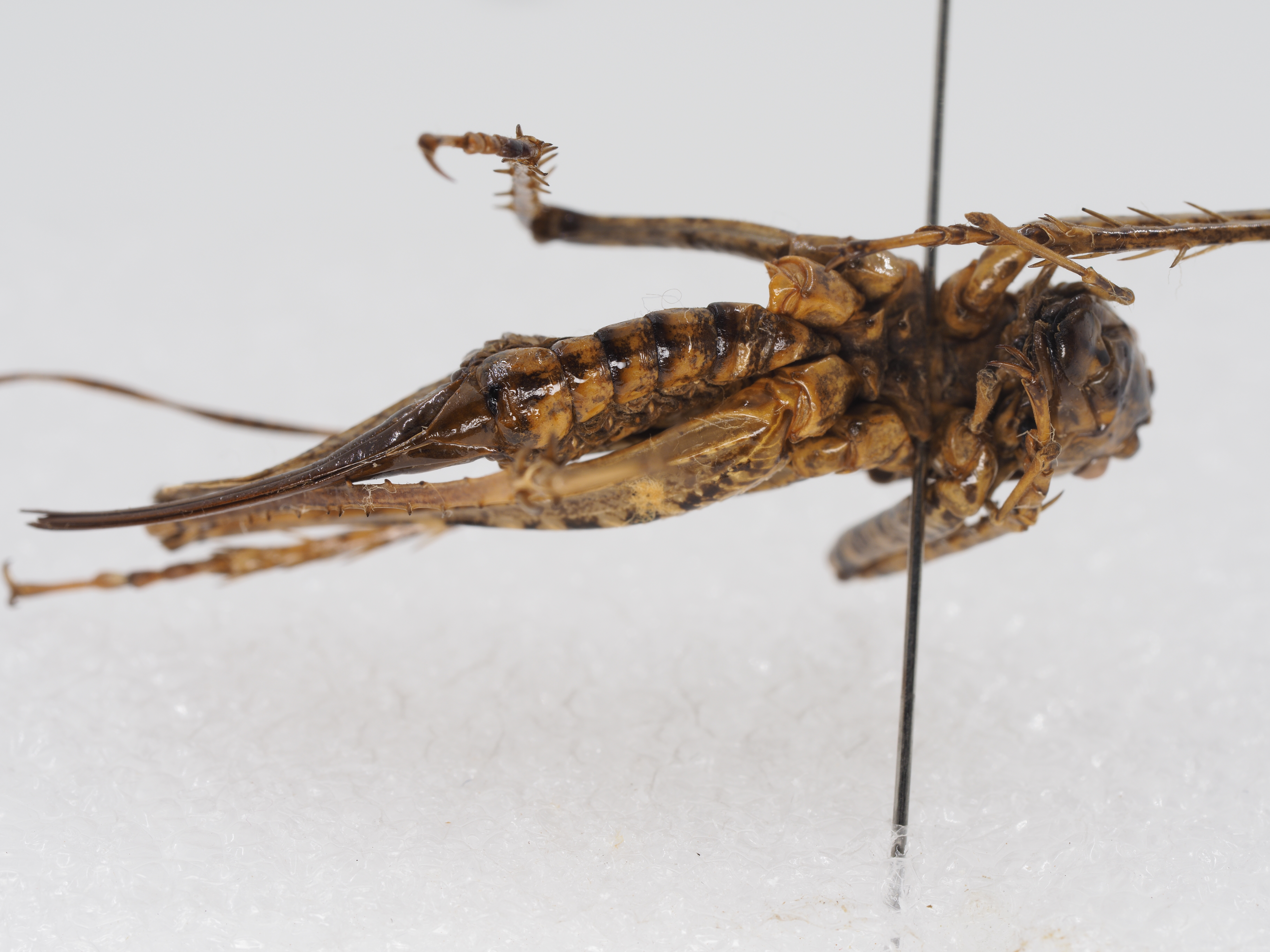 描述:Description. Male: Body medium size. Pronotum shouldered. Prosternum with 1 pair of slender, long spines. Meso- and metasterna lobate, the lobes of metasternum triangular with apex pointed. Tegmina and wings well developed. Tegmina exceeding apex of hind femur, hind wings nearly equal to tegmina. Fore coxa with 1 spine, interno-ventral margin of fore femur with 2 spines, but externo-ventral margin without spine, knee lobe with 1 spine, fore tibia with 2 internal spines and 1 external spine above, with 5 pairs of spines below, tympanal organ open. Middle femur unarmed below, middle tibia with 4 external and 3 internal spines above, with 5 pairs of spines below. Both ventral margins of hind femur with 3–4 spines, hind tibia with 9–10 spines each margin above. Hind margin of ninth abdominal tergite with 1 pair of processes, wrinkled above. Tenth abdominal tergite with 1 pair of hooks upcurved. Epiproct roundly triangular, paraproct tapering apically, slightly exceeding hind margin of subgenital plate, with apex acute and strongly diverged. Cerci thin and long, distinctly longer than subgenital plate. Lateral margin of subgenital plate parallel in apical half, hind margin of subgenital plate truncate. Female: Body roughly similar to that of male. Subgenital plate protractedly triangular with pointed apex (Fig. 24). Ovipositor upcurved in apical half, with apex obtuse. Coloration. Body dark grayish brown, with pale yellowish spots. Antennae dark brown, with light rings. Legs light brown, with darkish stripes, hind femur with an interrupted longitudinal blackish stripe in outer side. Fore wings brown, transparent, with dark stripes. Cerci lightish brown.