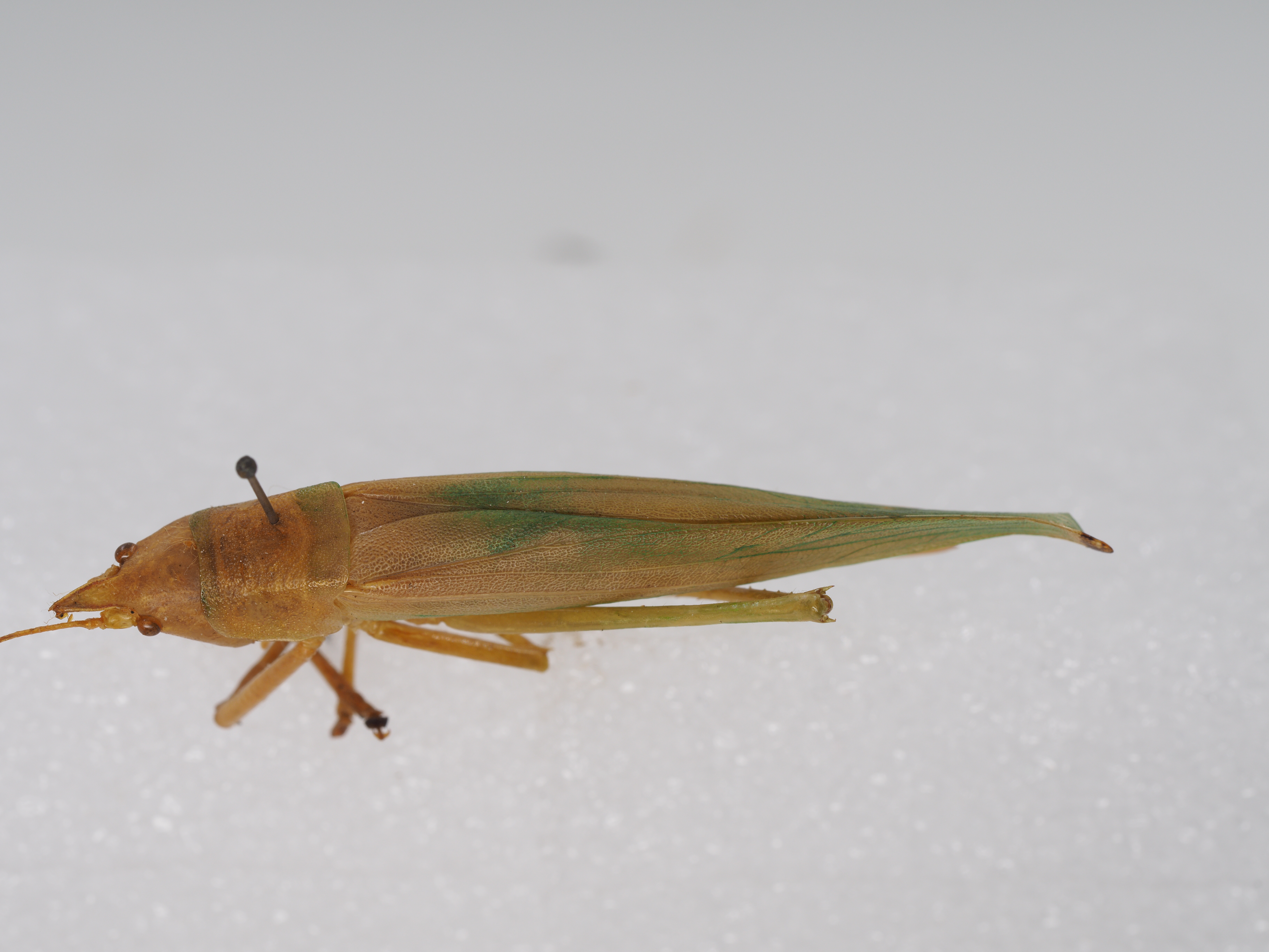 描述:雄性体形中等,匀称。头部和胸部具较明显的刻点。头顶呈三棱形,较狭,其最宽处为触角第1节宽的2倍,背面略凹陷,侧缘整体略带弯弧; 腹面具中隆线,其长度约为复眼纵径3 倍,基部呈齿状突出; 颜面强向后倾斜,颜顶角不突出。复眼较小,圆形,突出。前胸背板前缘微凹,后缘平直; 侧片下缘略弯曲,后缘肩凹较浅。前胸腹板具1对刺状突起,中胸腹板叶三角形,后胸腹板叶近圆形。前翅远超过后足股节端部,端缘较狭尖; Rs 脉从R脉中部之前分出,近端部具2 分枝,左前翅音锉较细而弱,约具126个音齿。后翅不长于前翅。前足基节具刺。前足股节腹面内缘具1-4个小刺,外缘无刺。中足股节腹面内缘无刺,外缘具3-4个刺。后足股节腹面内缘具6-7个刺,外缘具7-9个刺;后足胫节背面内、外侧各具12-15个刺。第10腹节背板后缘内凹,裂叶端部较钝; 尾须较厚实,侧扁,端部具1个小刺,基部内侧具1个向上弯曲的突起。下生殖板较宽大,后缘显凹,腹突较细长。雌性尾须较短而细,圆锥形。下生殖板近三角形,端部具浅凹口。产卵瓣短于后足股节,略向上弯曲,边缘光滑。全体绿色。复眼淡褐色,头顶侧缘和触角淡黄褐色,前翅前缘具黄白色的边。