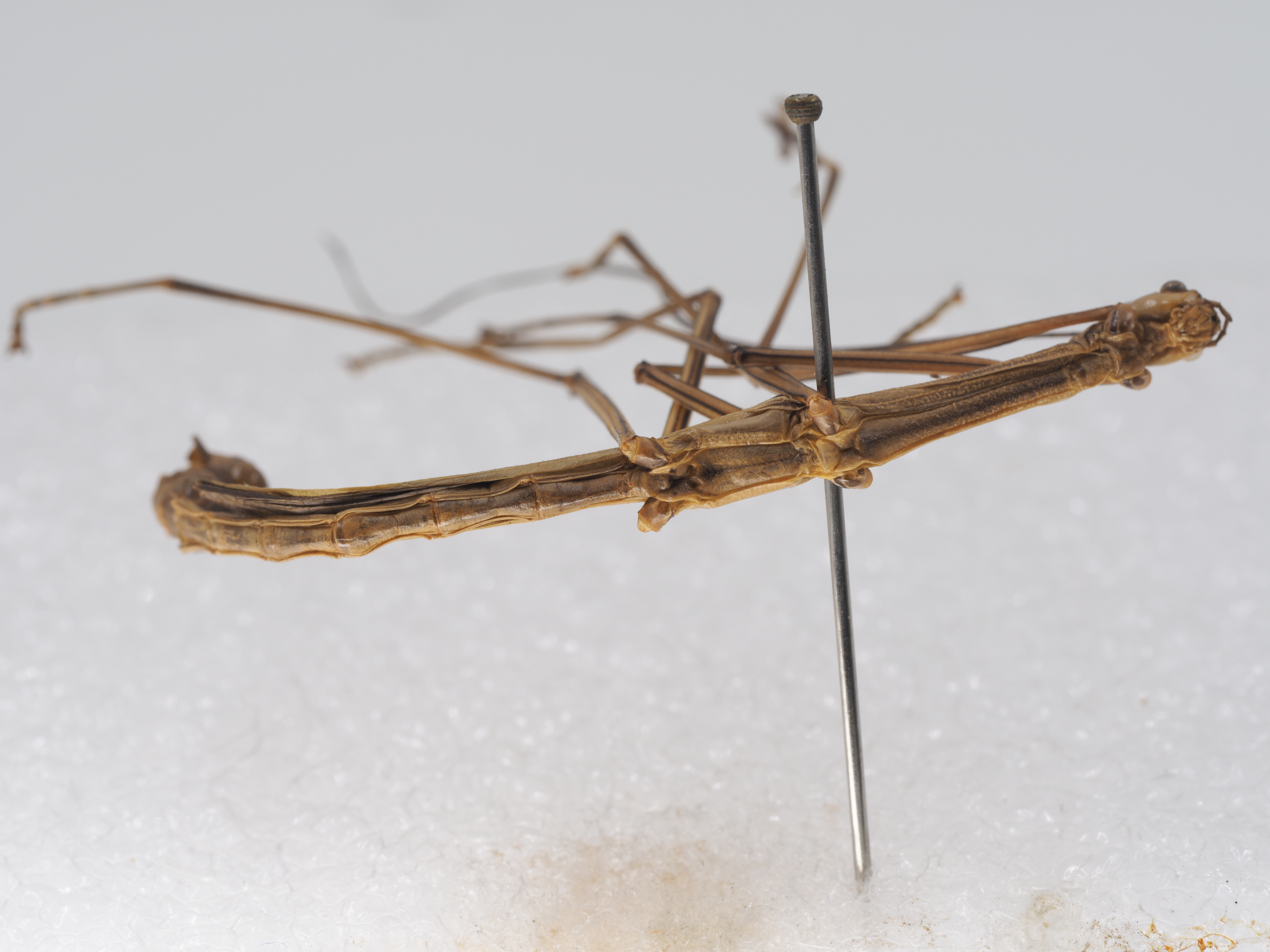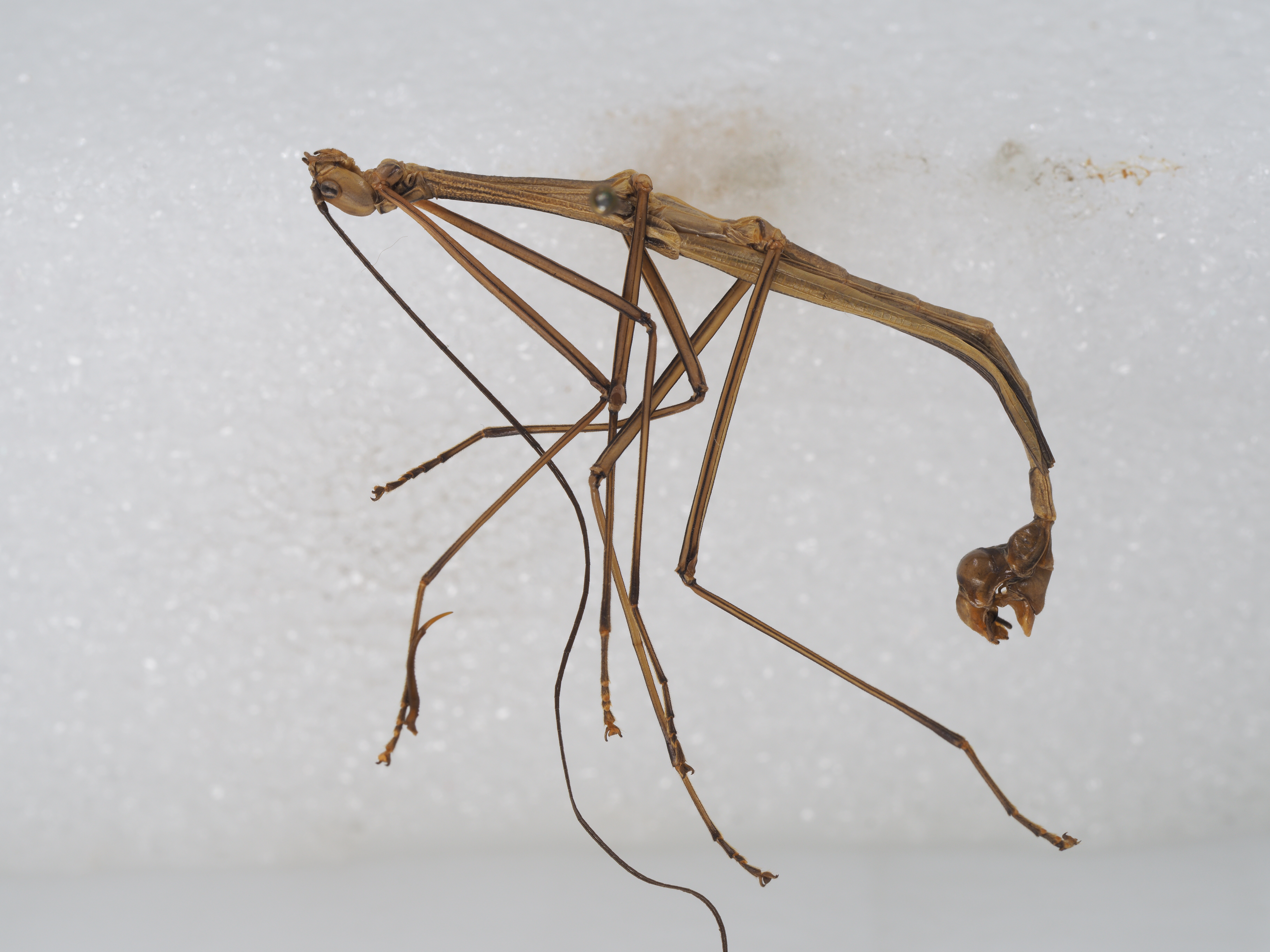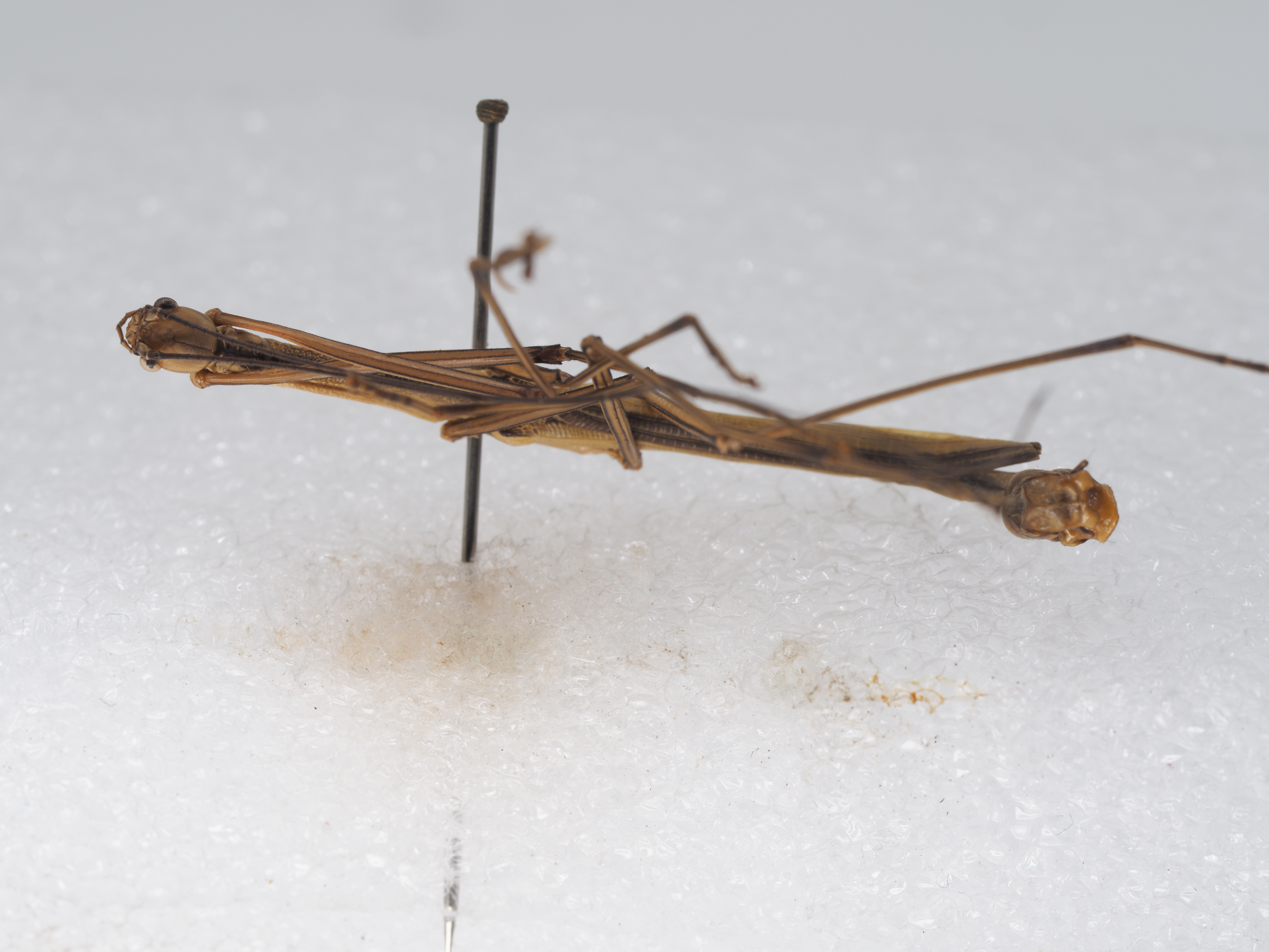 描述:Male (Figs. 1–3). Body slender and elongate. General colouration of body, legs, tegmina and costal region of alae brown. Smaller and more slender than the female. Head: Brown, slightly darker along the median furrow. Oval, longer than wide, smooth. Vertex flat, with two small oval depressions between the bases of antennae. Occiput slightly convex. Median and lateral furrows indistinct. Eyes small, oval and protruding, brown, with a black transverse stripe. Antennae brown dorsally and dark brown ventrally, exceeding the end of anal segment; the first segment cylindrical, constricted at base, 2 x length of second segment. Thorax: Brown as body, with granulations. Pronotum with three blackish longitudinal stripes, covered with very few granules, rectangular, shorter than head, anterior margin curved inward, posterior margin rounded, longitudinal sulcus and transverse sulcus crossing before middle. Mesonotum with a blackish medio-longitudinal band running from anterior margin to the hind margin, parallel-sided, 3.3 x length of pronotum, densely covered with irregular sizes of small granules, medially carinate, with two longitudinal carinae being closely laterad of the lateral margins. Mesopleurum less granulated than mesonotum, with a lateral carina. Mesosternum granulated, less distinct near posterior, with a thin dark brown longitudinal stripe. Metapleurum and metasternum indistinctly granulated. Abdomen: Slender, brown, lacking granulation. Second to sixth tergites parallel-sided. Seventh tergum and eighth tergum expanded posteriorly. Ninth tergum strongly convex medially, as long as anal segment, deeply curved inward at hind margin, postero-lateral angles broadened and rounded. Anal segment longer than eighth tergum, decurved downward vertically, with a rounded depression medially, median carina indistinct, hind margin broadly emarginated, lateral angles square-shaped. Poculum strongly convex, goose-bill shaped in lateral view, almost reaching end of anal segment. Cerci brown, cylindrical, straight, apices rounded, not exceeding postero-lateral angles of the anal segment. Legs: Very elongate. Brown as body, with dark brown stripe along all carinae of femora and tibiae. All tibiae and tarsi dark brown at the apex. Dorsal and ventral carinae of all femora and tibiae smooth, lacking armature. Profemora curved basally, longer than mesothorax. Mesofemora almost as long as mesotibiae. Metafemora slightly shorter than metatibiae. Wings: Tegmina brown at anterior region, dark brown at posterior region, oval, rounded posteriorly, shorter than pronotum, elevated angle blunt and black, with a white longitudinal stripe being laterad of the black elevation. Alae long, reaching end of sixth tergum, costal region brown, posterior margin with a dark brown longitudinal band.