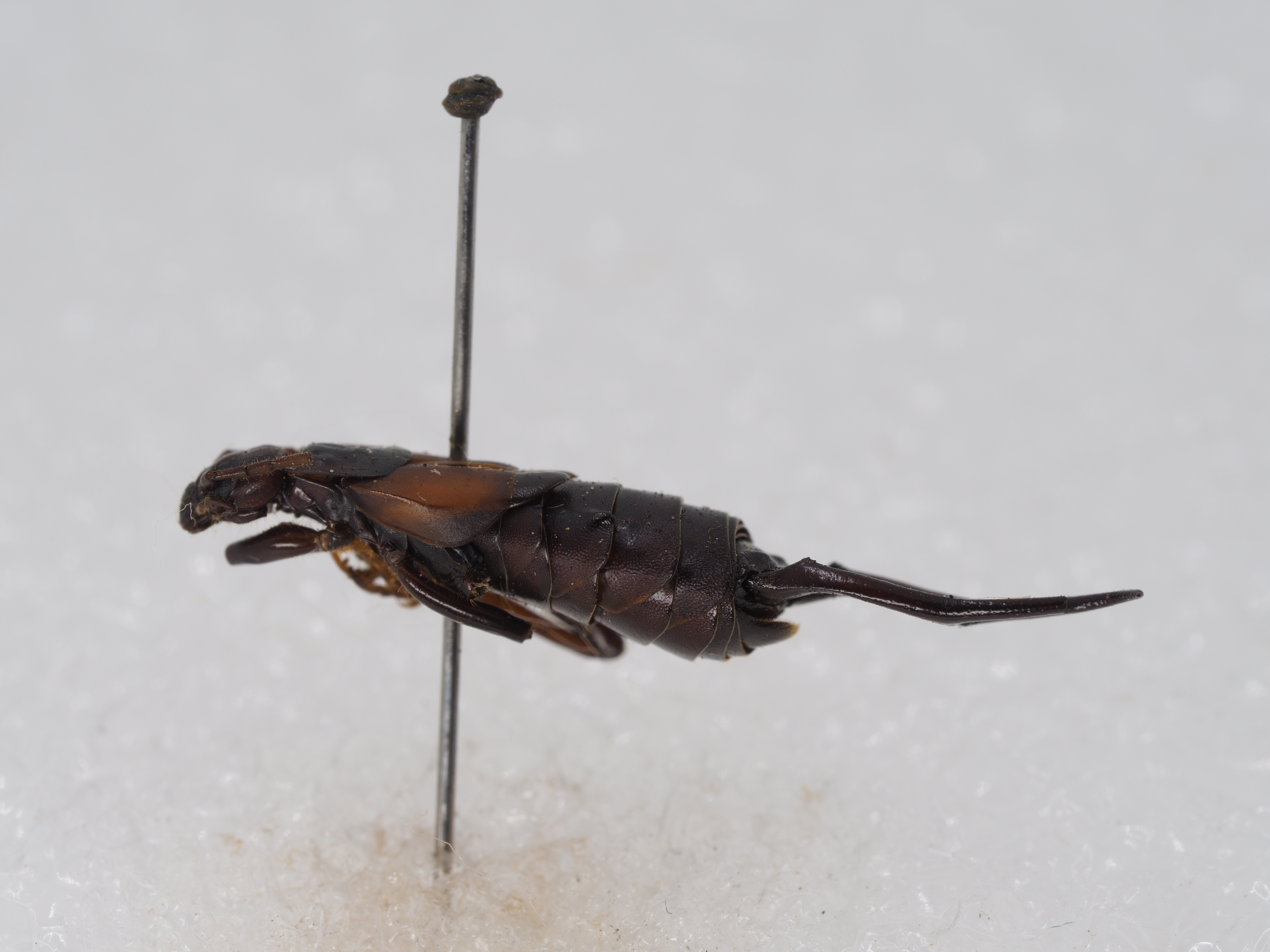 描述:Male: Head little narrower than pronotum, with distinct sutures: antennae with 9+? segments, first segment stout, clubbed, not longer than the interspace between scrobes : third and fourth segments subequal in length. Pronotum transverse, anterior margin tr~ncate, the anterior angles obtuse, posterior ma.rgin broadly rounded, lateral margins parallel: prozona feebly tumid, with very fine longitudinal median sulus. Elytra ample, with a strongly marked carina on the basal half of lateral margins; surface of elytra a1most smooth, with very indistinct and sparse punoturations. Wings longer than .the elytra. Legs long and slend~r. Abdomen depressed, widened about the middle; glandular collosities very distinct in the third and fourth abdominal tergites: the tenth abdominal tergite very short and wide, the lateral margins gradually divergented backwards. epiproct very short and .strongly transverse, with two mare or less distinct lateral spinulae. Forceps remote at the base, each branch armed with a cristaeform tooth on the dorsal surface of basal part, the inner lower margin with well developed sharp triangular tooth, and with feeble denticulation between this tooth and the basa of the forceps; in lateral view the protion beyond the basal tooth is concave. Female unknown. General coloration shining brownish-black. Elytra purplish-red.