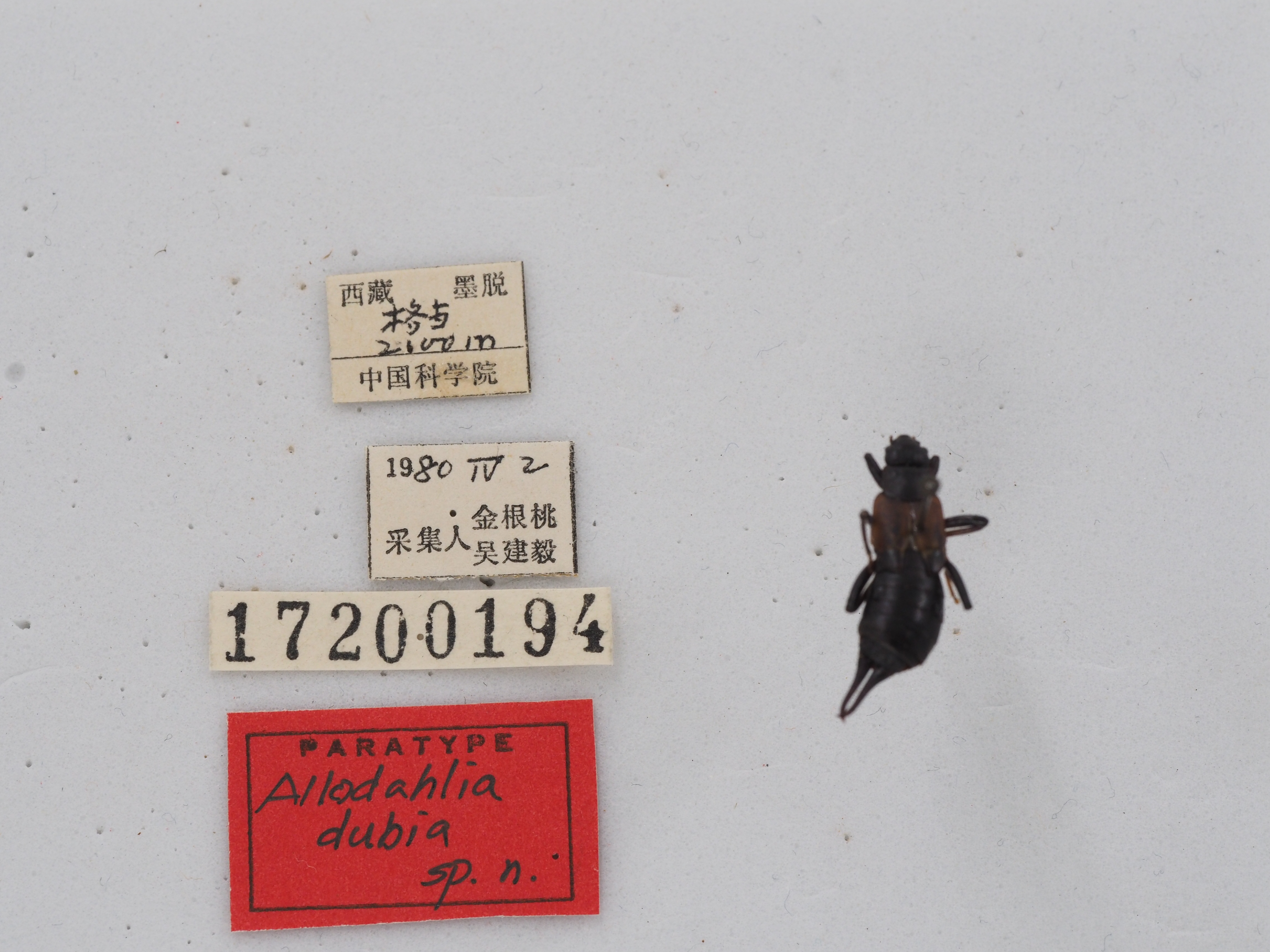 描述:Male: Head little narrower than pronotum, with distinct sutures: antennae with 9+? segments, first segment stout, clubbed, not longer than the interspace between scrobes : third and fourth segments subequal in length. Pronotum transverse, anterior margin tr~ncate, the anterior angles obtuse, posterior ma.rgin broadly rounded, lateral margins parallel: prozona feebly tumid, with very fine longitudinal median sulus. Elytra ample, with a strongly marked carina on the basal half of lateral margins; surface of elytra a1most smooth, with very indistinct and sparse punoturations. Wings longer than .the elytra. Legs long and slend~r. Abdomen depressed, widened about the middle; glandular collosities very distinct in the third and fourth abdominal tergites: the tenth abdominal tergite very short and wide, the lateral margins gradually divergented backwards. epiproct very short and .strongly transverse, with two mare or less distinct lateral spinulae. Forceps remote at the base, each branch armed with a cristaeform tooth on the dorsal surface of basal part, the inner lower margin with well developed sharp triangular tooth, and with feeble denticulation between this tooth and the basa of the forceps; in lateral view the protion beyond the basal tooth is concave. Female unknown. General coloration shining brownish-black. Elytra purplish-red.