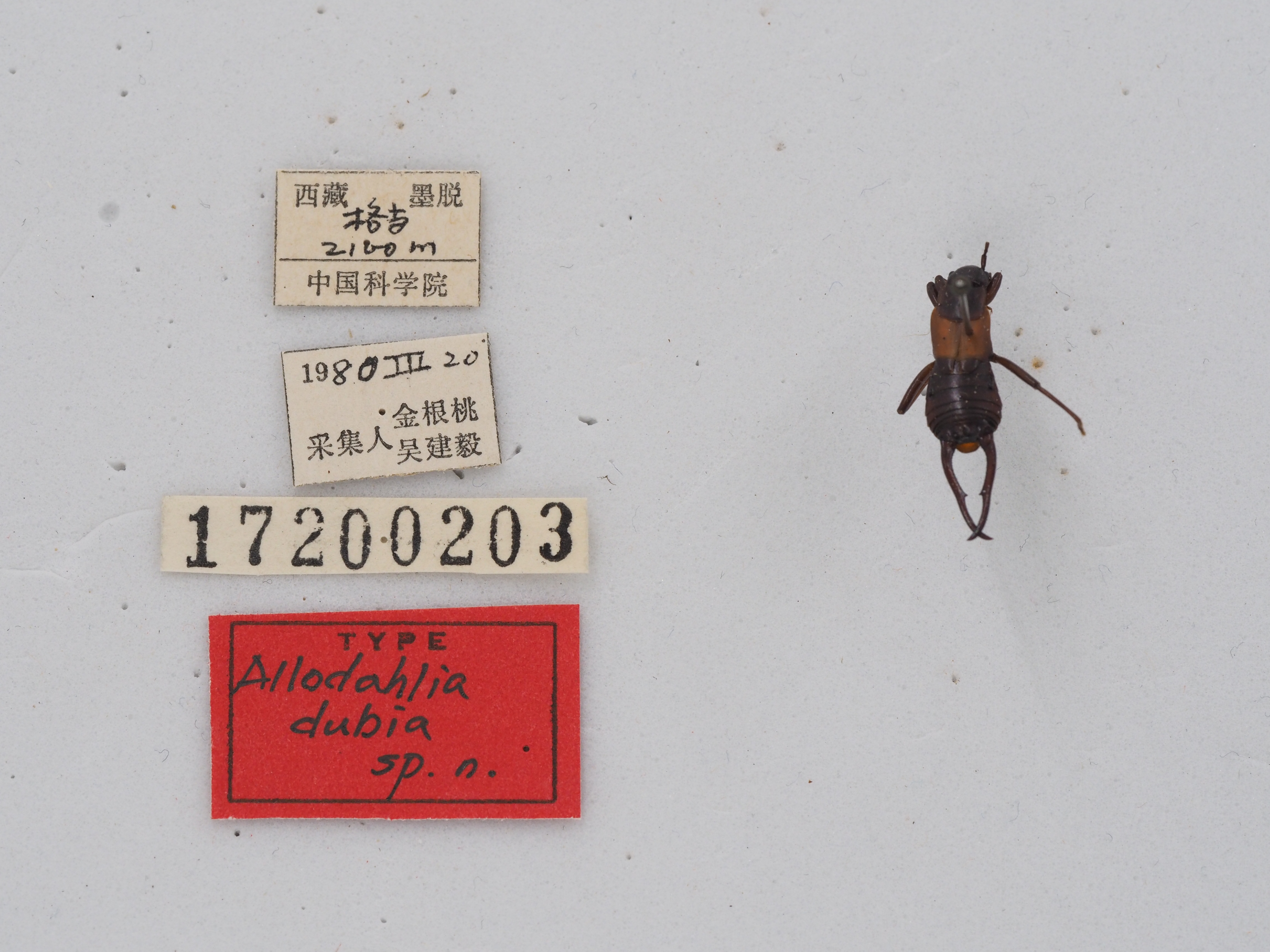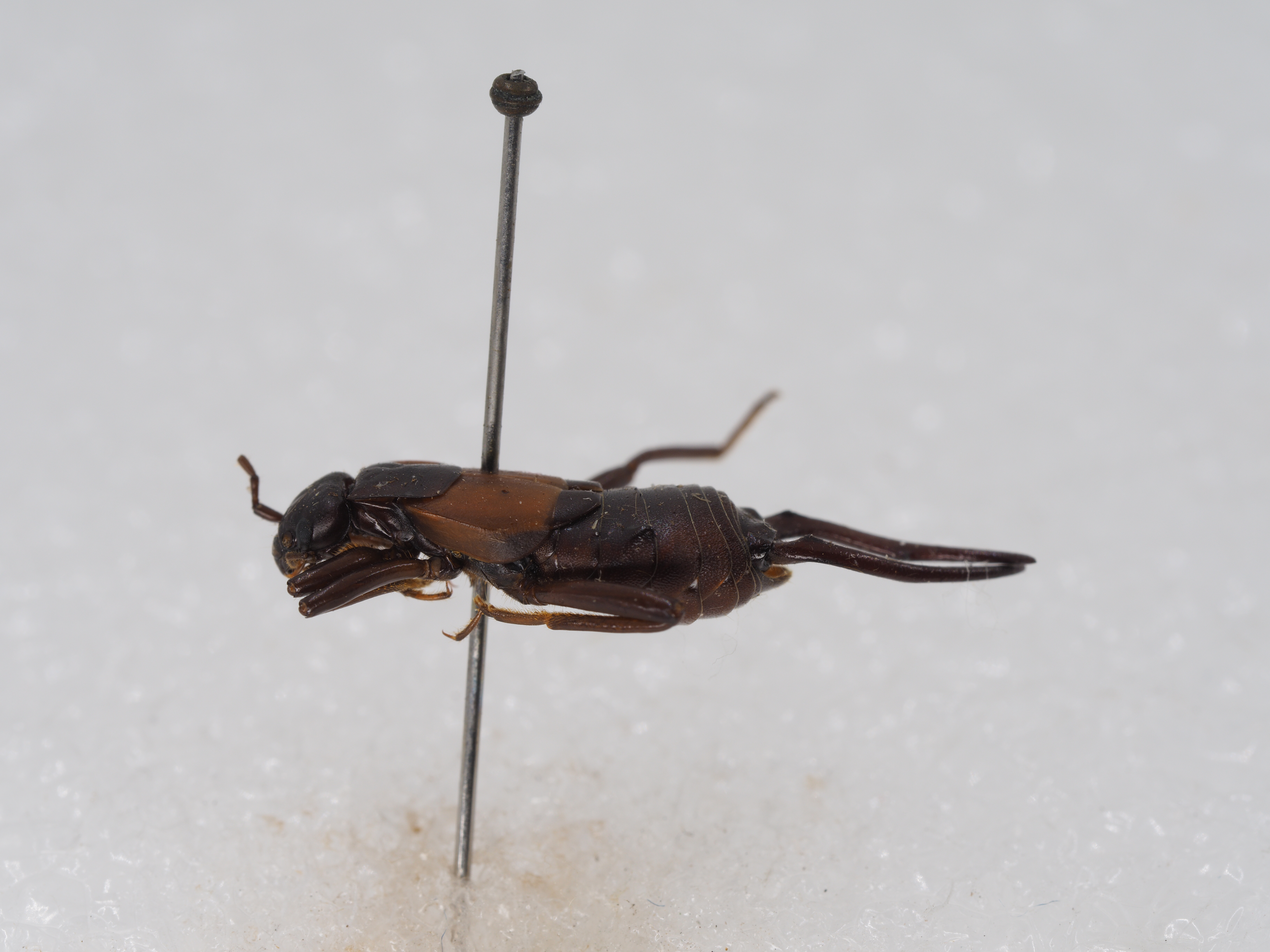 描述:Male: Head little narrower than pronotum, with distinct sutures: antennae with 9+? segments, first segment stout, clubbed, not longer than the interspace between scrobes : third and fourth segments subequal in length. Pronotum transverse, anterior margin tr~ncate, the anterior angles obtuse, posterior ma.rgin broadly rounded, lateral margins parallel: prozona feebly tumid, with very fine longitudinal median sulus. Elytra ample, with a strongly marked carina on the basal half of lateral margins; surface of elytra a1most smooth, with very indistinct and sparse punoturations. Wings longer than .the elytra. Legs long and slend~r. Abdomen depressed, widened about the middle; glandular collosities very distinct in the third and fourth abdominal tergites: the tenth abdominal tergite very short and wide, the lateral margins gradually divergented backwards. epiproct very short and .strongly transverse, with two mare or less distinct lateral spinulae. Forceps remote at the base, each branch armed with a cristaeform tooth on the dorsal surface of basal part, the inner lower margin with well developed sharp triangular tooth, and with feeble denticulation between this tooth and the basa of the forceps; in lateral view the protion beyond the basal tooth is concave. Female unknown. General coloration shining brownish-black. Elytra purplish-red.