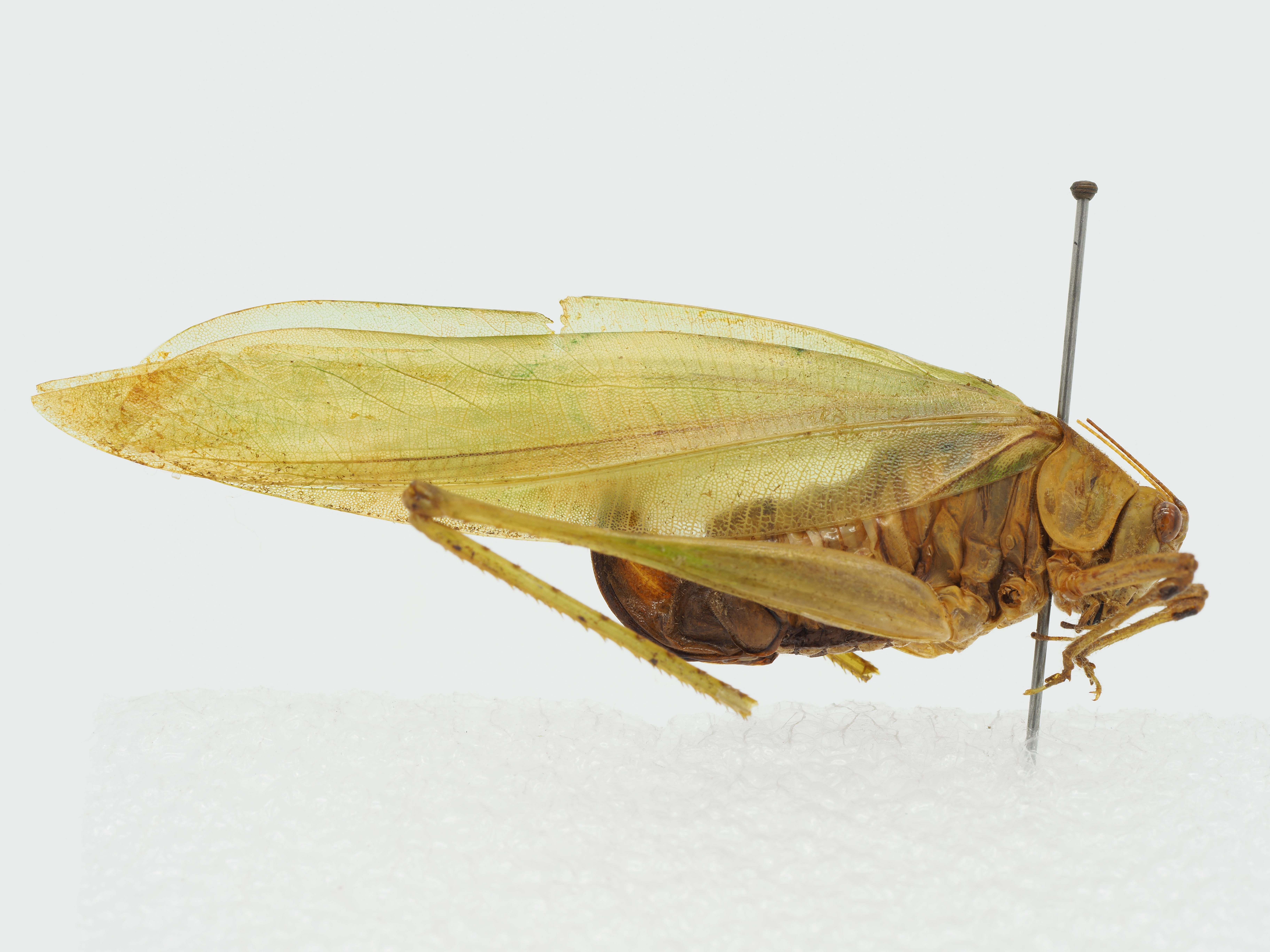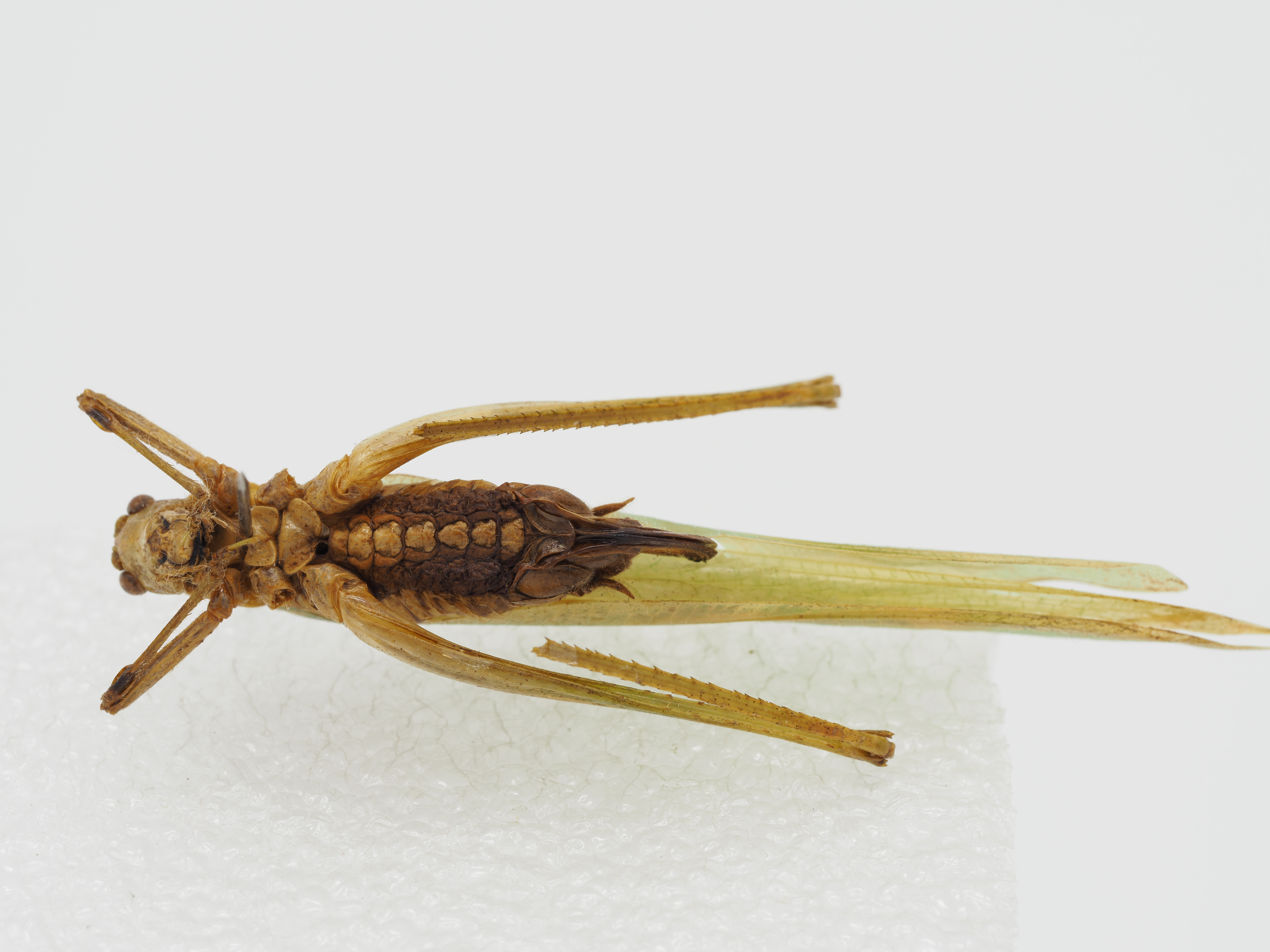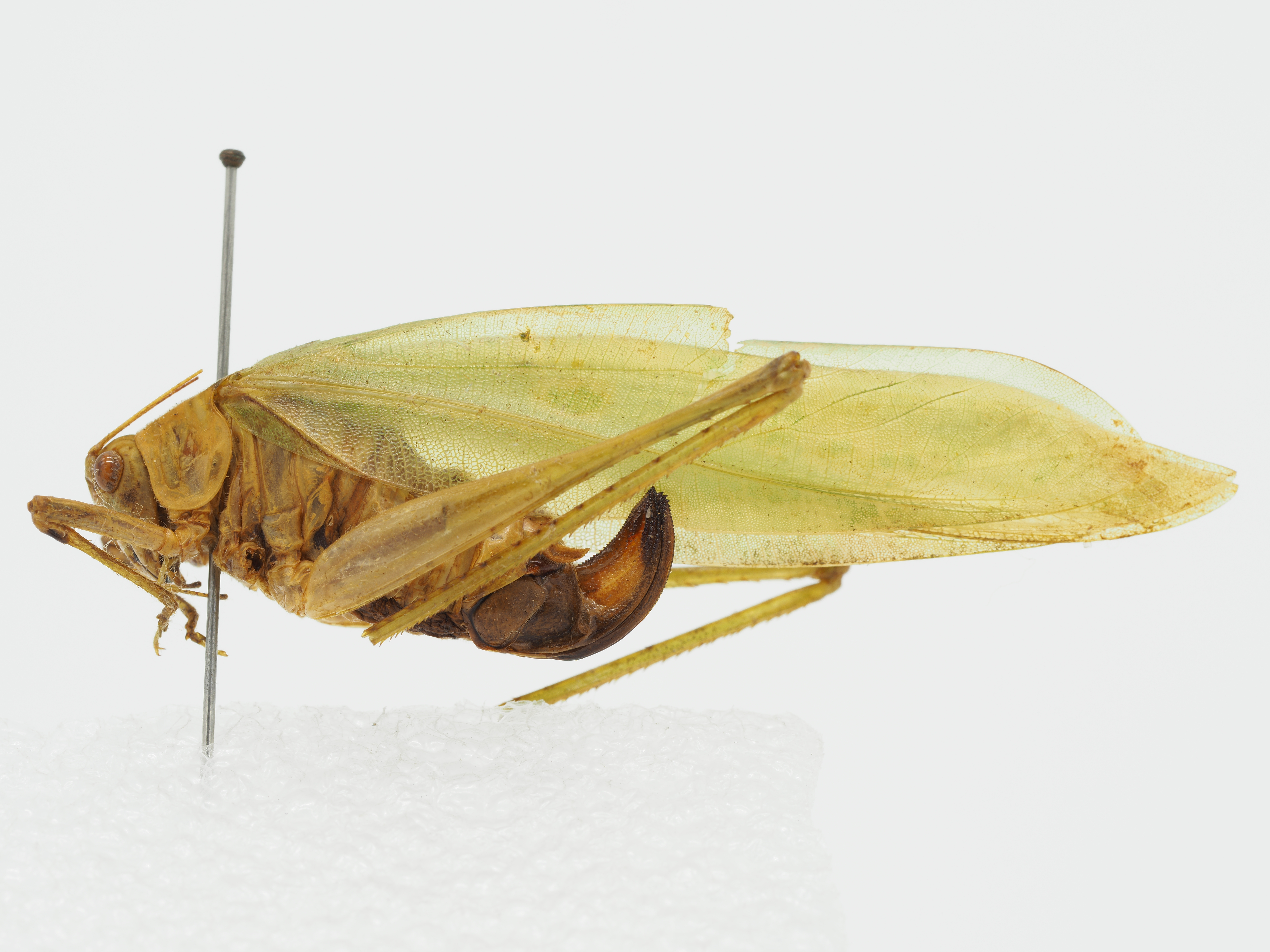 描述:Description. Male (holotype). Medium-sized. Tegmen with costa bordered by a yellow line; Rs branching slightly before middle of tegmen; Radius stem with two more lateral branches. Stridulatory vein shuttle-shaped, strongly bulging in middle, with about forty-four closely arranged large teeth, except about eleven small obsolescent teeth in distal fifth (Fig. 29). Tenth abdominal tergum in lateral view distinctly inflated as head-shaped; basal part widest; lateral margin “S”-shaped, slightly concave in middle; in the dorsal view cylindrical lobes joining together at base, then cleft with a “U”-shaped notch, apical margin obtuse (Figs 41, 54). Cerci short, conical, evenly incurved into a hook at apex. Subgenital plate slightly shorter than anterior femur, widest at base, gradually tapering distad, and split from distal quarter into two lobes; median carina distinct; styli short; central area strongly produced ventrad; lateral areas strongly leaned (Fig. 66). Female. Ovipositor with ventral margin concave in basal area (Fig. 76). Subgenital plate triangular, as long as wide; middle carina distinct; lateral margins slightly concave; apical margin widely rounded (Fig. 86). Coloration. Brownish green (Green when alive). Compound eyes dark brown. Tympana of anterior tibiae with inner opening and dorsal margin black. Tegmina with Costa yellow bordered by a dark brown line. Male tenth abdominal tergum with lobes dark brown. Female ovipositor with apical area dark brown.