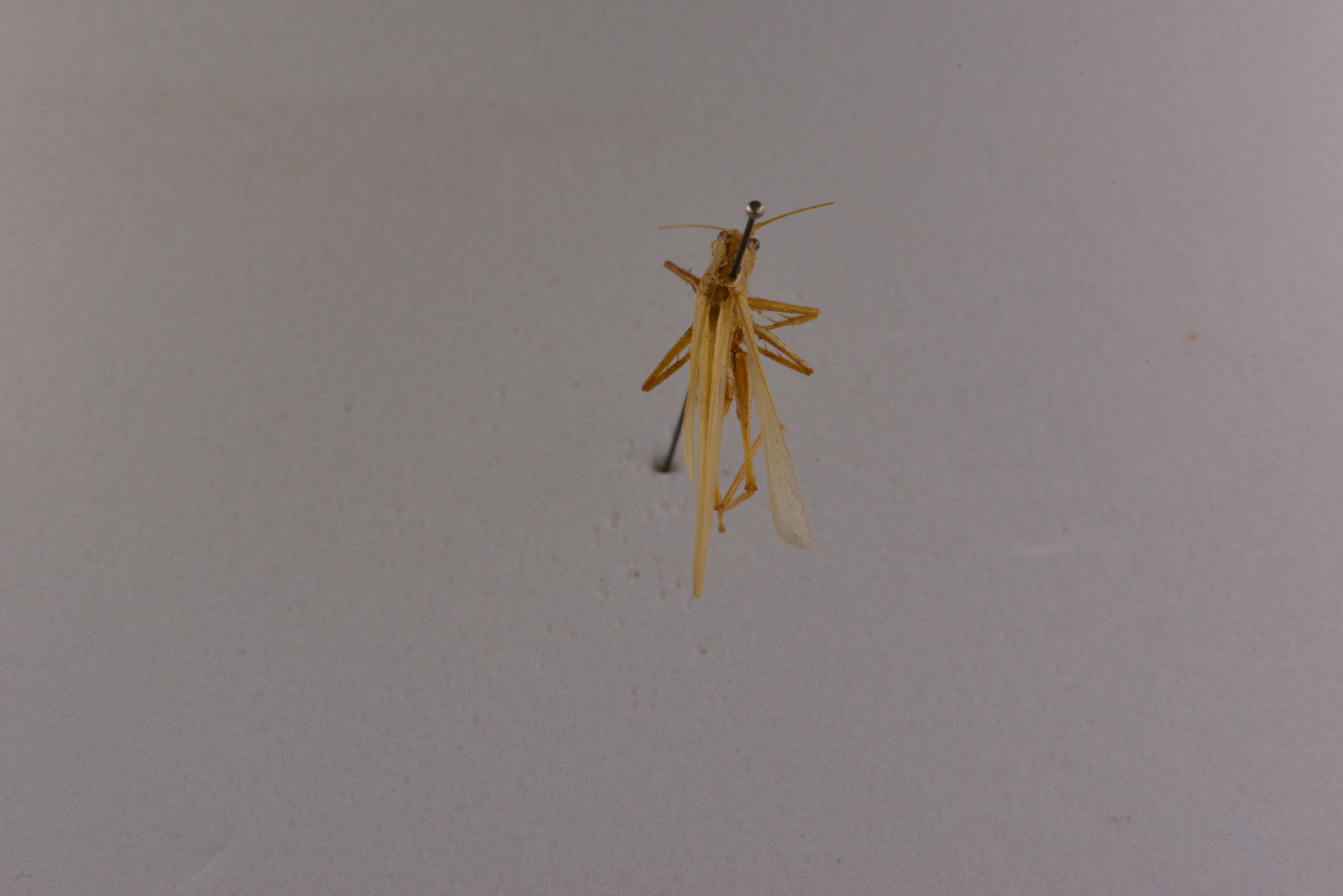 描述:Description size medium, form typical of the genus.Coloration pale greenish with a pair of short stripes on the dorsum of the head just interad of the inner eye margins and continued as a dorso-lateral brown stripe on the pronotum. Leg spination as follows all femora unarmed ; fore tibiae with 4 pairs of long ventral spines, the proximal pair the longest and with one minute external subapical and a pair of very small apical spines.