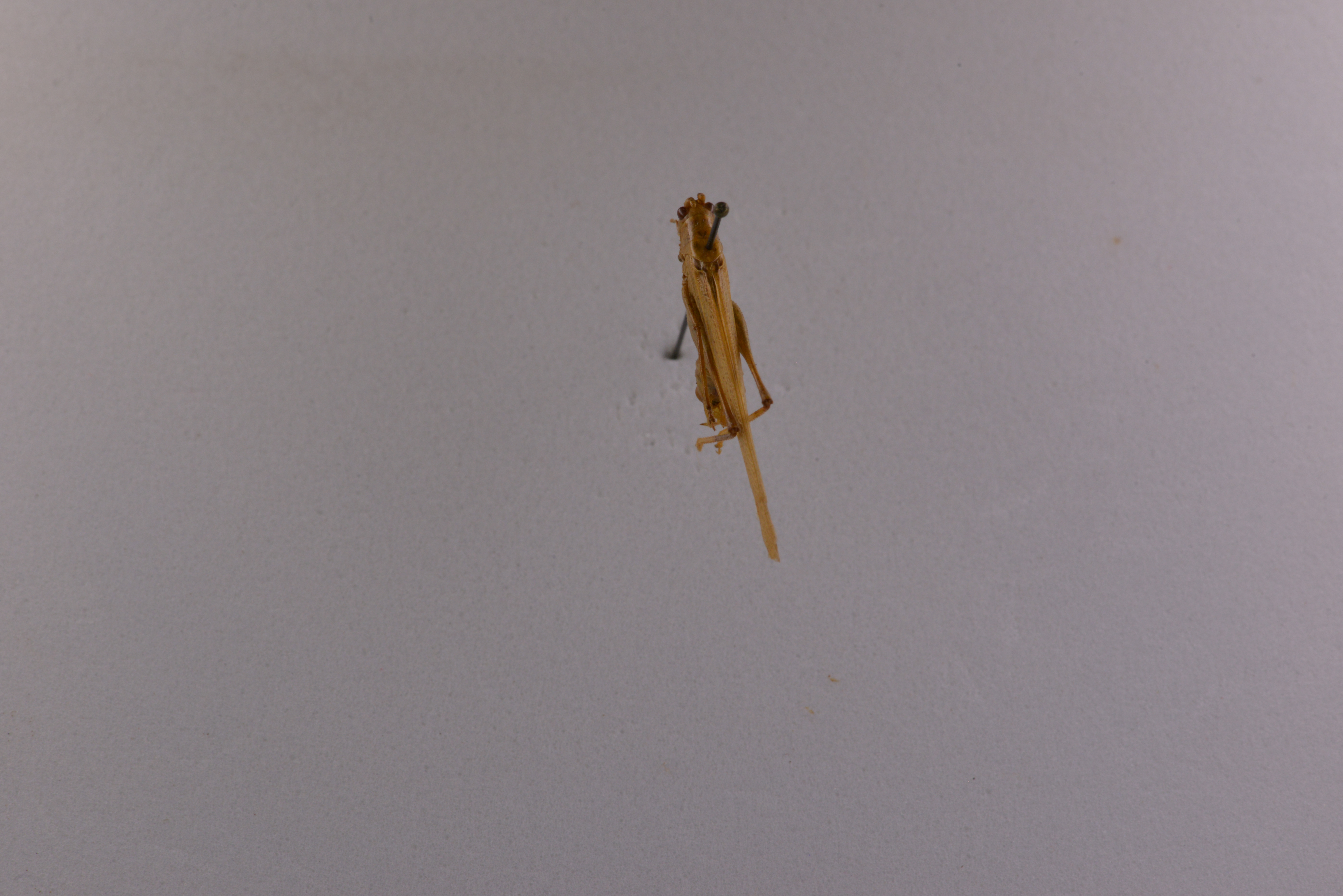 描述:Description size medium, form typical of the genus.Coloration pale greenish with a pair of short stripes on the dorsum of the head just interad of the inner eye margins and continued as a dorso-lateral brown stripe on the pronotum. Leg spination as follows all femora unarmed ; fore tibiae with 4 pairs of long ventral spines, the proximal pair the longest and with one minute external subapical and a pair of very small apical spines.
