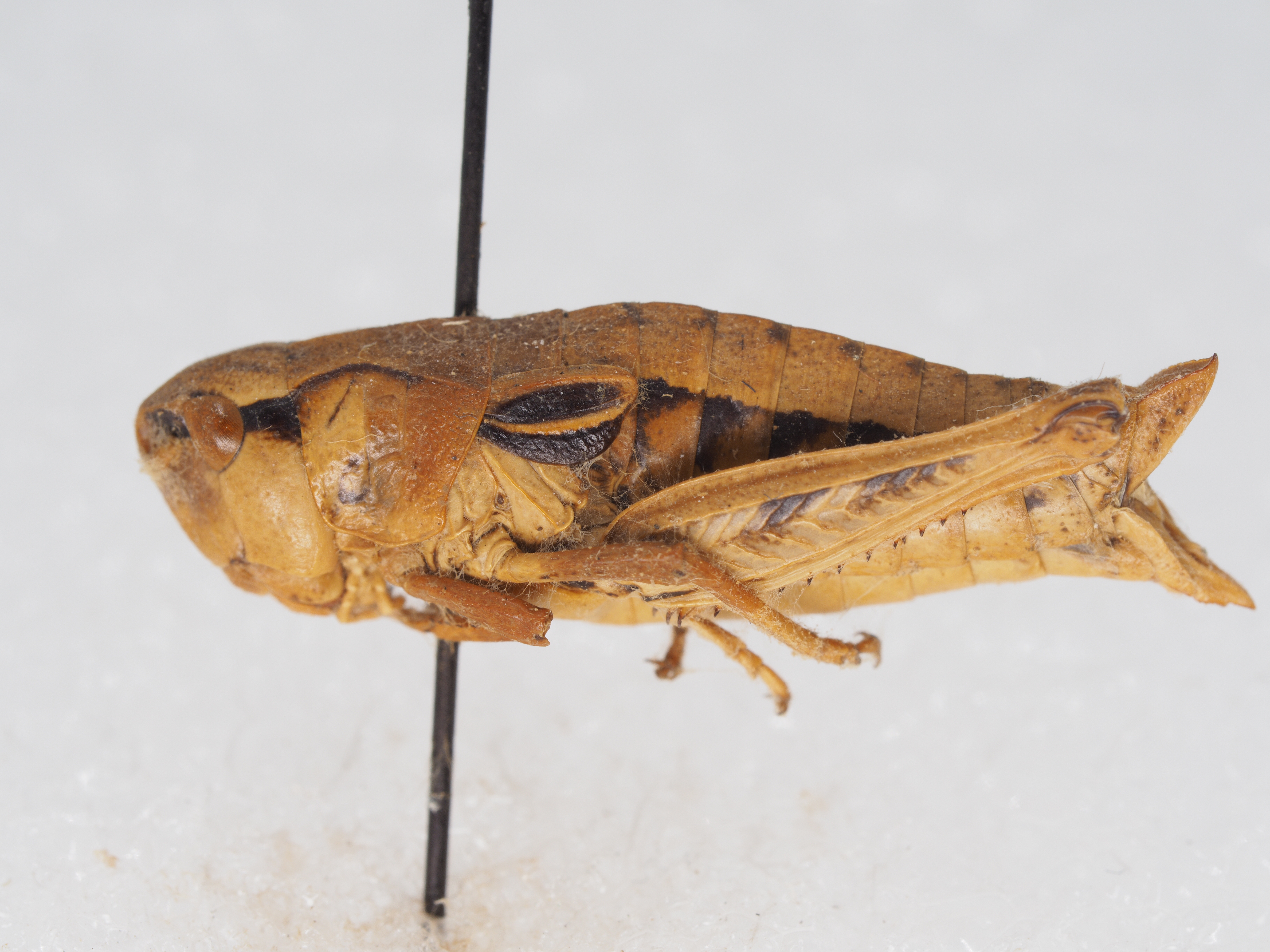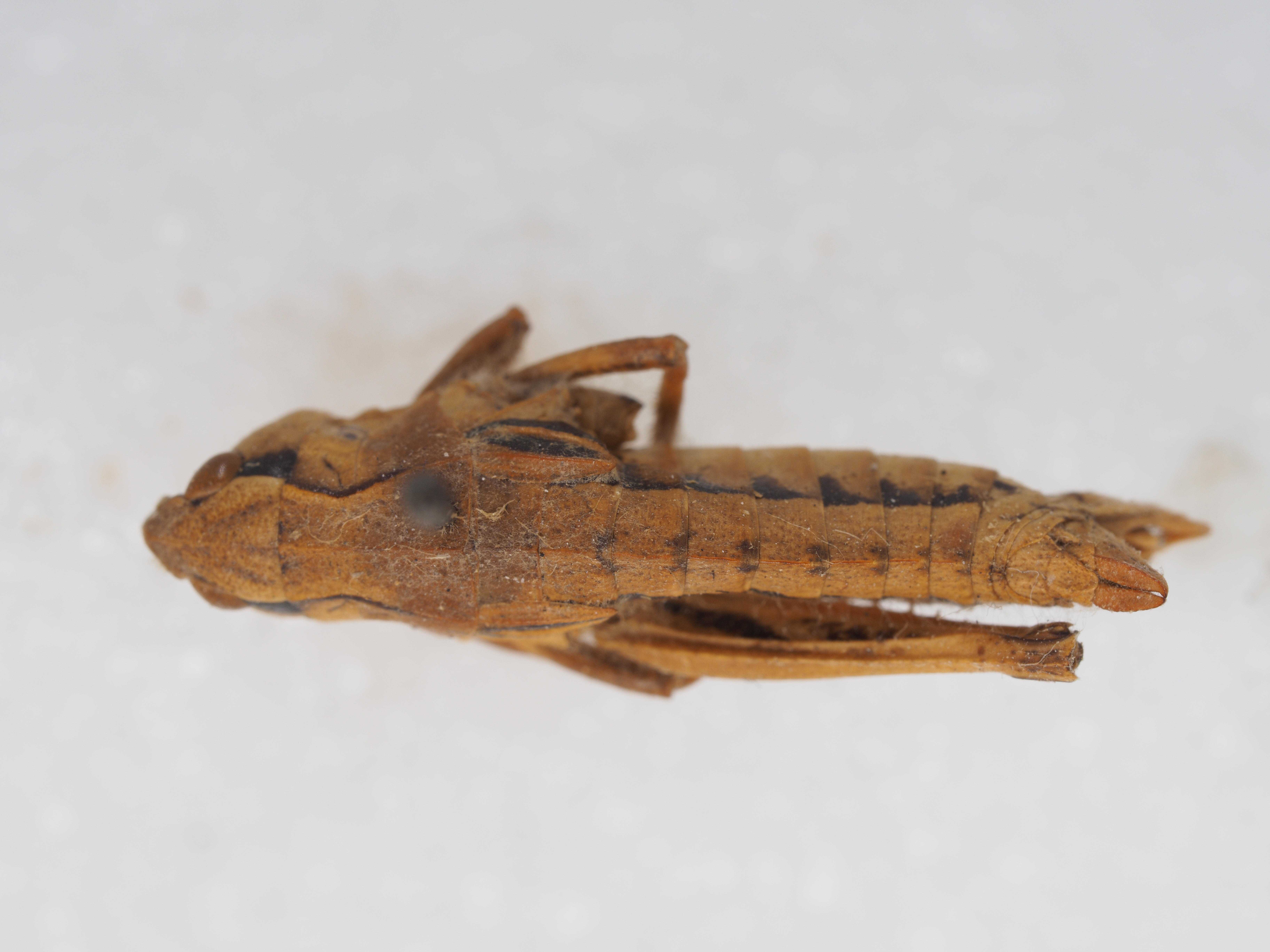 描述:体中小型。头顶突出,三角形,自复眼的前缘到头顶顶端的距离大于复眼横径和眼间距宽度。无头侧窝。颜面倾斜,颜面隆起自触角基部到唇基具明显纵沟。颜面侧隆线弱。触角丝状,不到达或超过前胸背板后缘,中段一节的长宽相等或长为宽的1.5—1.6倍。复眼卵圆形,复眼纵径为横径的1.3倍而与眼下沟几等长。前胸背板前缘平直或中部略向前突出;中隆线较粗,侧隆线在沟前区略内曲,沟前区的长度为沟后区长的1.7倍。中胸腹板侧叶间中隔宽大于长,与侧叶等宽。前翅宽叶状,顶圆,侧置,雄性超过第2腹节背板后缘,翅长为宽的2.3—2.5倍;雌性超过第1腹节背板后缘,翅长为宽的1.8倍。后足股节匀称,长为宽的4—5倍。雄性腹部末节背板具小尾片;肛上板宽,顶三角形突出;尾须柱状,到达肛上板顶端;一下生殖板短锥形,顶钝。雌性产卵瓣细长,上产卵瓣之上外缘具细齿;下生殖板后缘中央突起。