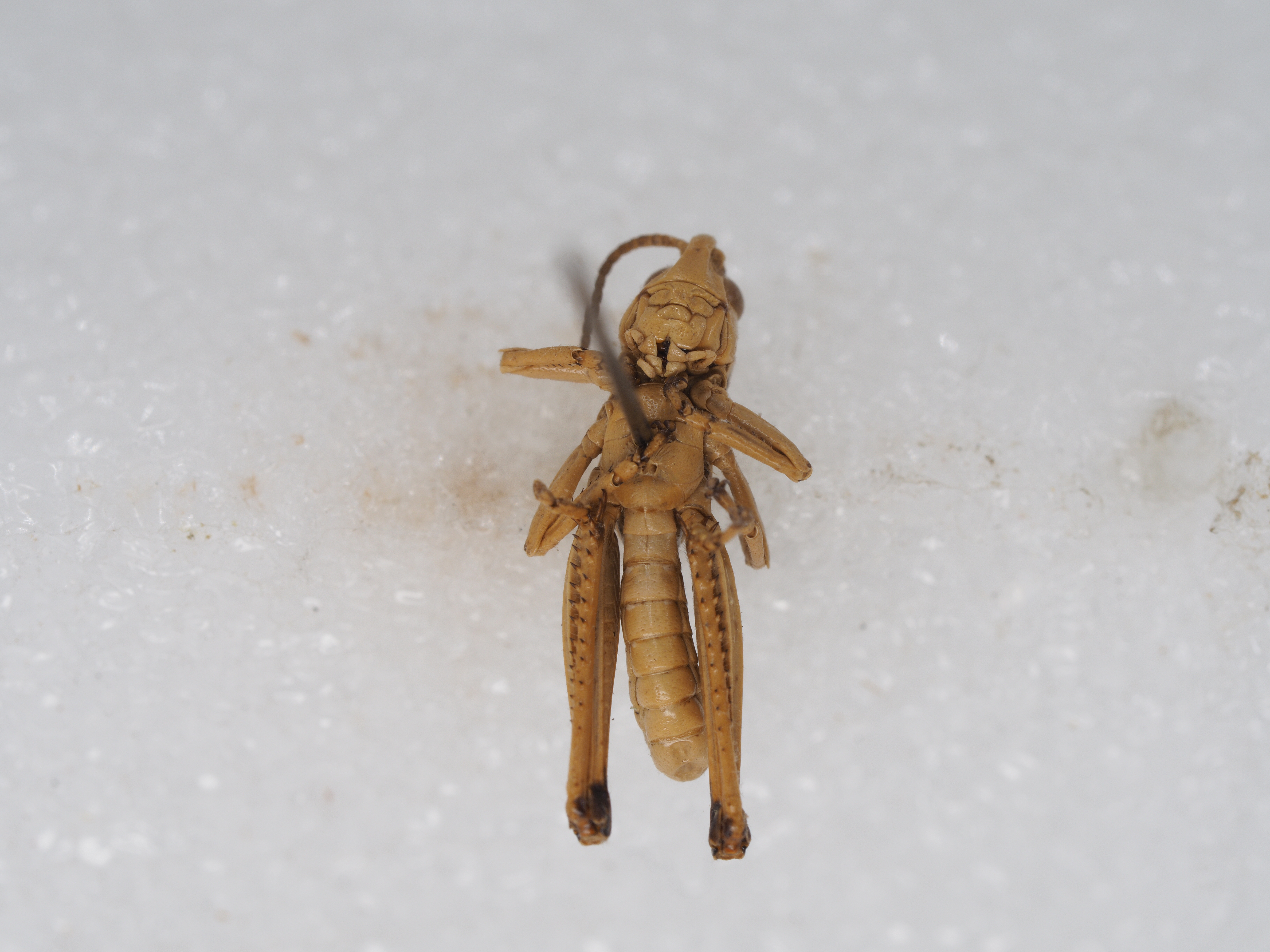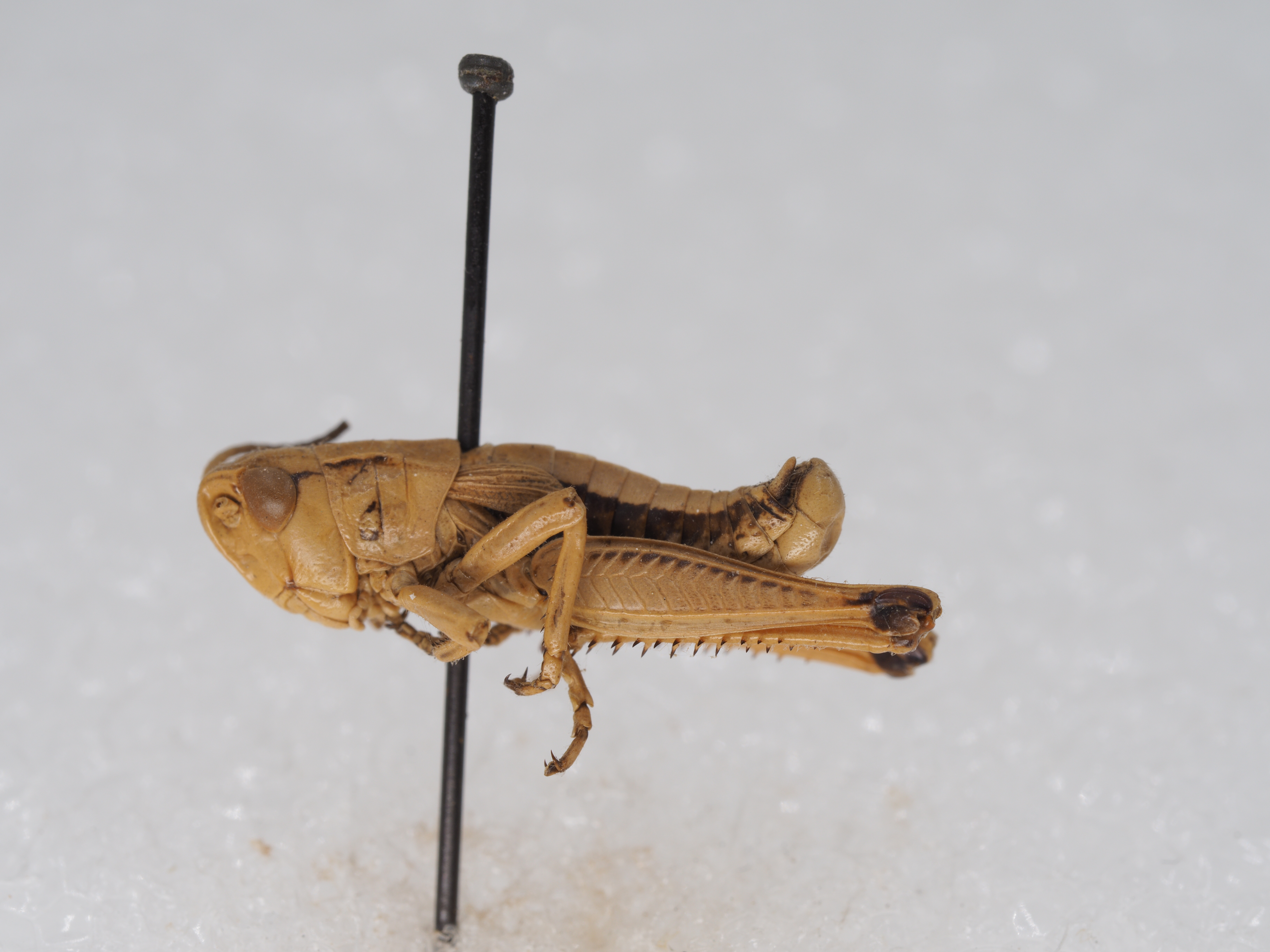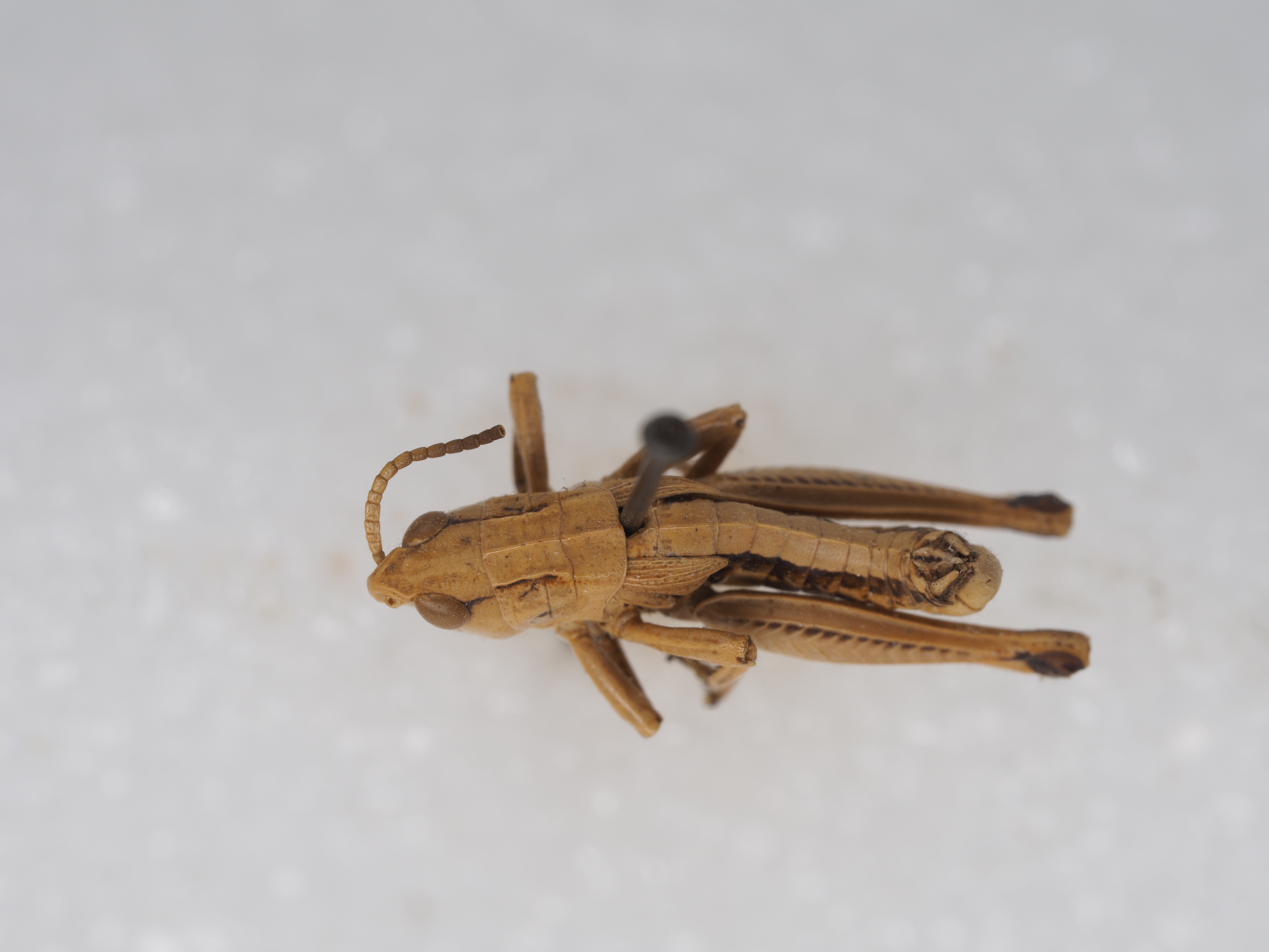 体色 淡褐色,具明显的眼后带。后足股节外侧暗色,膝侧片黑色。后足胫节基部黑色。腹部两侧具黑褐色纵条纹。