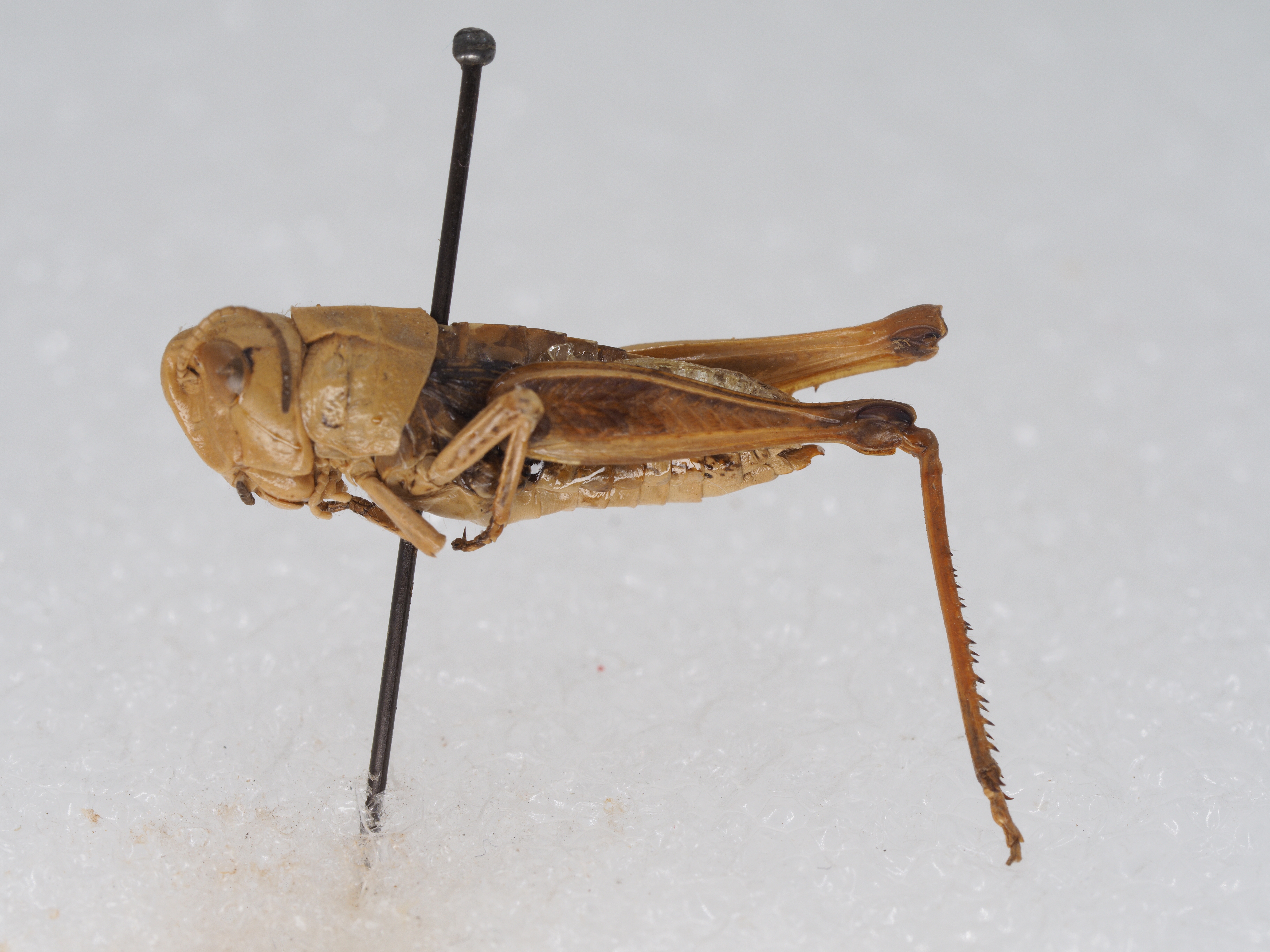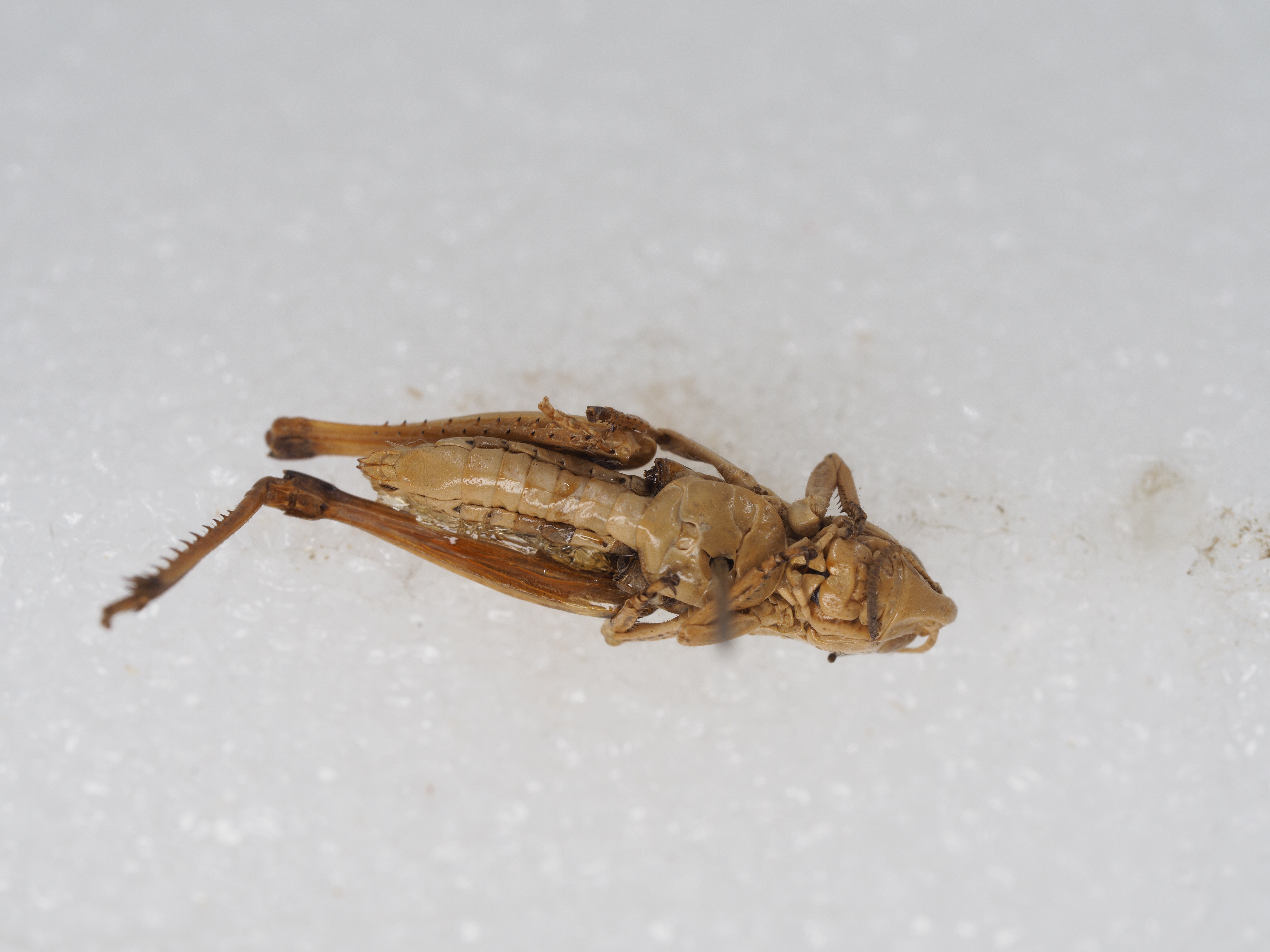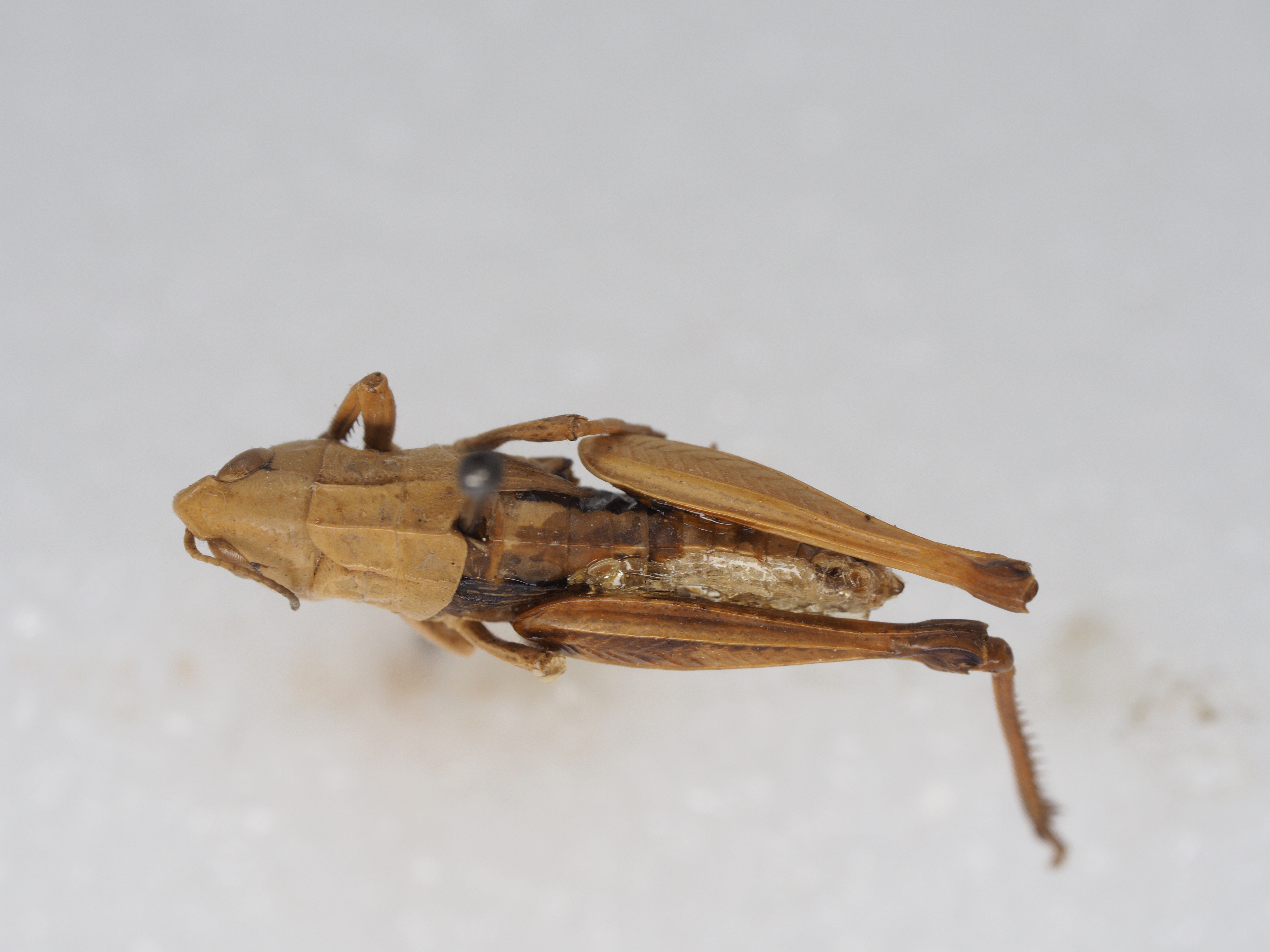 体色 淡褐色,具明显的眼后带。后足股节外侧暗色,膝侧片黑色。后足胫节基部黑色。腹部两侧具黑褐色纵条纹。