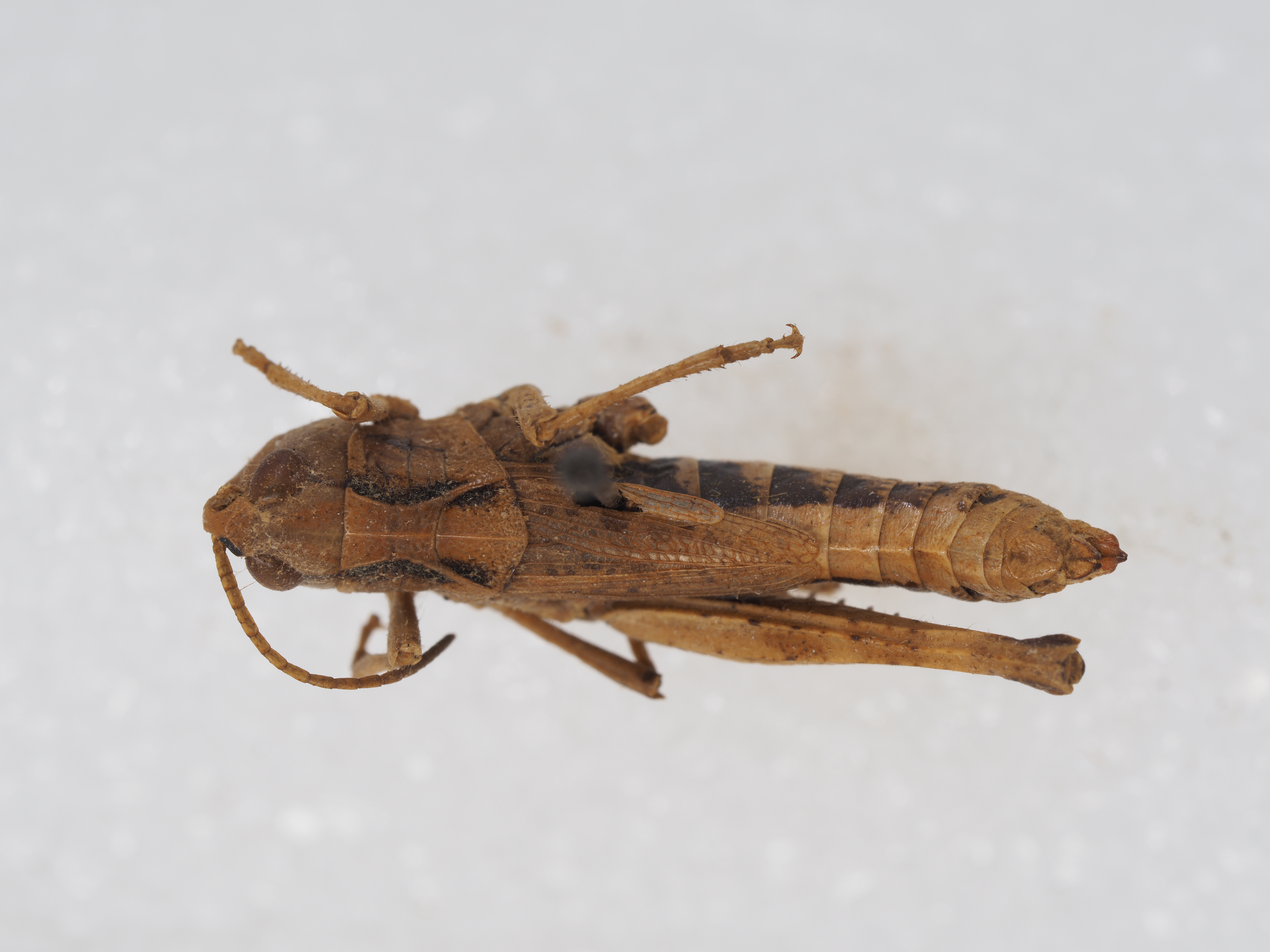 体色 淡褐色,具明显的眼后带。后足股节外侧暗色,膝侧片黑色。后足胫节基部黑色。腹部两侧具黑褐色纵条纹。