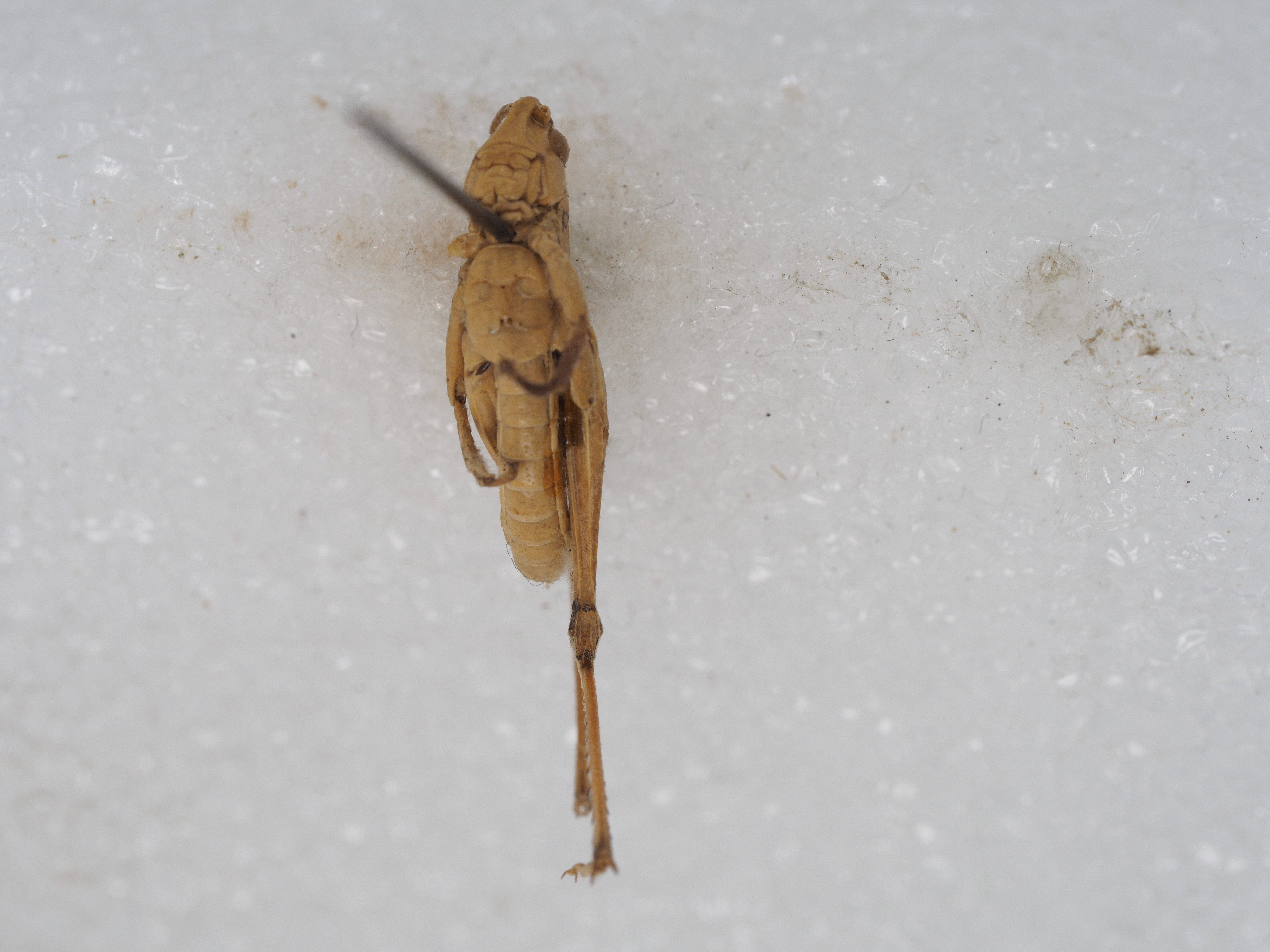 体色 淡褐色,具明显的眼后带。后足股节外侧暗色,膝侧片黑色。后足胫节基部黑色。腹部两侧具黑褐色纵条纹。