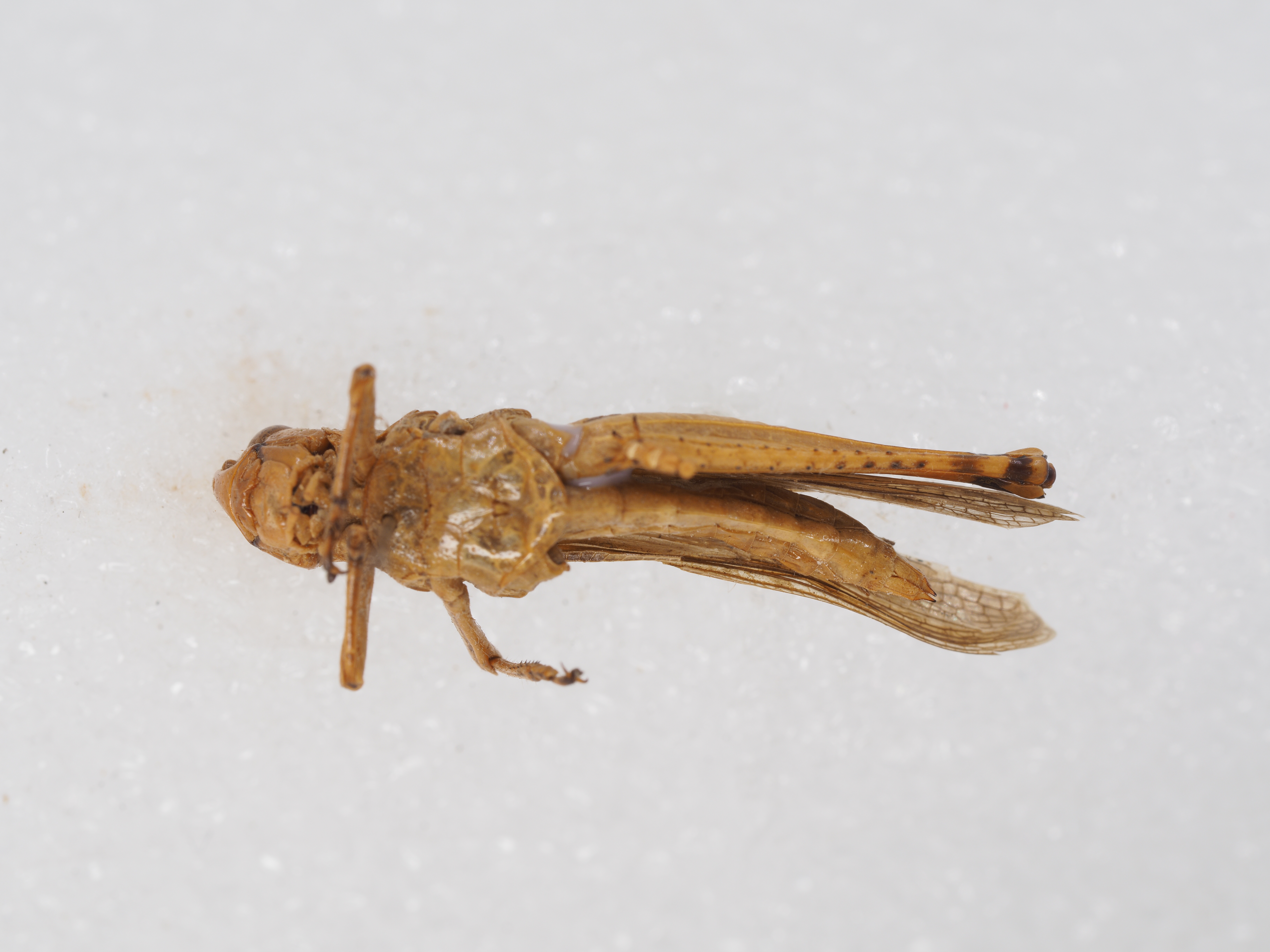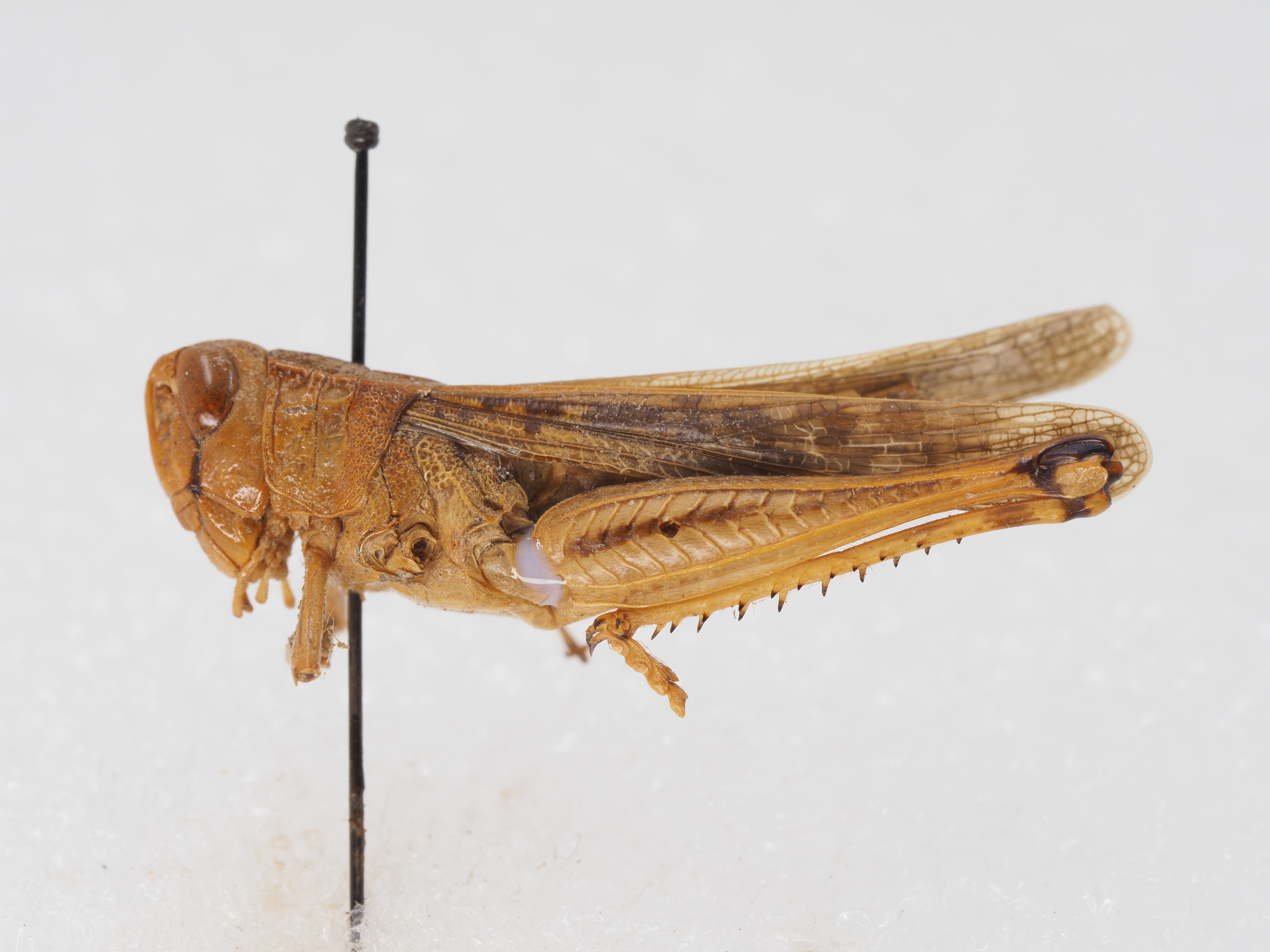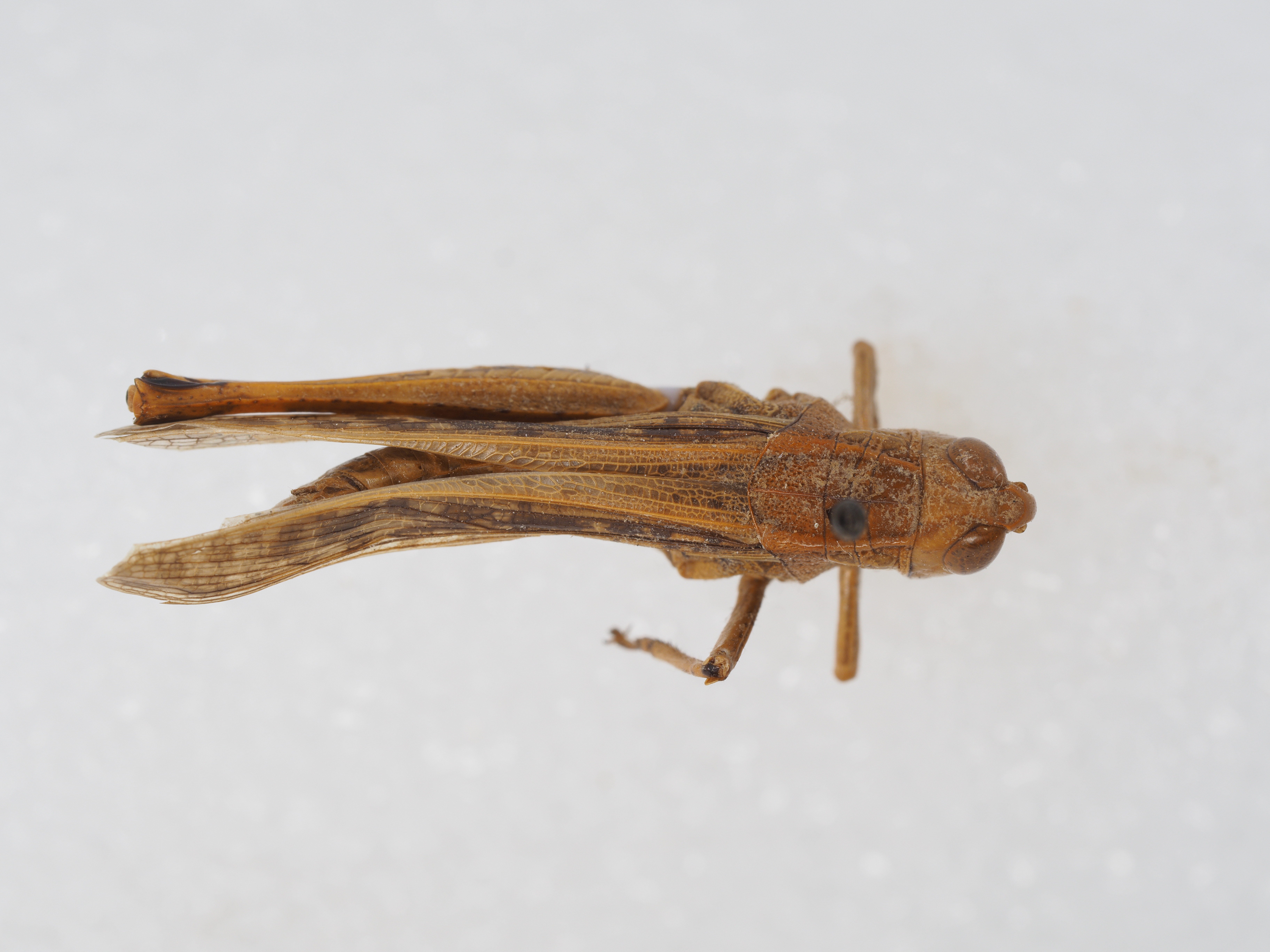 体色:体黑褐色,前胸背板背面近乎黑色。前翅褐色,散布暗色小斑点。后翅透明,五色。后足股节上侧具2个不明显的暗斑,外侧中部具一条黑色纵条纹,膝部上半部黑色。后足胫节基部具一个淡色斑,端半部红色。