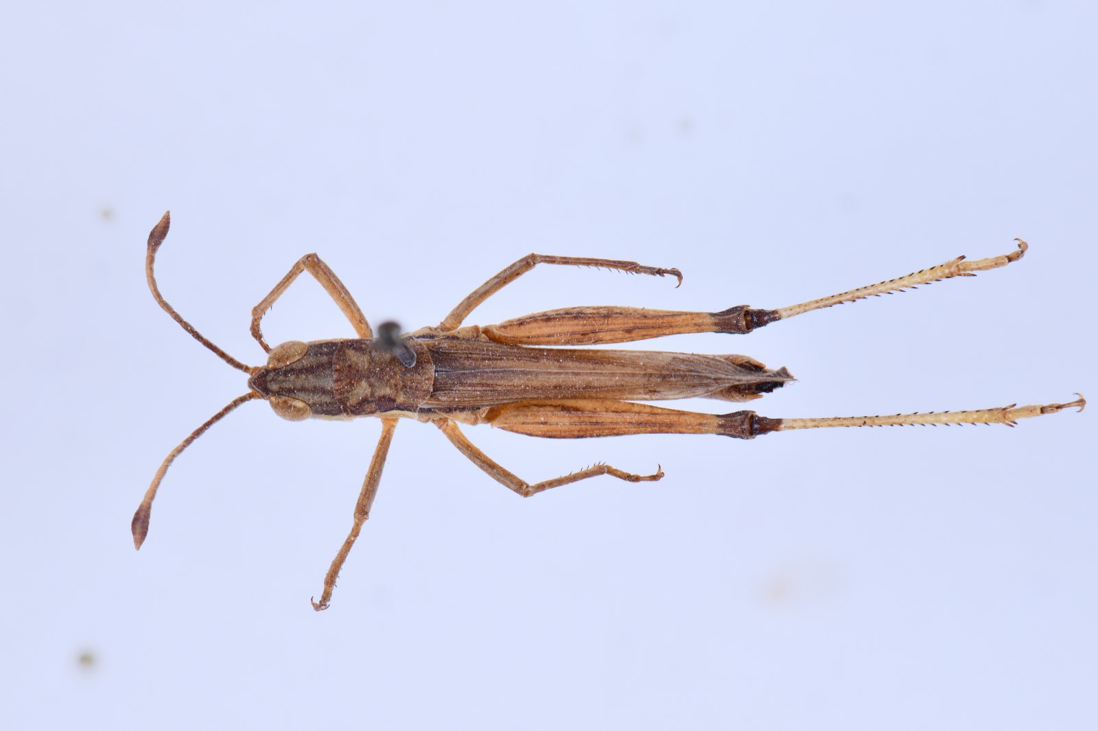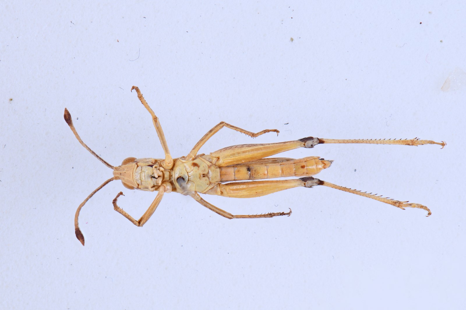 描述:雄性 体小型。头部较大而短,短于前胸背板。头顶较宽,顶端直角形,眼间距宽为颜面隆起宽的1.4—1.8倍,头侧窝明显,狭长四角形,其长为宽的1.4倍。颜面侧观向后倾斜,颜面隆起具纵沟。复眼卵形,其纵径为横径的1.4—1.7倍。触角细长,超过前胸背板后缘,顶端数节膨大(图12b)。前胸背板前缘较直,后缘弧形;中隆线较低,侧隆线在中部稍弯曲;侧隆线间最宽处大于最狭处的1.4倍;后横沟切断中隆线和侧隆线;在中隆线处向前弯曲;沟前区大于沟后区,沟前区长为沟后区的1.2—1.3倍(图12a)。中胸腹板侧叶间中隔最狭处与其长近相等。后胸腹板侧叶全长彼此分开。前翅狭长,超过后足股节的末端,其长为宽的6倍,翅顶尖圆,缘前脉域不到达前翅中部,前缘脉域大于亚前缘脉域的2.4倍,中脉域较狭,略小于肘脉域(图12c)。前足胫节下侧略具稀疏短绒毛,后足股节外侧上基片长于下基片。后足胫节缺外端刺,外缘具刺12—14个,内缘具刺12—13个。后足跗节第一节长为其余二节之和。肛上板三角形,基部具中纵沟;两侧缘中部向上卷起。尾须短锥形,不到达肛上板末端,顶端钝。下生殖板短锥形,顶尖(图12e)。阳具基背片如图12d。