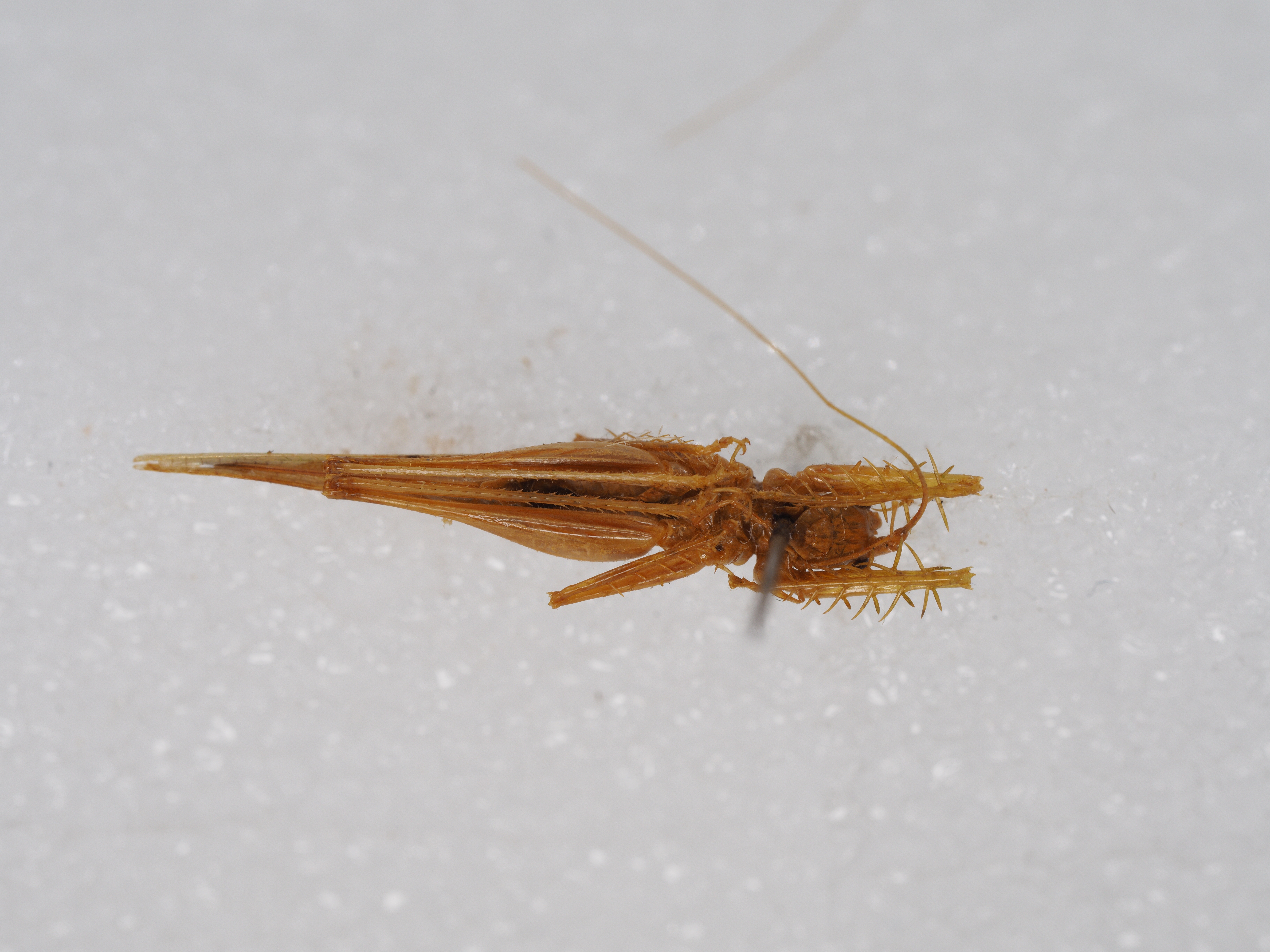 描述:Body small size (13-14 mm). Front leg with femoral spurs 5/4 (100%), tibial spurs 6/6 (100%). Middle leg with femoral spurs 4/1 (91%, 9% with 5/1), tibial spurs 6/6 (100%), dorsal sub-basal spur absent (100%). Male with a small, rectangular epiproct, showing no variation. Paraprocts wide lobe-like, with a long, anterior ventrally-directed, finger-like process and a small posterior one. Cerci simply cylindrical, inwardly curved, each having a small, inner basal tooth in all exaained specimens. Epiphallus coat-hook-like, the exact fora varying with individuals. Female epiproct small and unremarkable. Paraprocts hardly visible. Subgenital plate with margin generally with more or less straight, convergent lateral margin, apex truncated, so11eti11es with a slight notch. Ovipositor shown as Fig.36F.