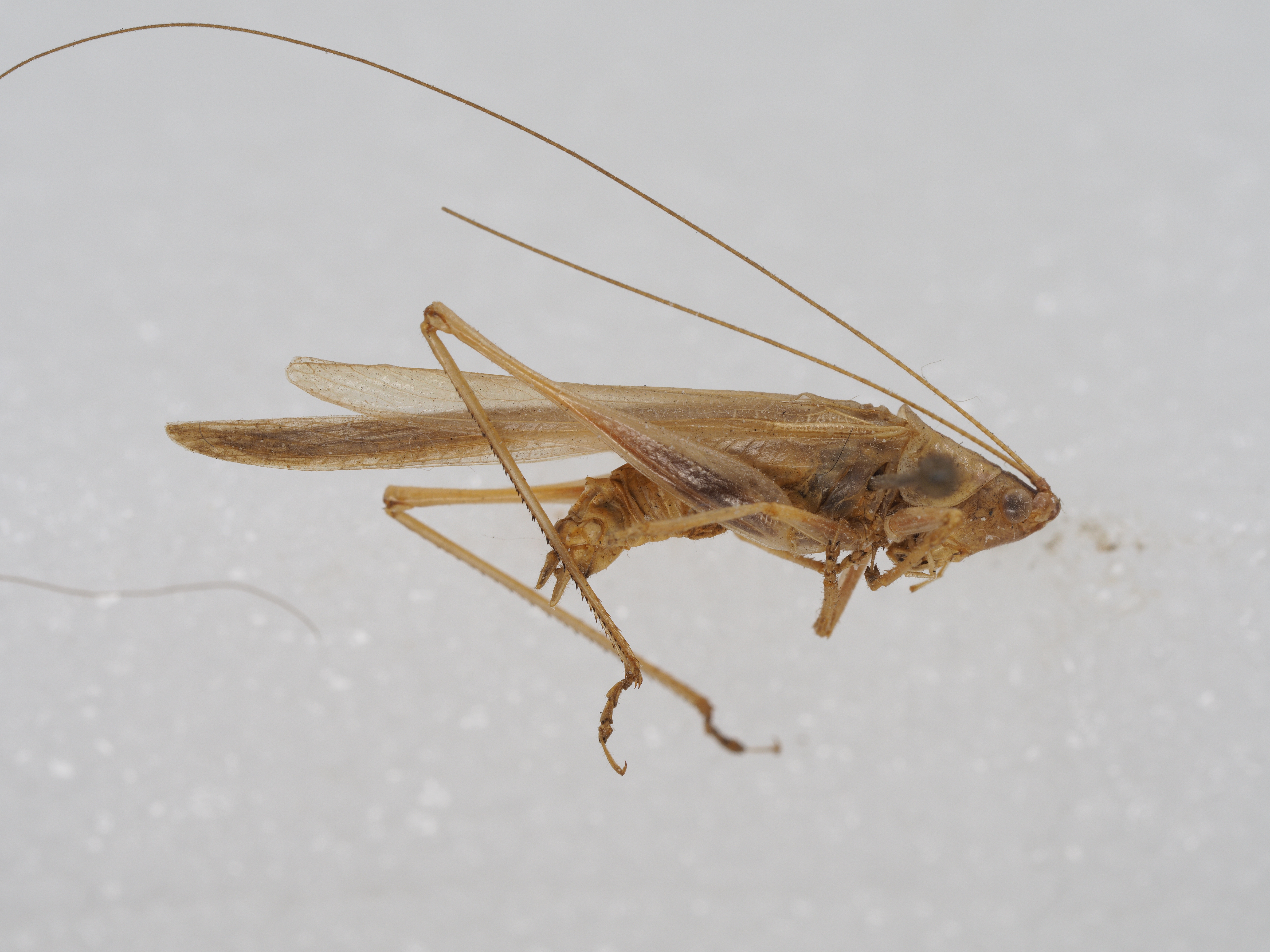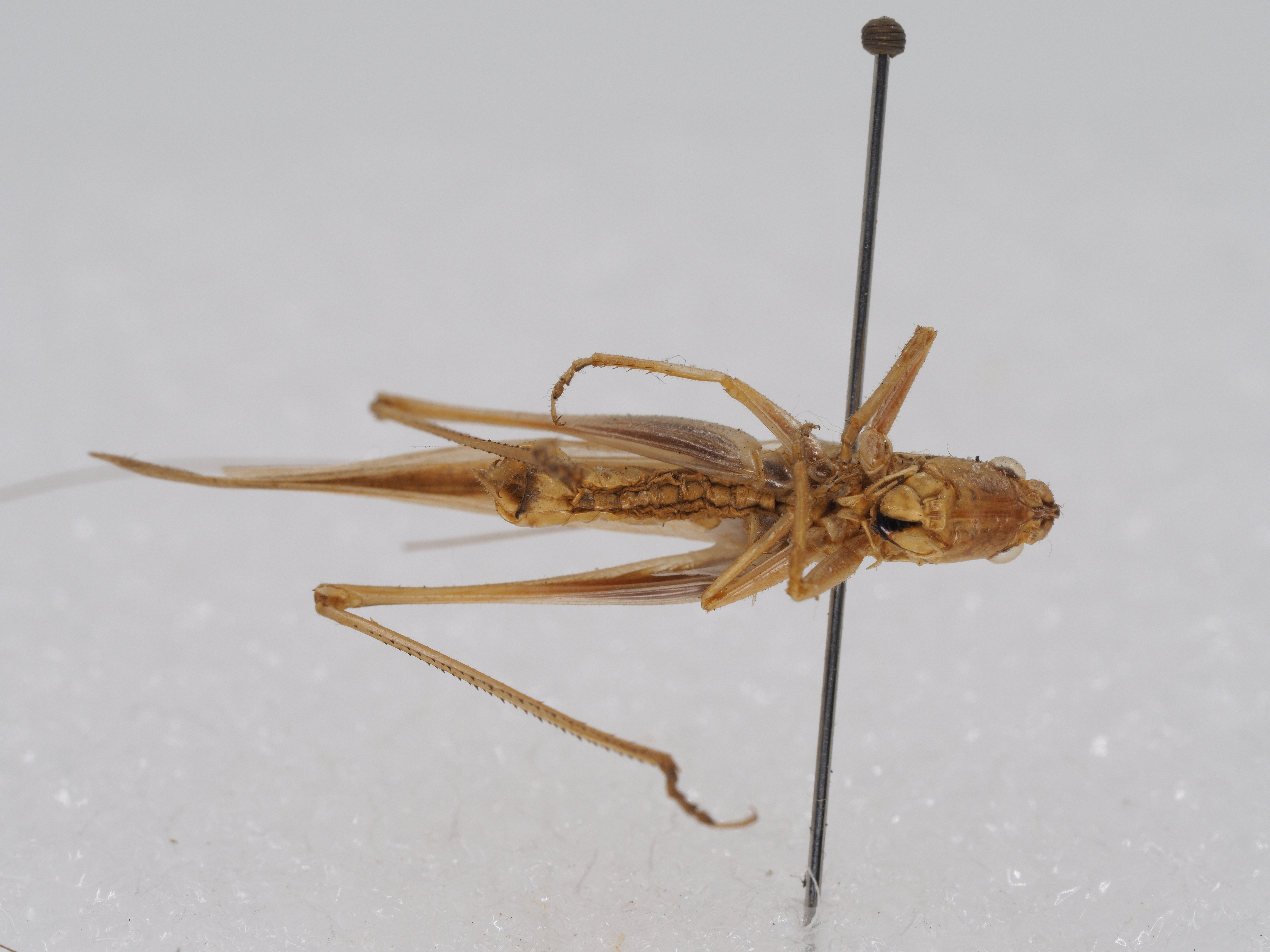 wings, but surpass hind femora. Tympanum on fore tibiae closed. Mid femora with two spines on knees. Hind