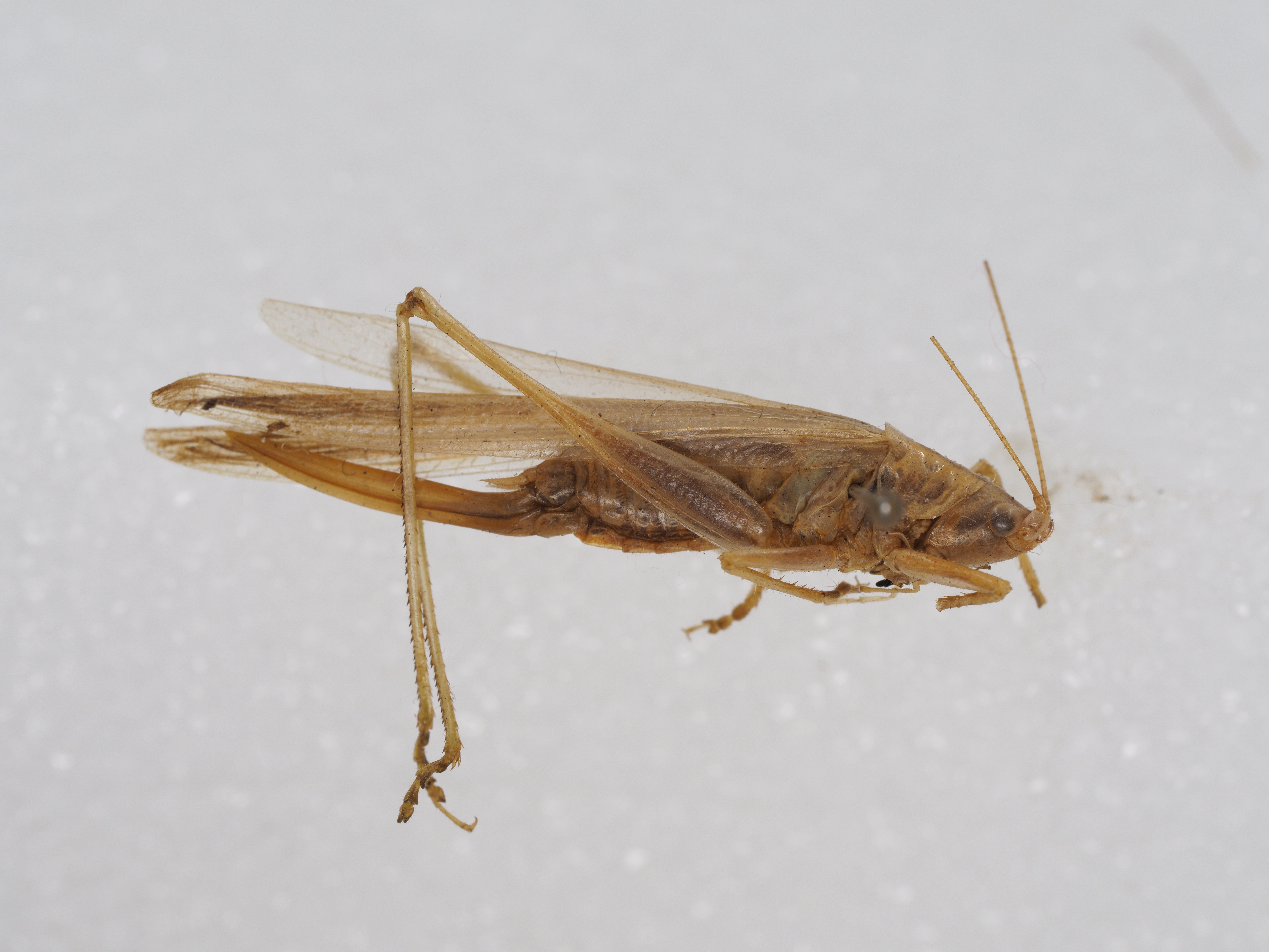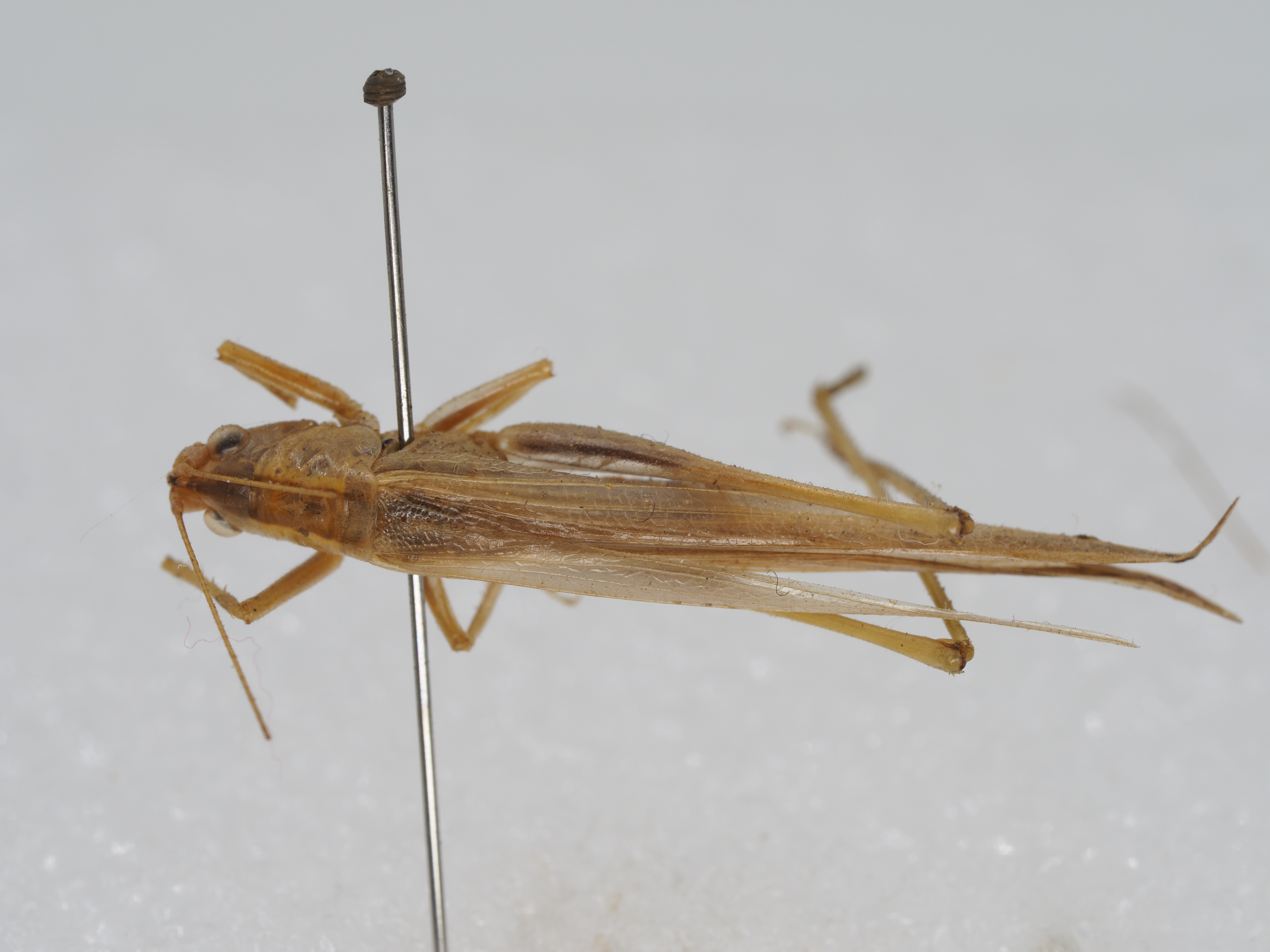 wings, but surpass hind femora. Tympanum on fore tibiae closed. Mid femora with two spines on knees. Hind