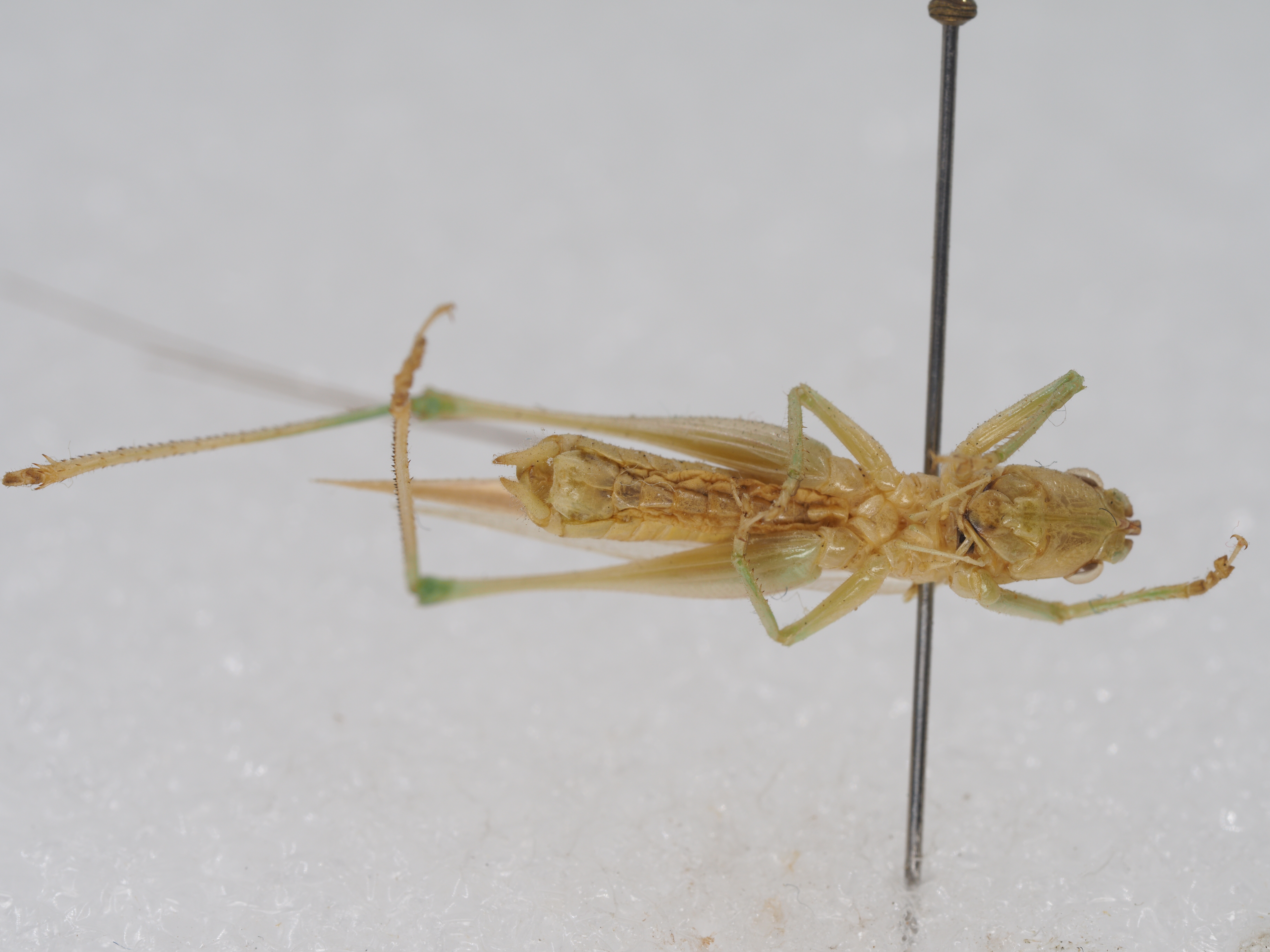 wings, but surpass hind femora. Tympanum on fore tibiae closed. Mid femora with two spines on knees. Hind