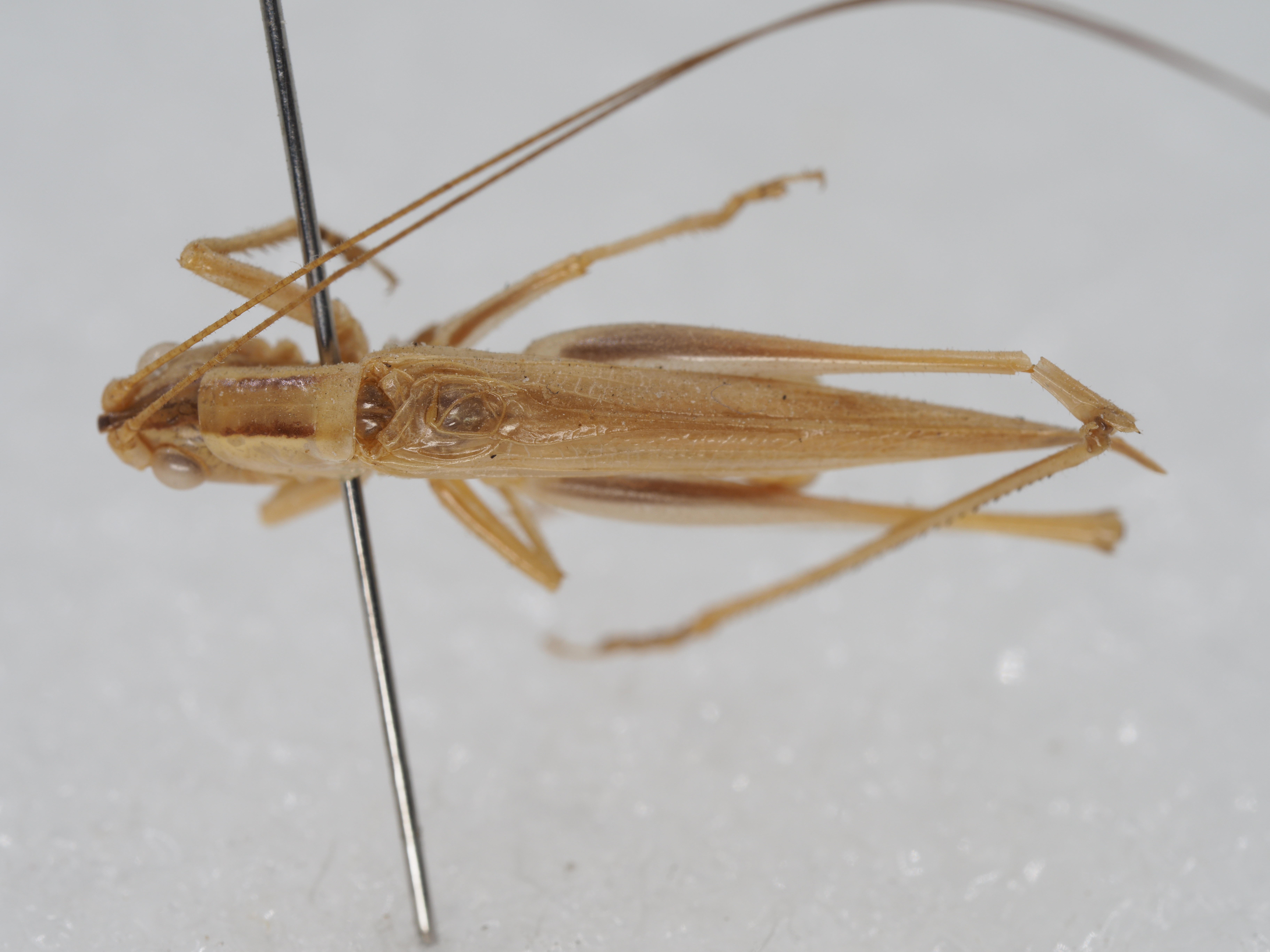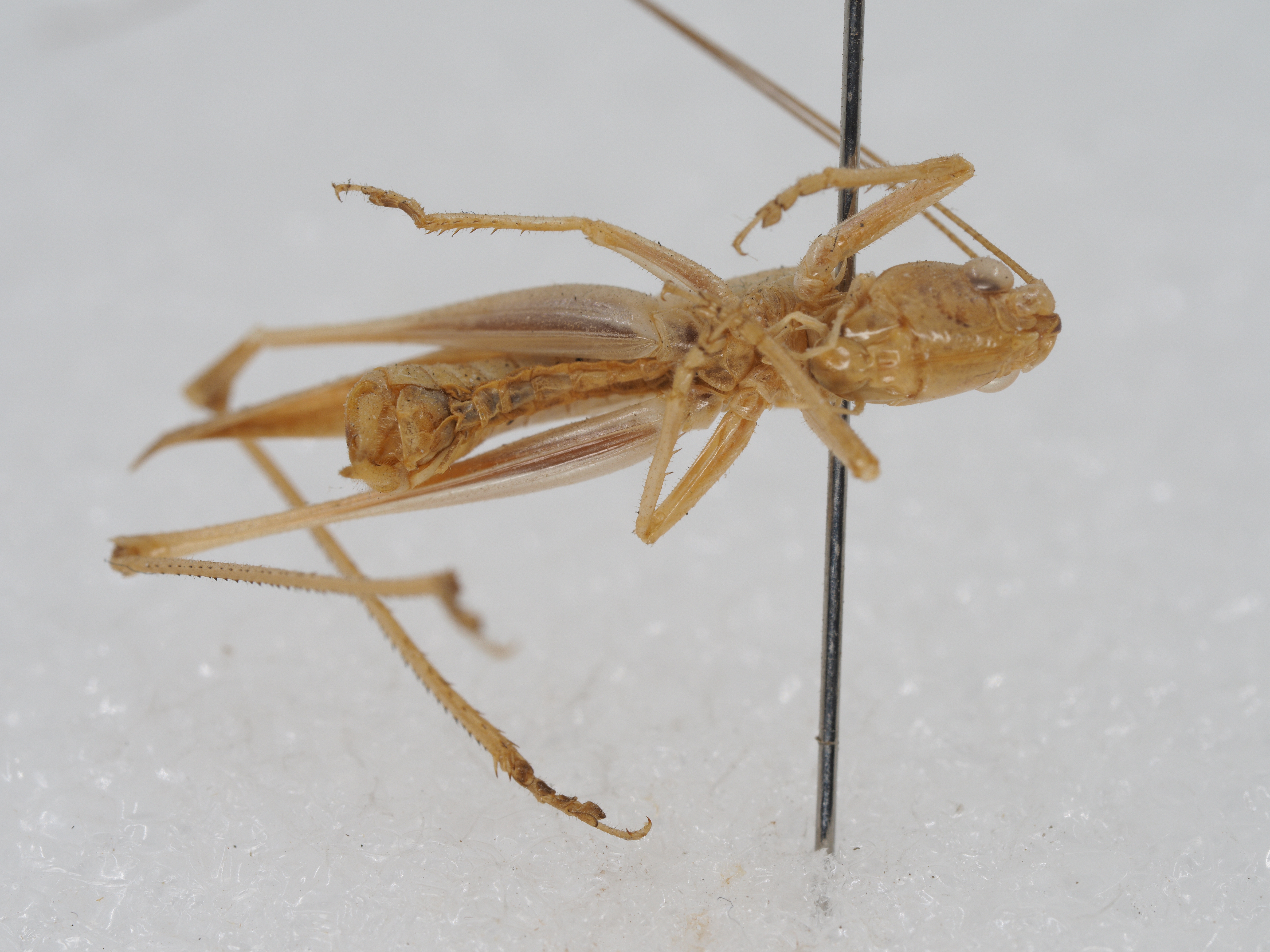 wings, but surpass hind femora. Tympanum on fore tibiae closed. Mid femora with two spines on knees. Hind