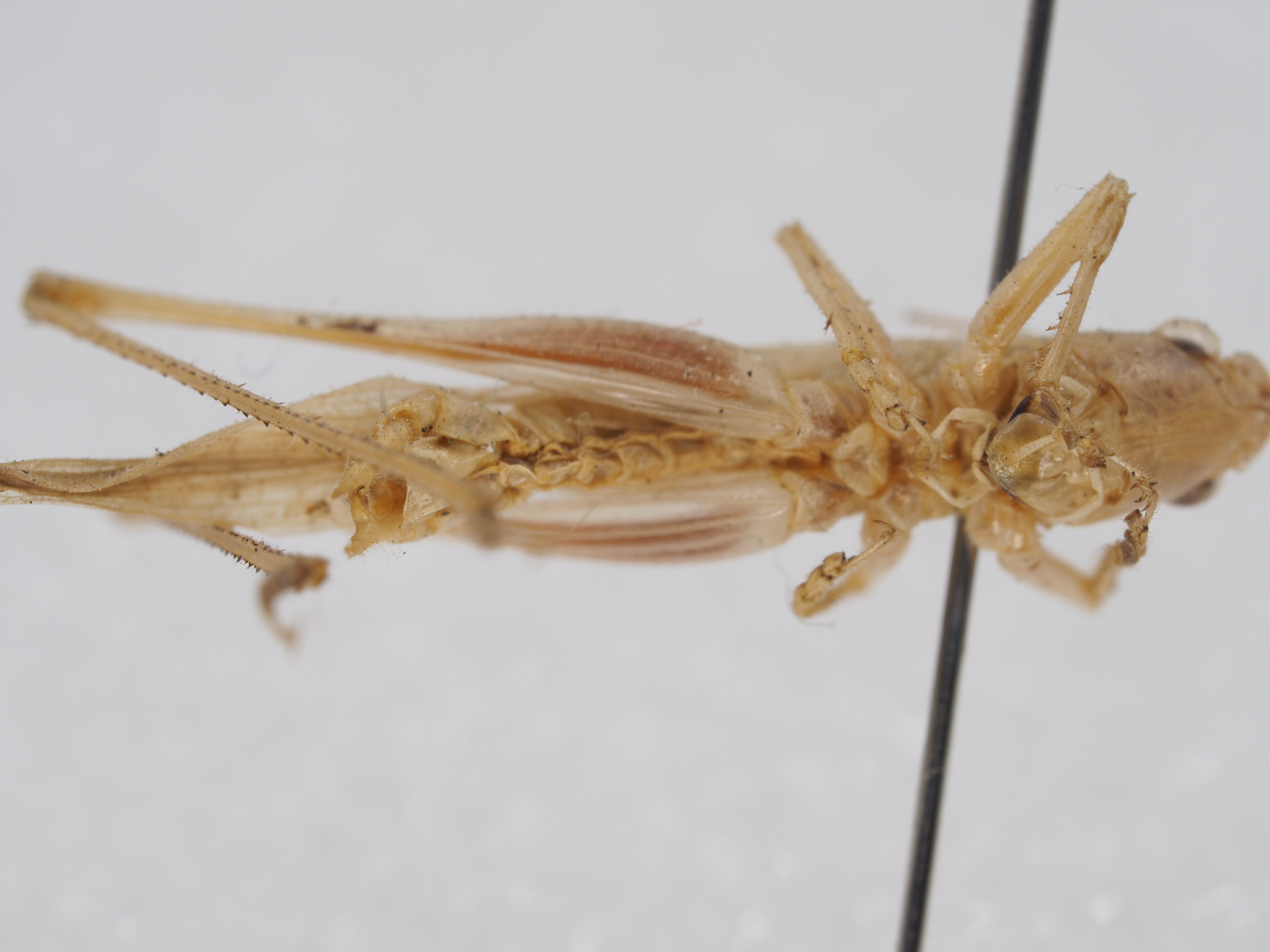 wings, but surpass hind femora. Tympanum on fore tibiae closed. Mid femora with two spines on knees. Hind