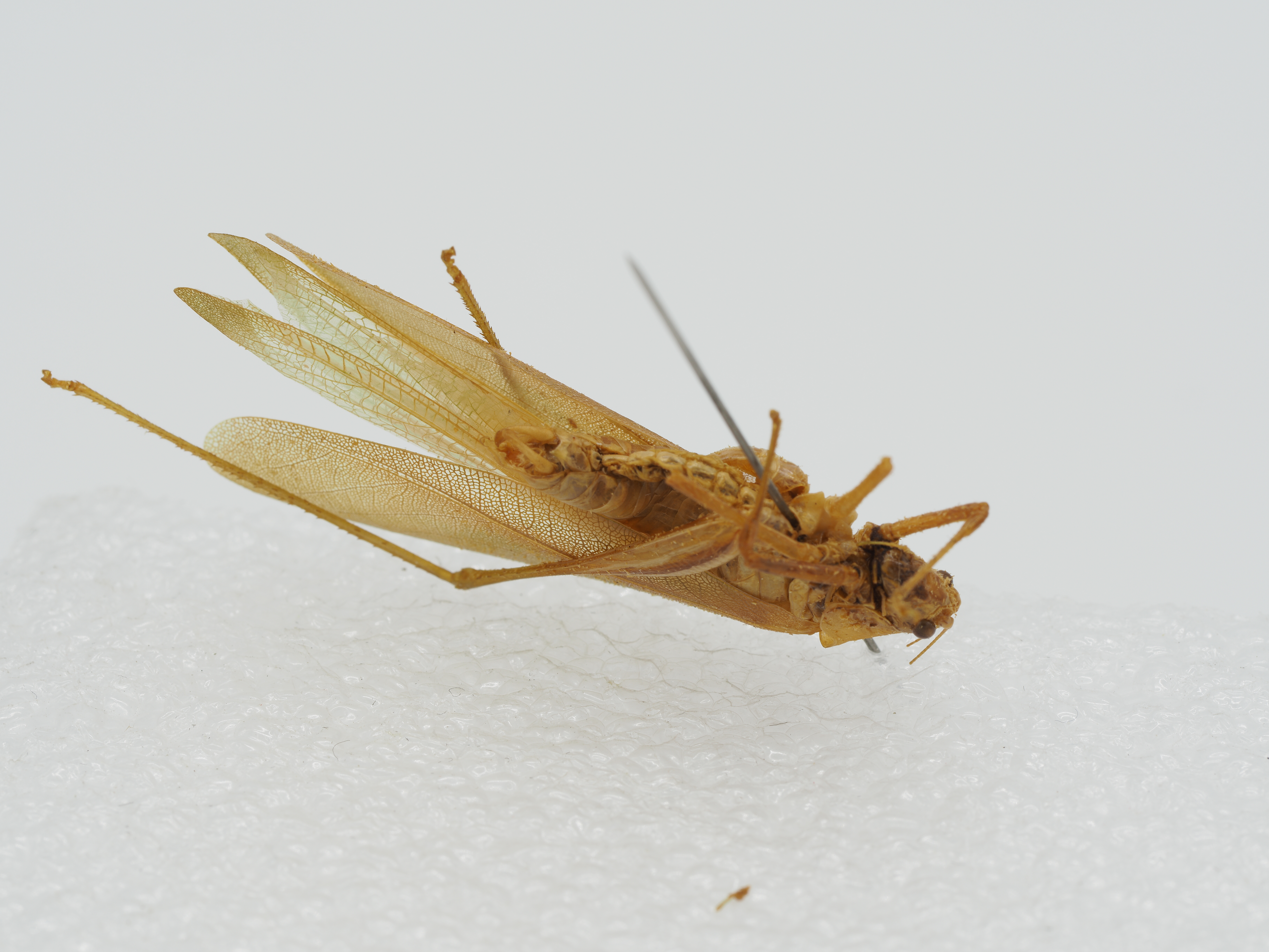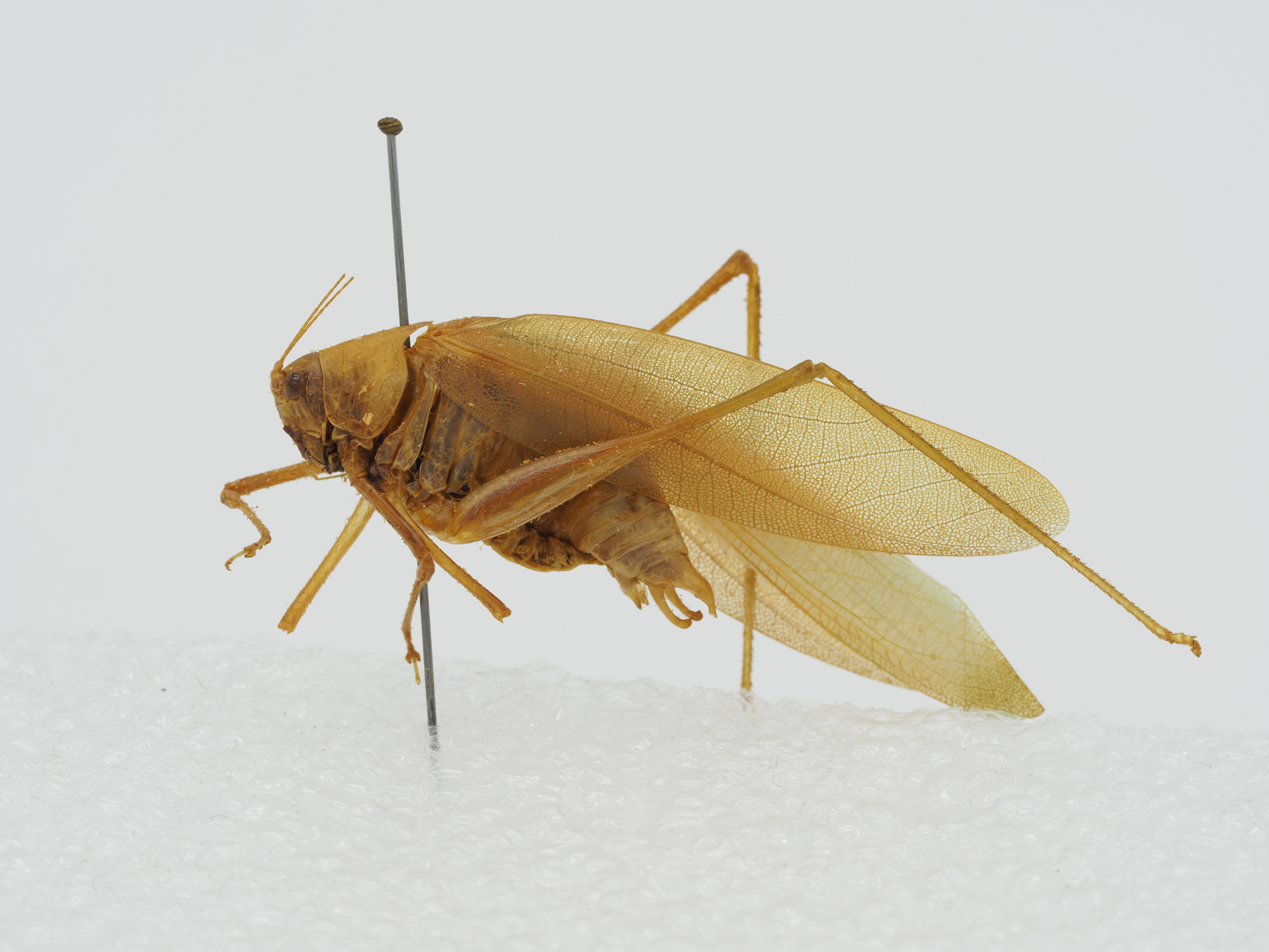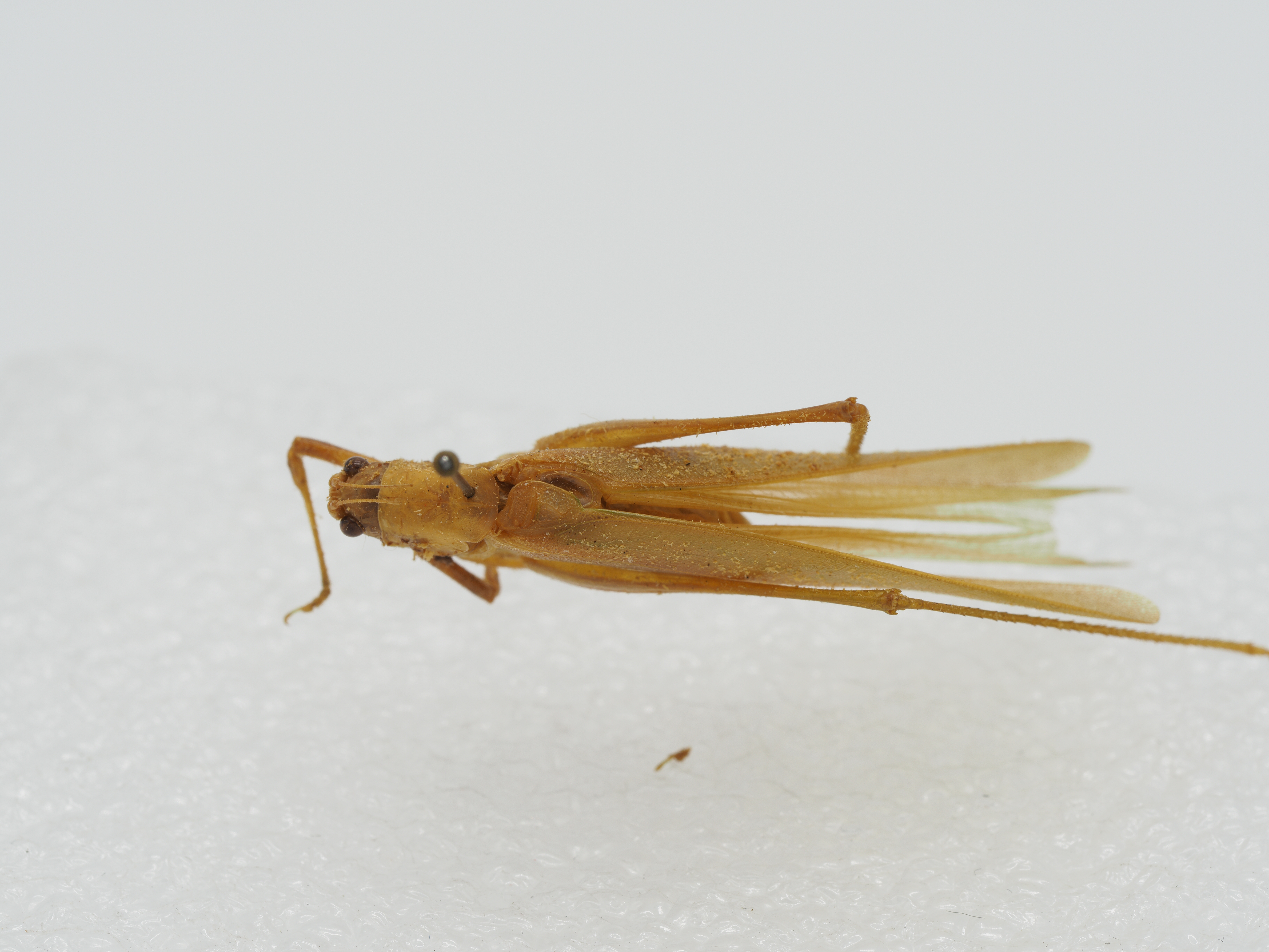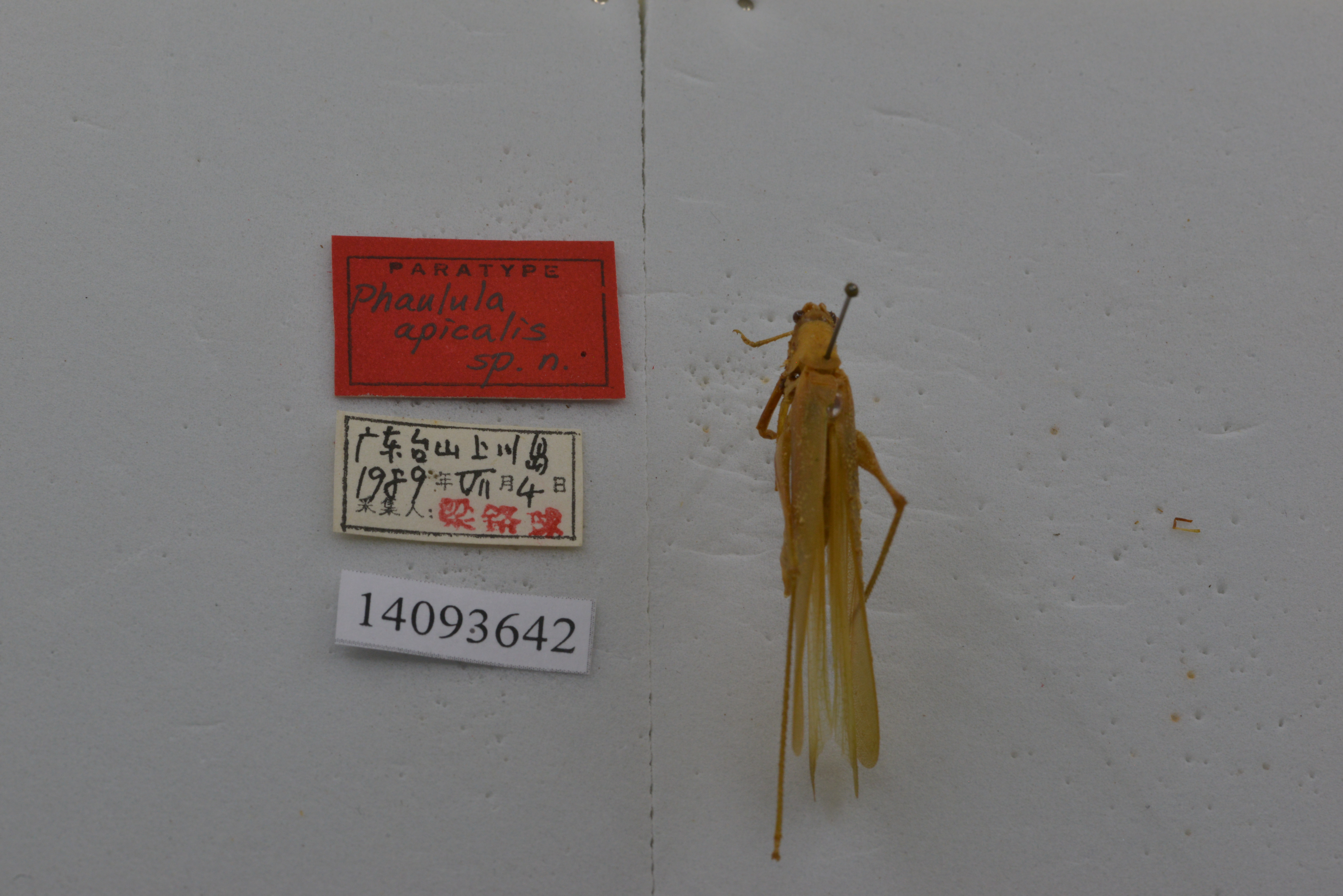 描述:Description. Female (holotype). Size median. Fastigium verticis dorsally sulcate, with apex obtuse, not deflexed, narrower than the first segment of antennae, not joining the fastigium frons. Antennae thin, long, flexible. Compound eyes produced. Pronotal disc with prozona smooth and metazona flat, with longitudinal median carina complete and without lateral carina; anterior margin approximately straight, posterior margin obtuse rounded; median transverse furrow “V”-like; lateral lobe of pronotum higher than long, with anterior margin slightly concave, ventral margin oblique backwards, and posterior margin slightly obtuse; humeral sinus distinct. Tegmen extending beyond apex of posterior femur, hind wing longer than tegmen. Costa vein not distinct, Sc and R running close until the middle of tegmen. Rs vein branching from the middle of the tegmen, not bifurcate; R stem also with more 3 lateral branches to the posterior margin of tegmen. Anterior coxae with a distinct spine. Anterior femur with 5 interior ventral spines; median femur with 4 exterior ventral spines; posterior femur with 5 exterior and 7 interior ventral spines. Anterior tibiae dorsally sulcate; median femur with 3 interior dorsal spines; posterior tibiae with 32 exterior and 35 interior dorsal spines. Each genicular lobe with 1 large and 1 small spines. Supra-anal plate triangular. Cerci conical, incurve. Ovipositor rather narrow, as long as two and a half times of length of pronotum, with lateral surface smooth, apex of dorsal margin sharp, apical sixth part of dorsal margin and apical 1/4 part of ventral margin crenulated (Plate 3f). Subgenital plate pentagonal, with lateral margin convex, and apical margin obtuse (Plate 3g). Male. Structure of tegminal veins similar to the female (Plate 2a). Stridulatory file on underside of left tegmen cambered on the whole, basal eighth part with about 20 fine teeth, which gradually becoming larger distad, and remaining seven eighths part with about 50 densely arranged equal-sized big teeth (Plate 2f, 3a). Tenth abdominal tergum strongly produced, in dorsal view, base widest, gradually narrowed until distal fifth, which bearing approximately parallel lateral margins, and wide triangular apical margin (Plate 2e, 3b); in lateral view, apical half slightly deflexed, with apical margin truncated, middle third dorsally swollen and distinctly ventrally concave (Plate 2d, 3c). Cerci distinctly longer than subgenital plate (Plate 2d, 3d). Subgenital plate with basal part wide, short, distal 2/5 slightly contracted, trapeziform, gradually narrowed, apical margin with a rather large short triangular notch, shaped into posterior lateral false styli; ventral surface with distinct central and lateral carinae (Plate 2g, 3e). Color. Yellow green (green in life). Compound eyes brown. Antenna yellowish green. Tegmen green.