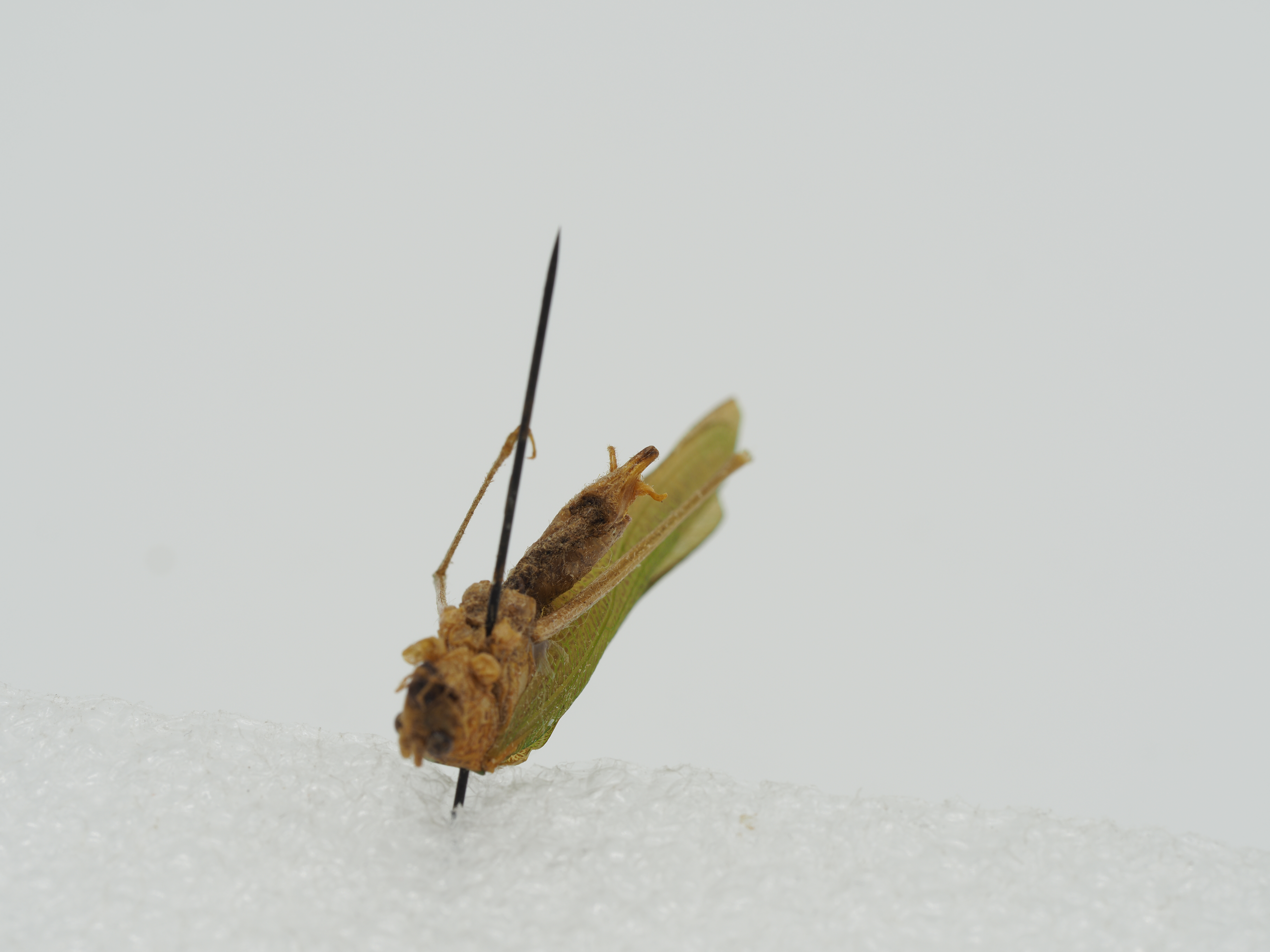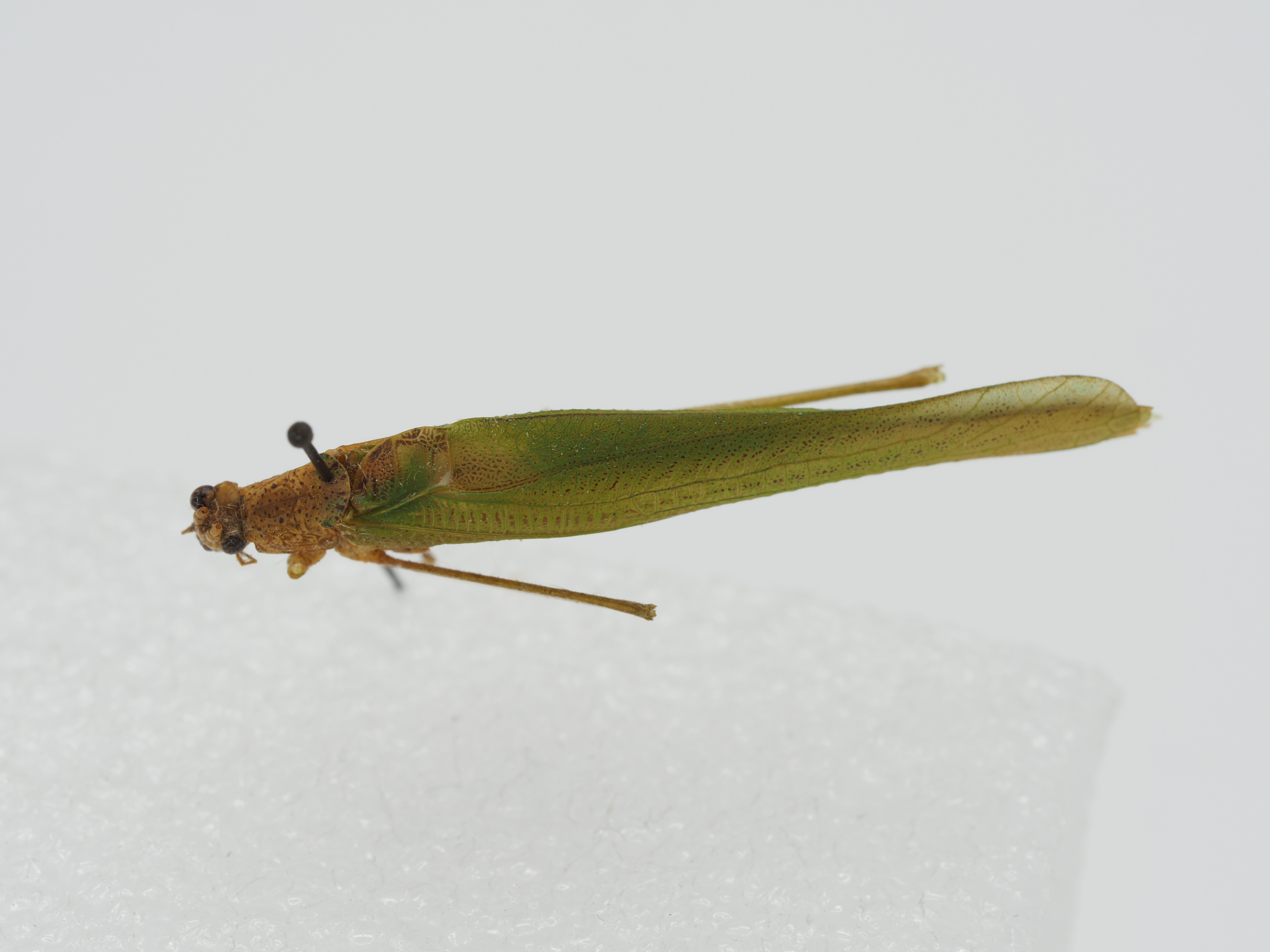 Color: Body green. Compound eyes brown. Pronotal disc densely covered with numerous scattered brown