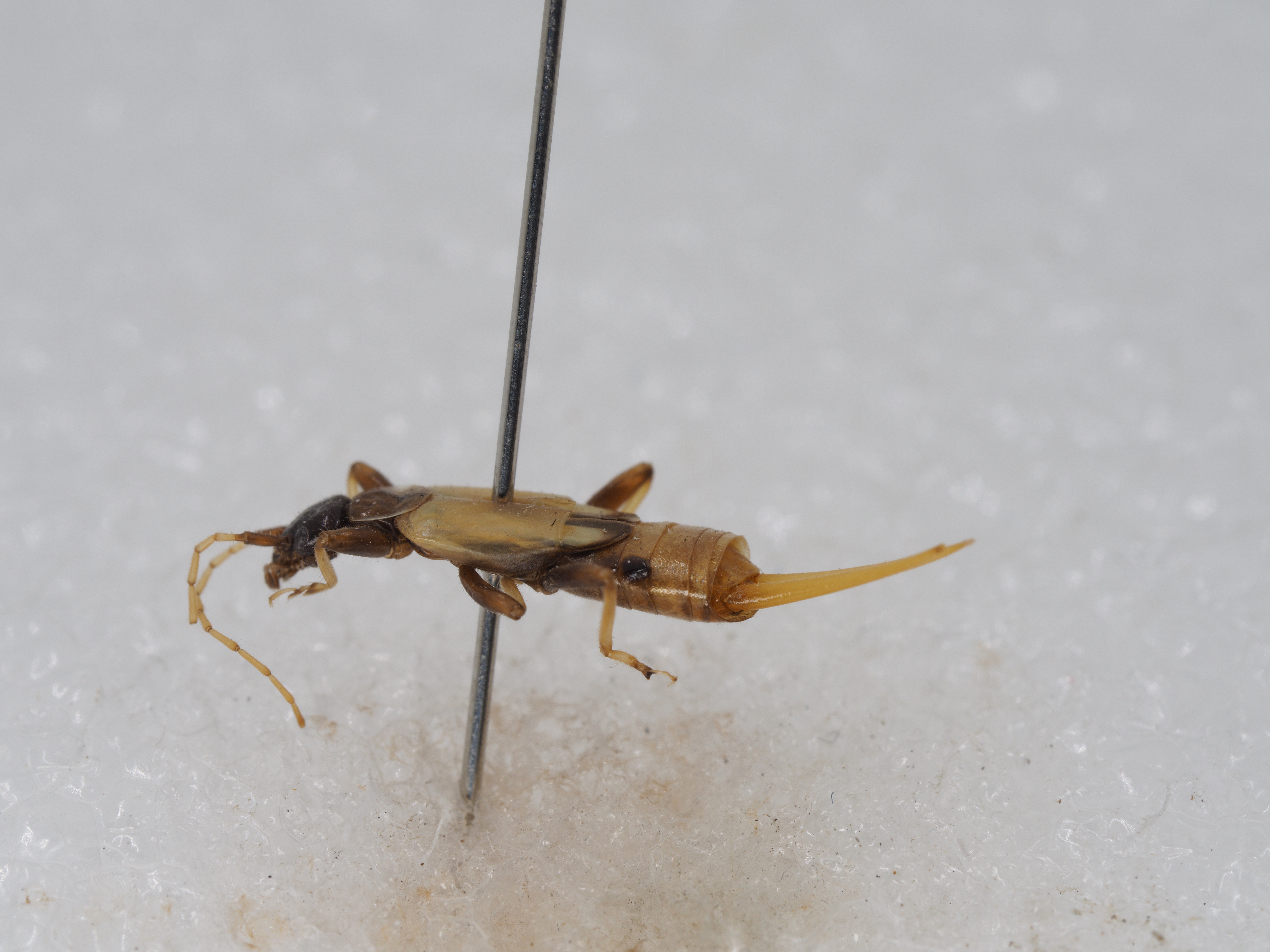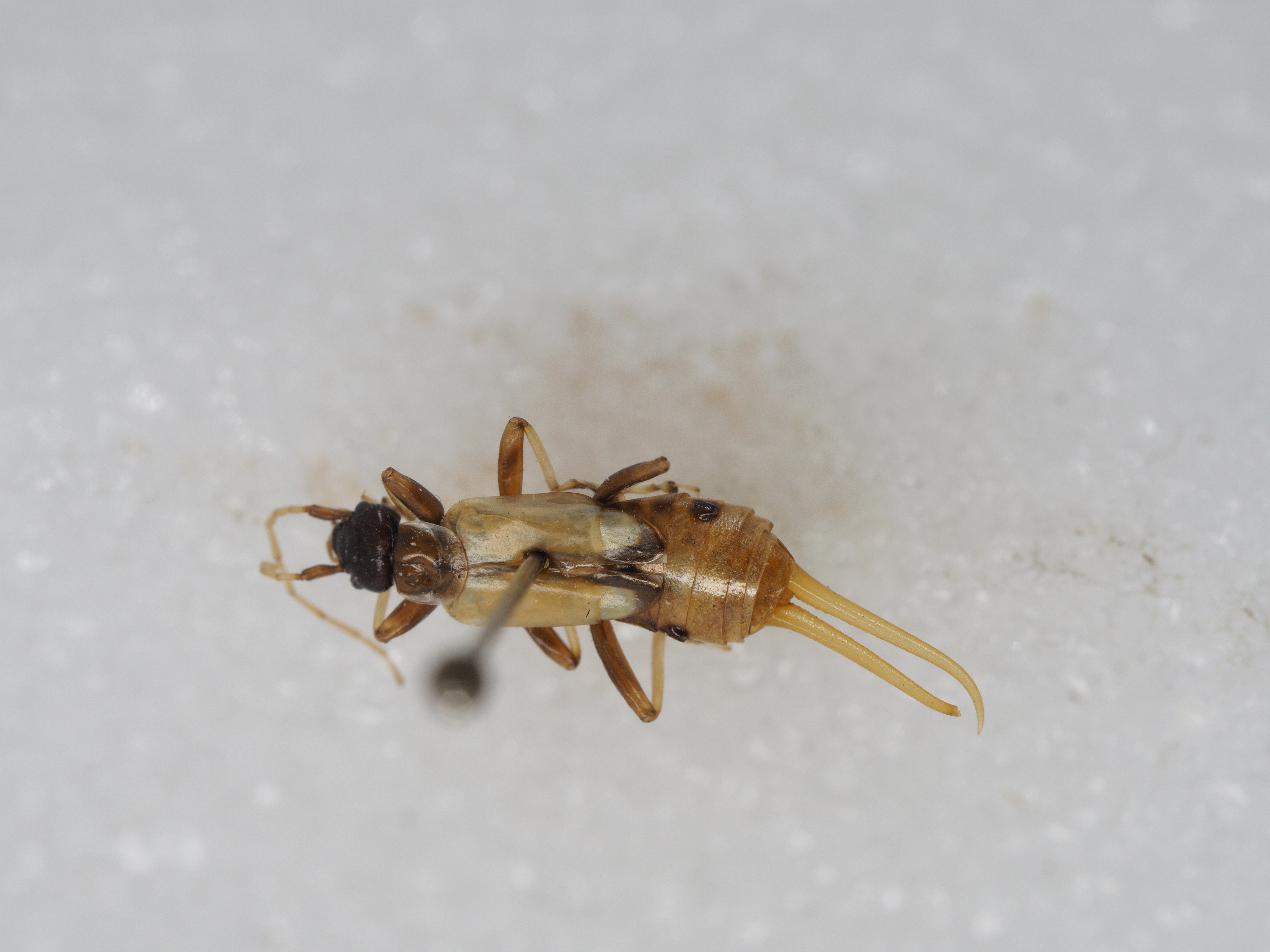 描述:Description. Male size medium, body depressed. Head smooth, slightly swollen. Eyes prominent, length slightly shorter than genae, lateral margins rounded, sutures indistinct. Antennae long and slender, 13 joints, first joint decidedly longer than the distance between the antennal bases; third and fourth joints almost equal in length, cylindrical, but shorter than fifth. Pronotum smooth, almost as broad as long, anterior margin truncate, posterior very feebly rounded, lateral margins weakly convex, hind margin rounded; prozona slightly swollen, median sulcus distinct, with paired depressions on both sides, metazona flat. Elytra and wings fully developed. Elytra smooth, about twice as long as pronotum, external margins without ridge, anterior margins truncate. Scales of wings slightly shorter than pronotum, smooth. Legs rather short, anterior femora thick, hind tarsus with first joint almost equal to third joint, second joint strongly enlarged. Abdomen very depressed, stink-glands feeble but distinct. Last dorsal segment narrowed to the apex, above with two oblique ridges and united short, stumpy tubercles (Fig. 1). Subgenital plate with some punctations, posterior margin broadly rounded (Fig. 2). Pygidium not prominent, apex with short, stumpy tubercles. Forceps widely separated at base, narrowed to the apex and incurved, with strong dorsal tooth and smaller median tooth (Fig. 3), sometimes the median tooth absent. Genitalia (Figs. 4) with aciculiform parameres, basal vesitcle with a small pilous sclerotized plate, virga short and curved. Female similar to male, but subgenital plate shorter (Fig. 5); forceps slender, simple, nearly touching at base, internal margins crenulate (Fig. 6). Coloration. Generally yellowish. Head, first antennal joint and glandular callosities black. Scales of wing yellowish, along inner and apical margin with dark band.