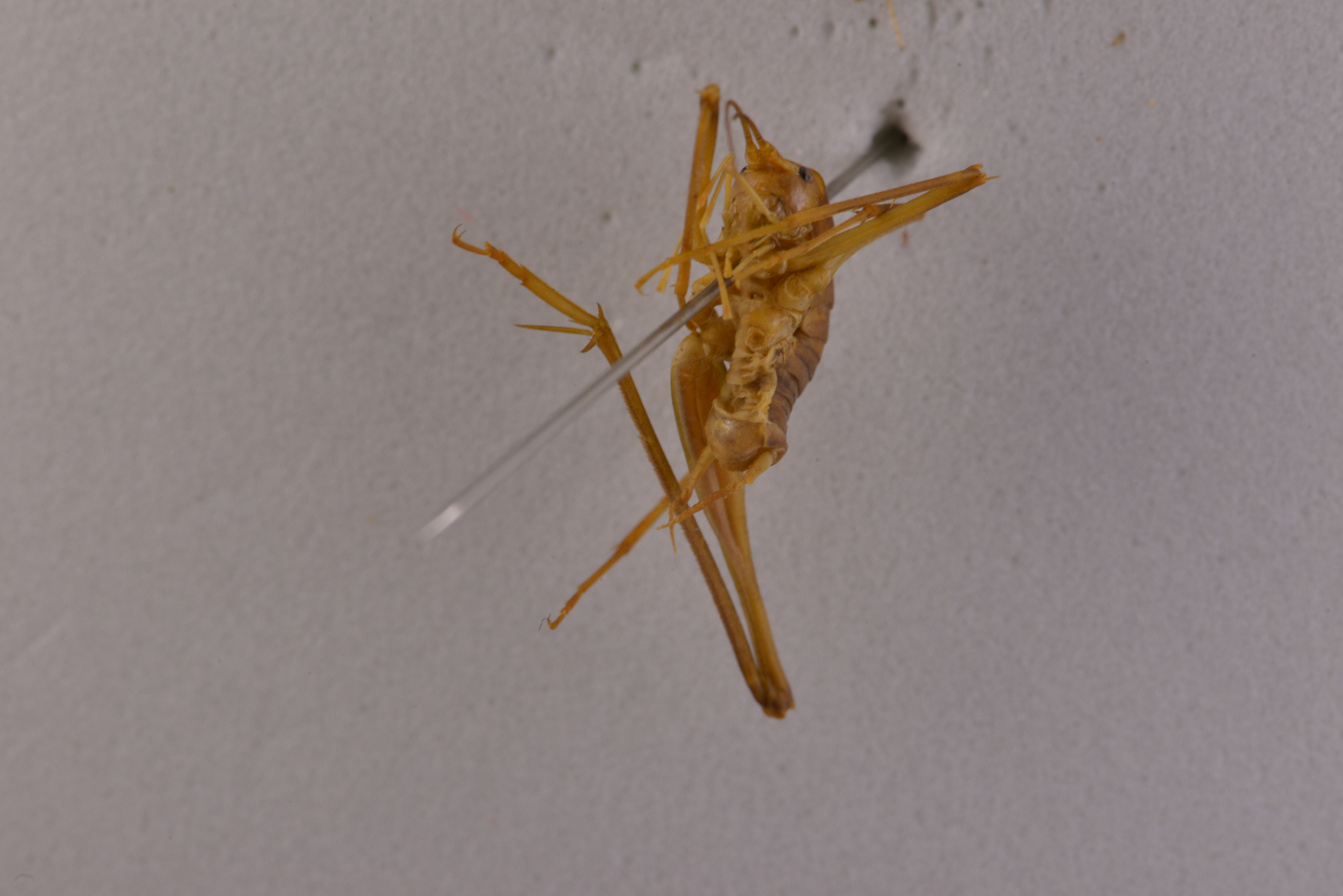描述:Male. Head with fastigium of vertex divided into two conical tubercles. Legs long and slender; Fore