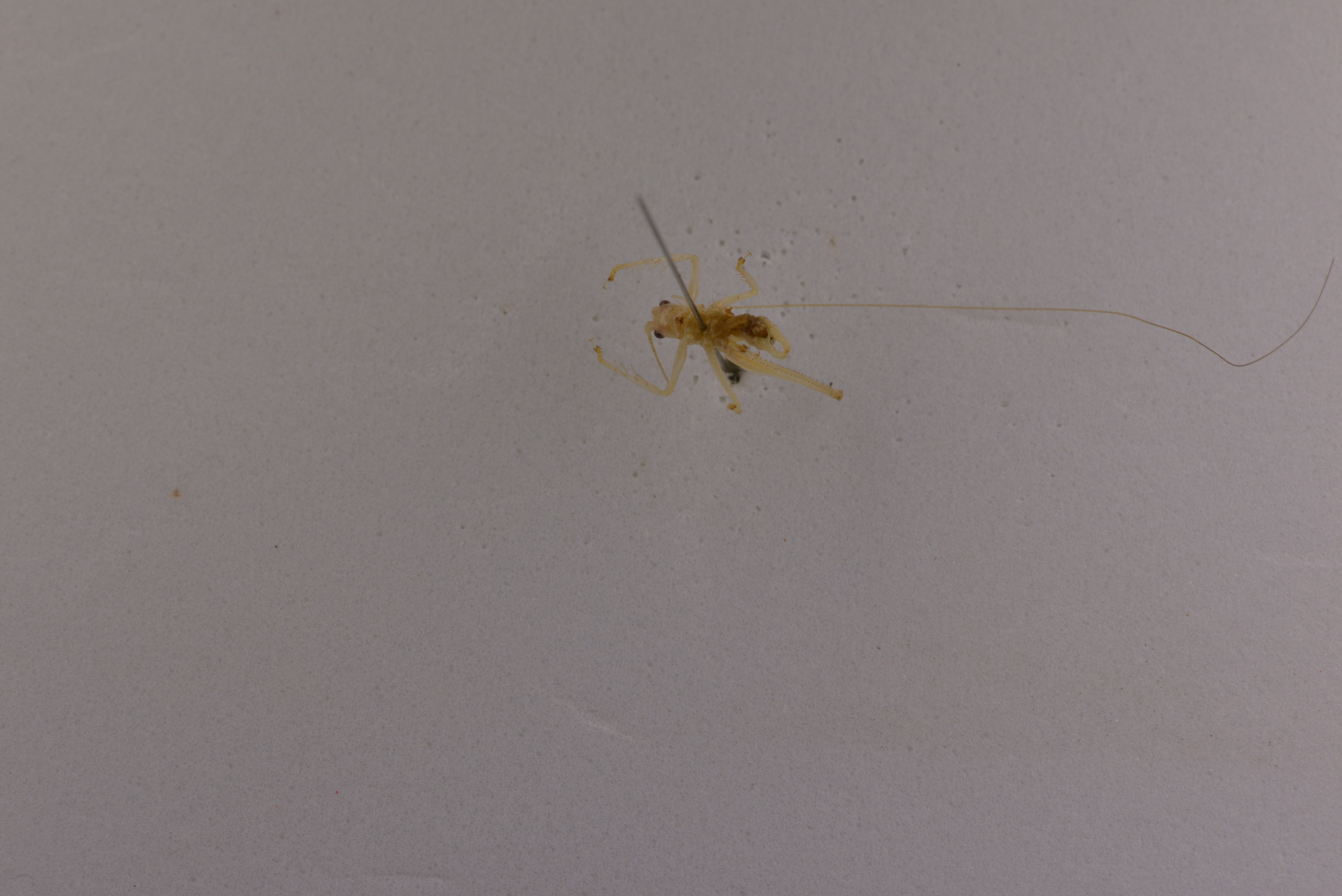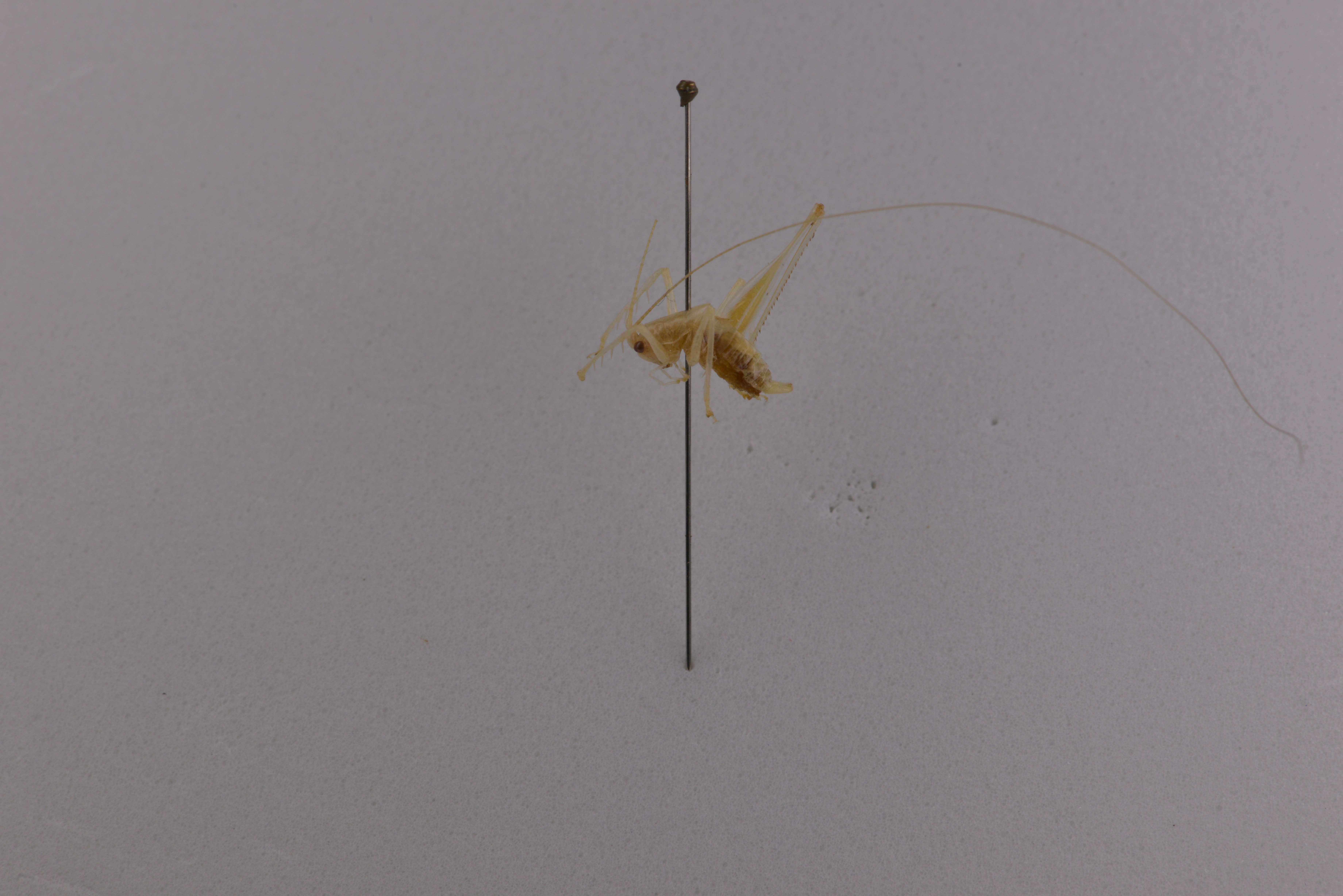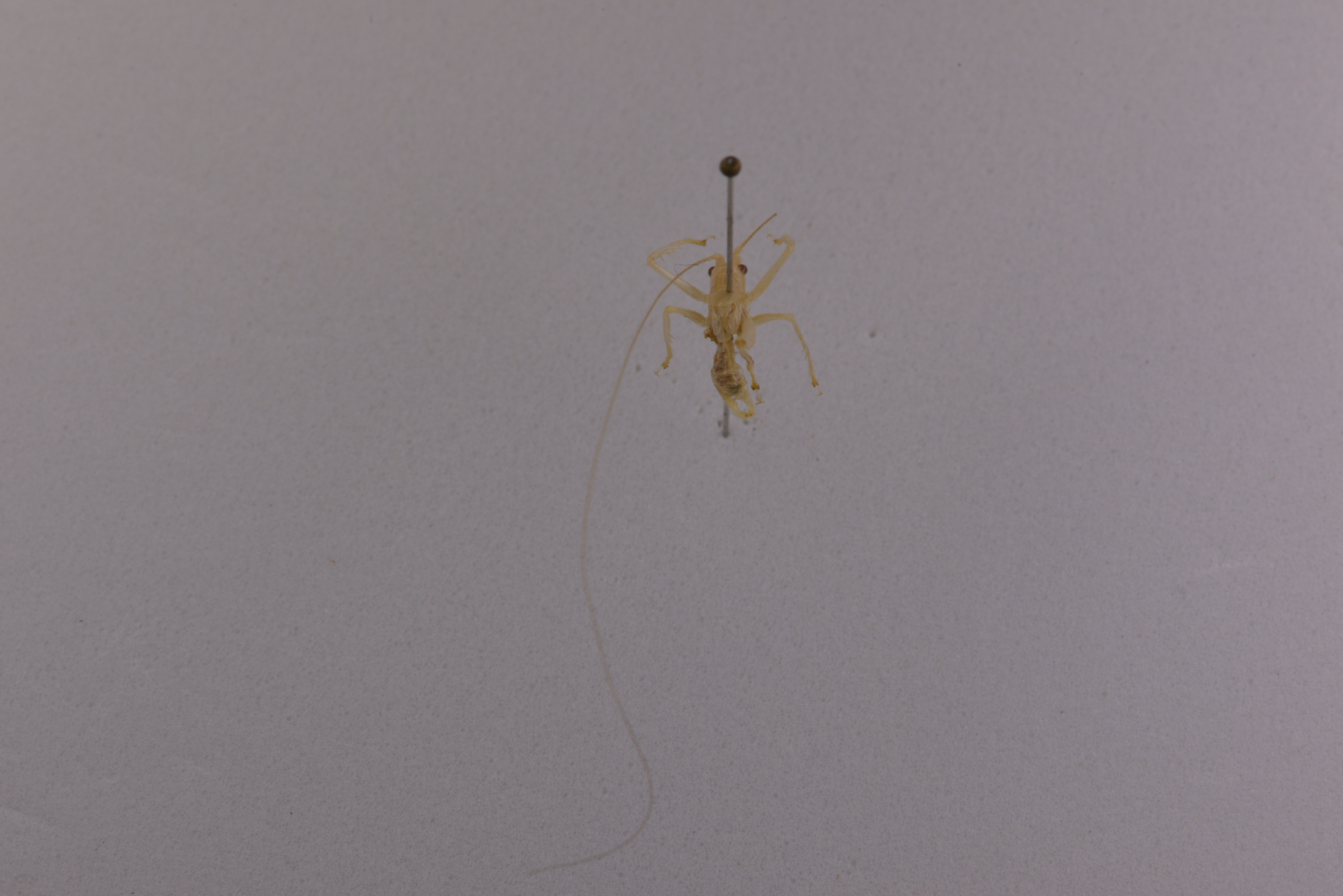 Thoracic auditory spiracle totally exposed. Tegmina short, too transparent to notice while alive, hind margin