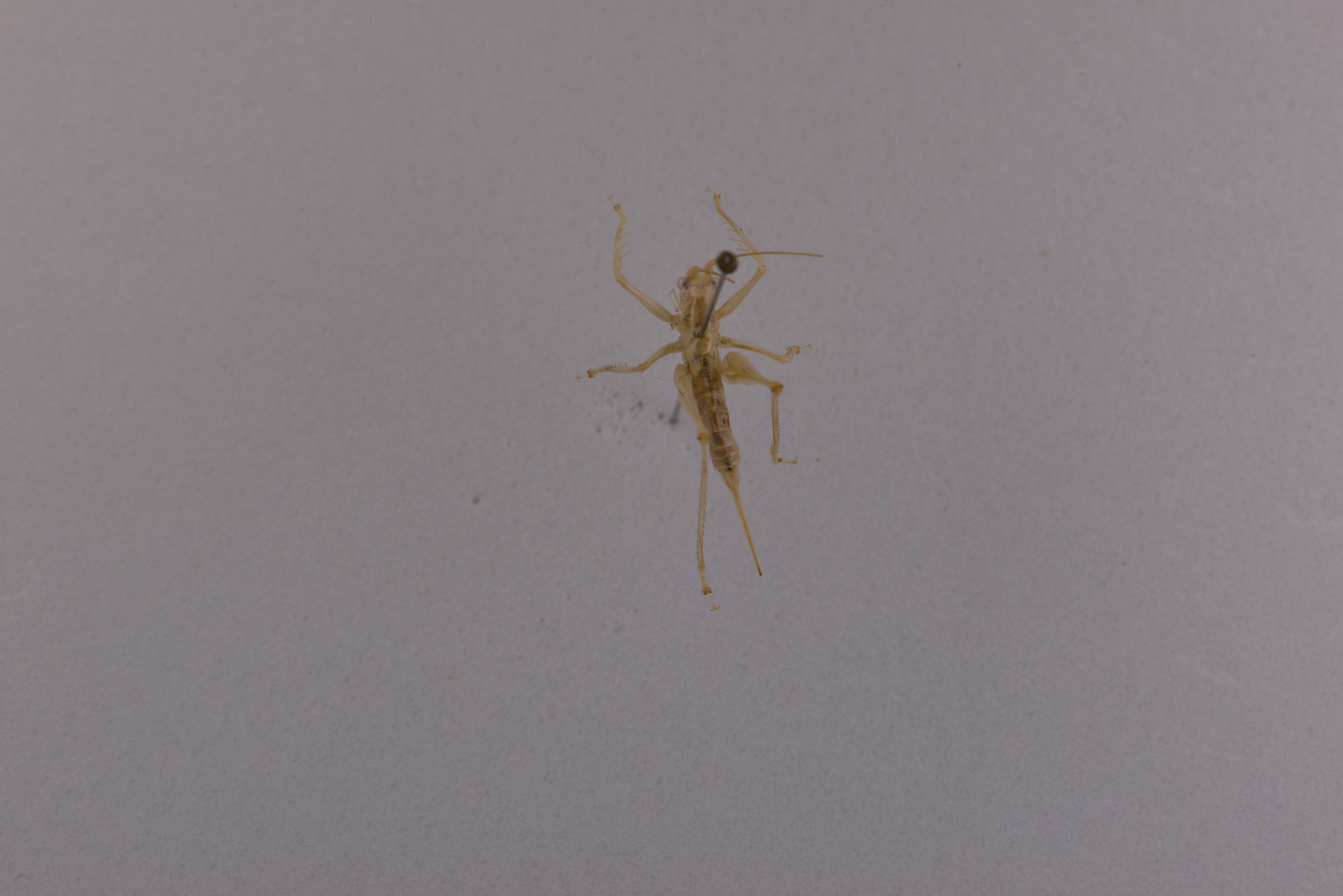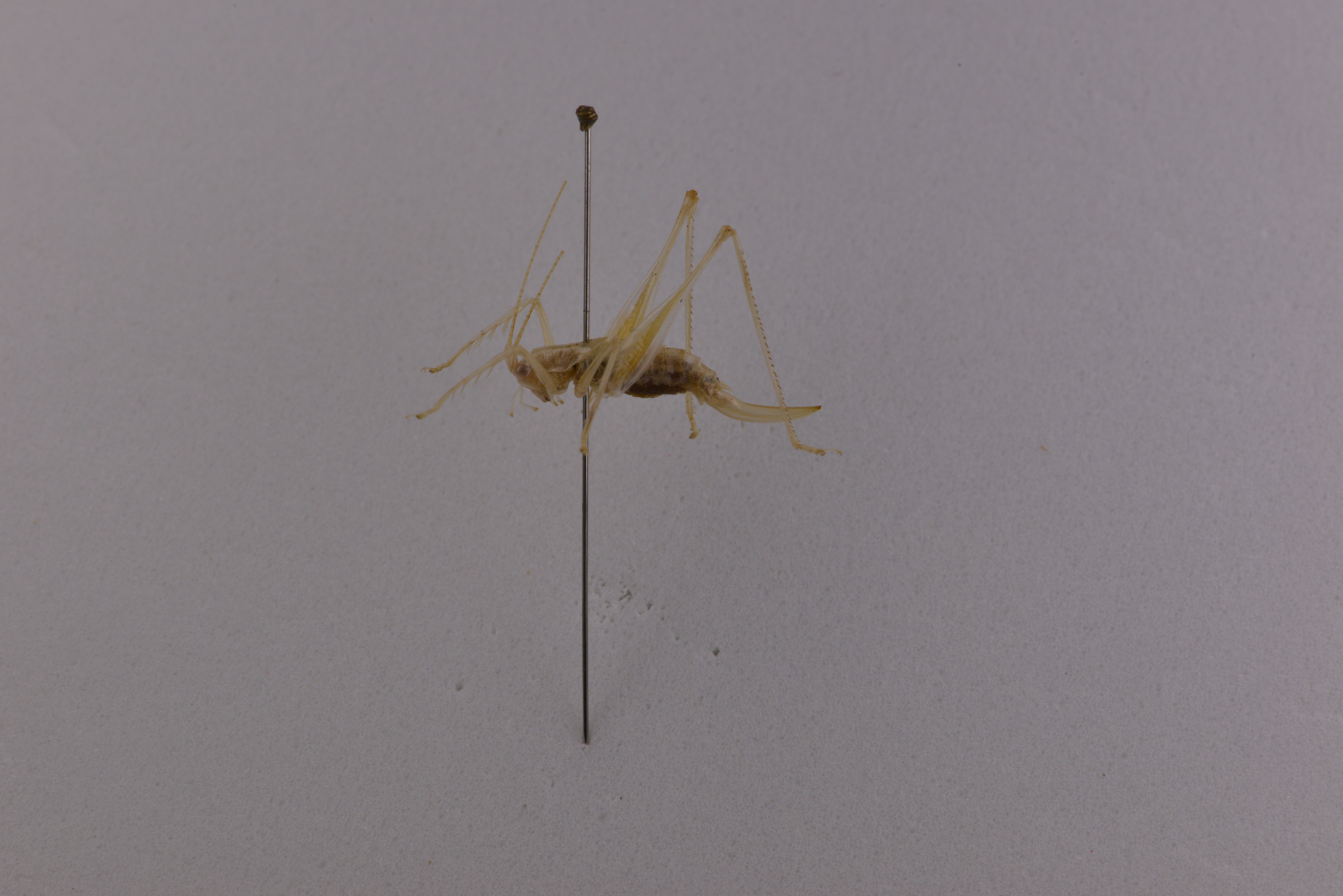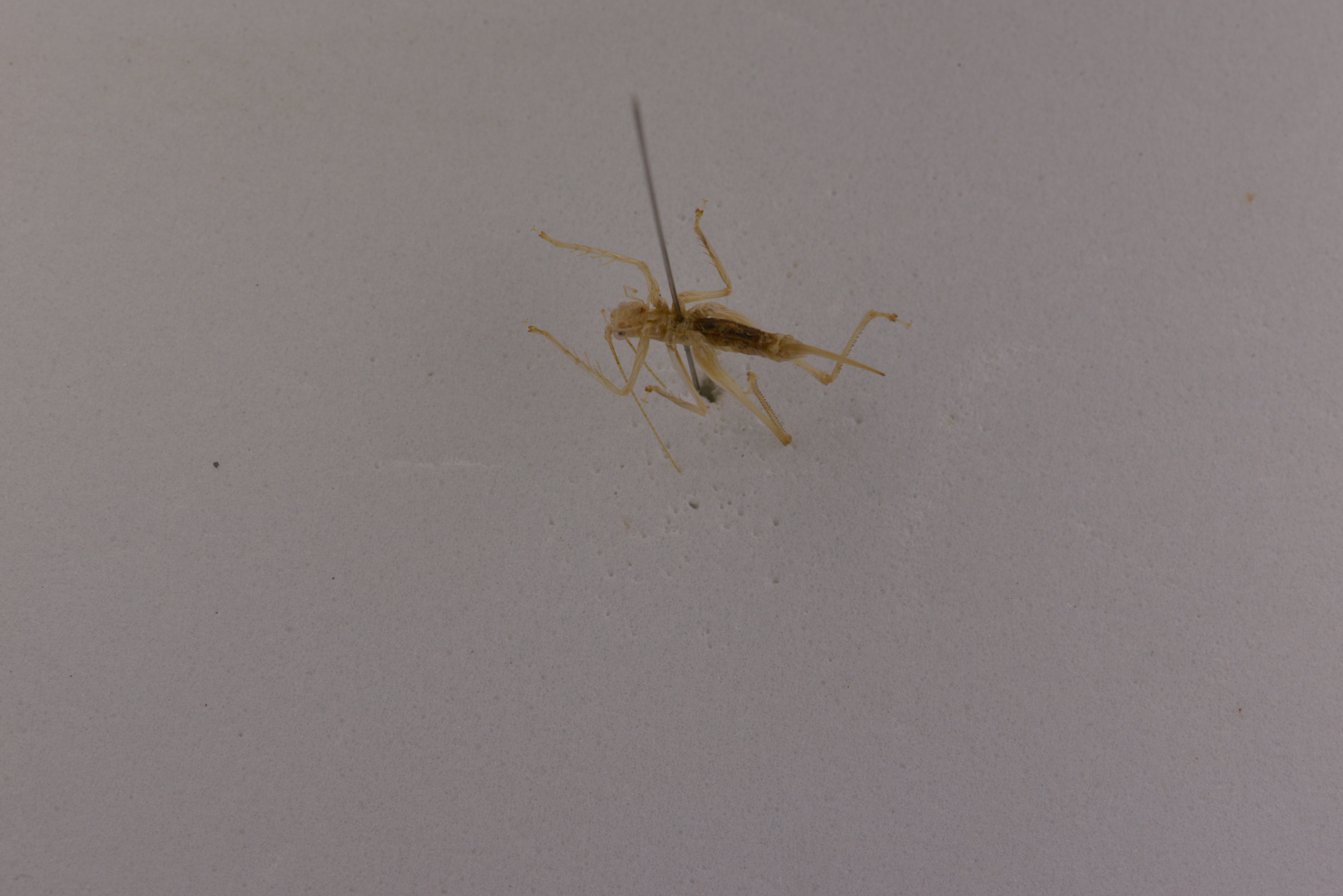 Thoracic auditory spiracle totally exposed. Tegmina short, too transparent to notice while alive, hind margin