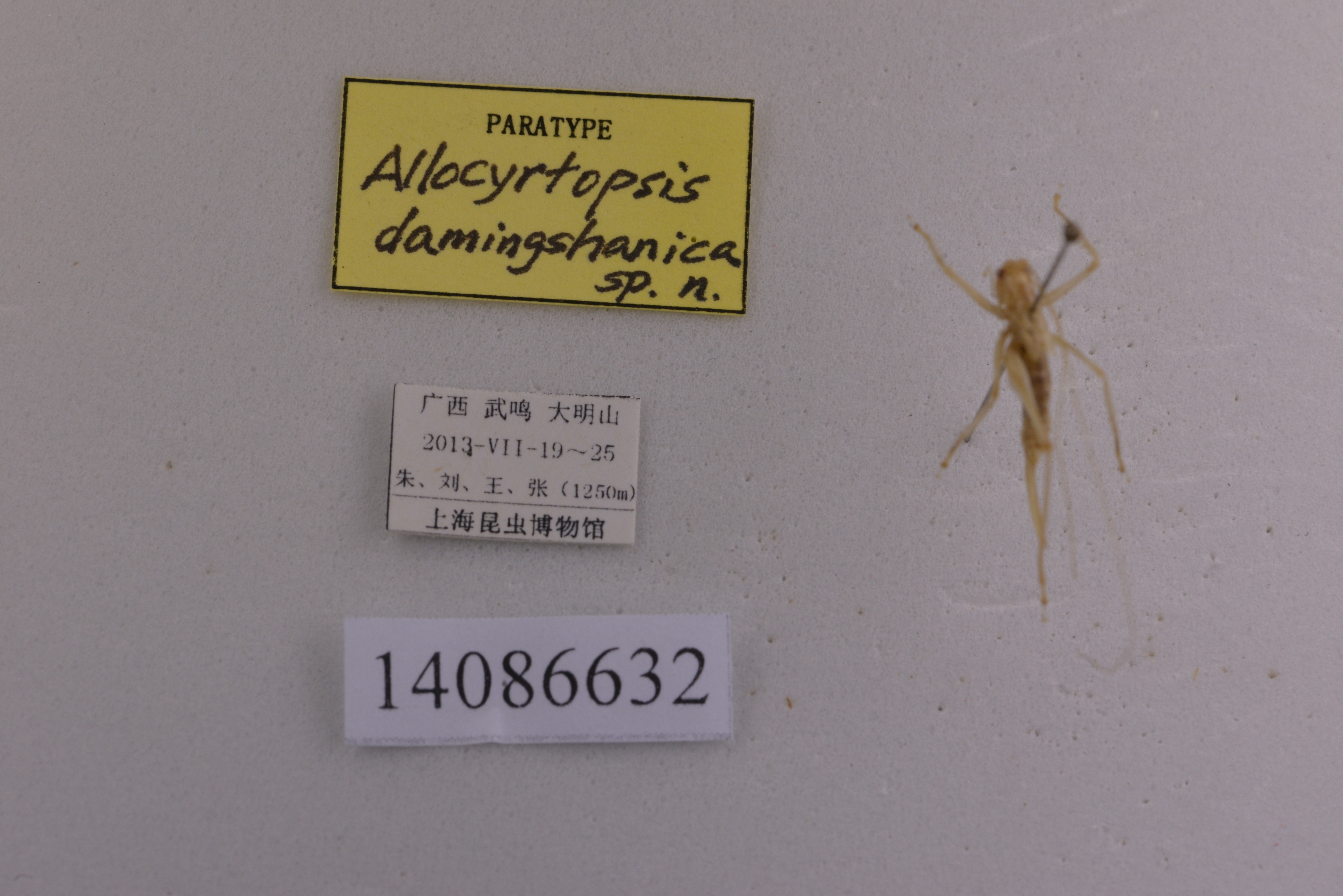 描述:Male. Fastigium of vertex conical, apically blunt and dorsally furrowed. Head hypognathous, last