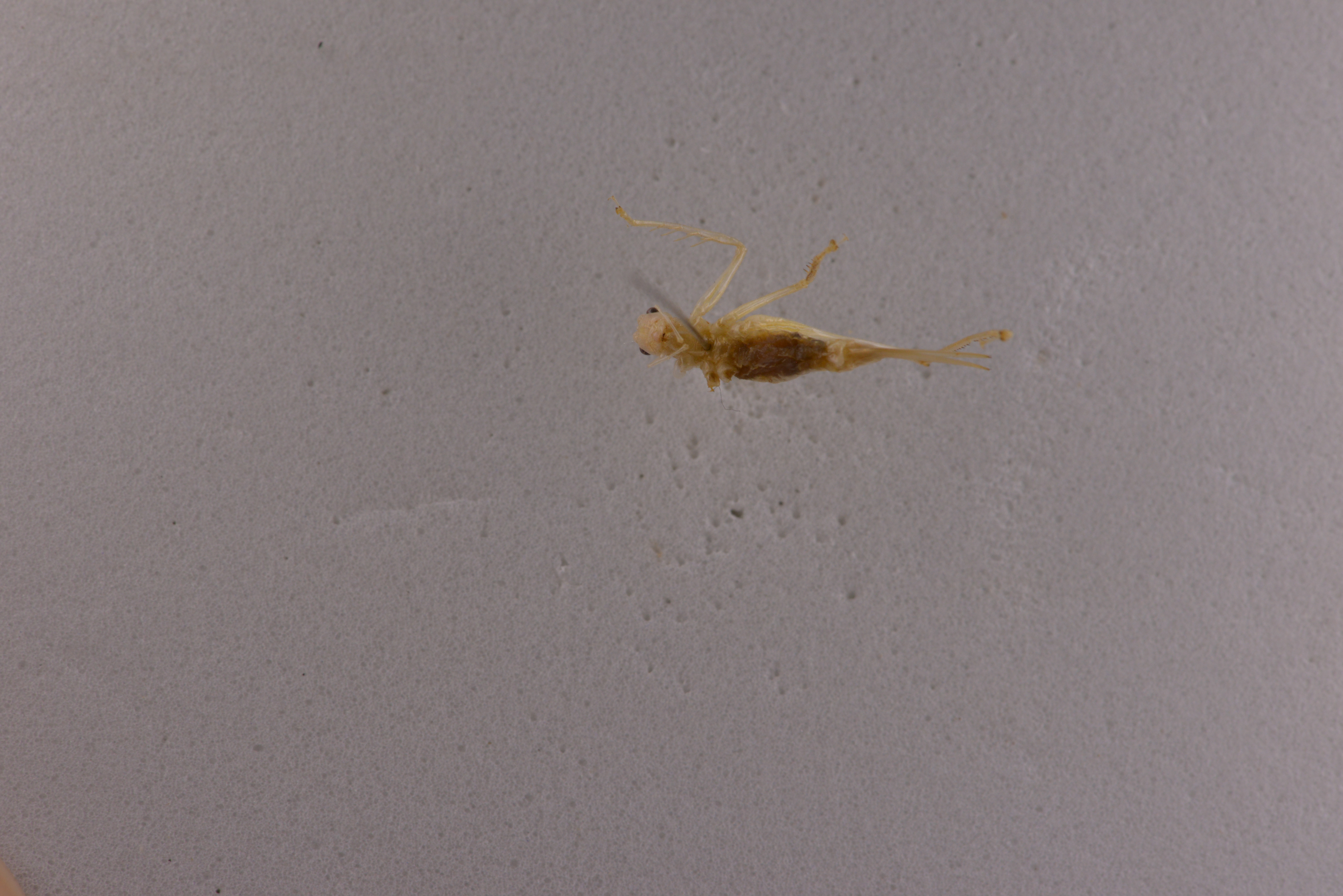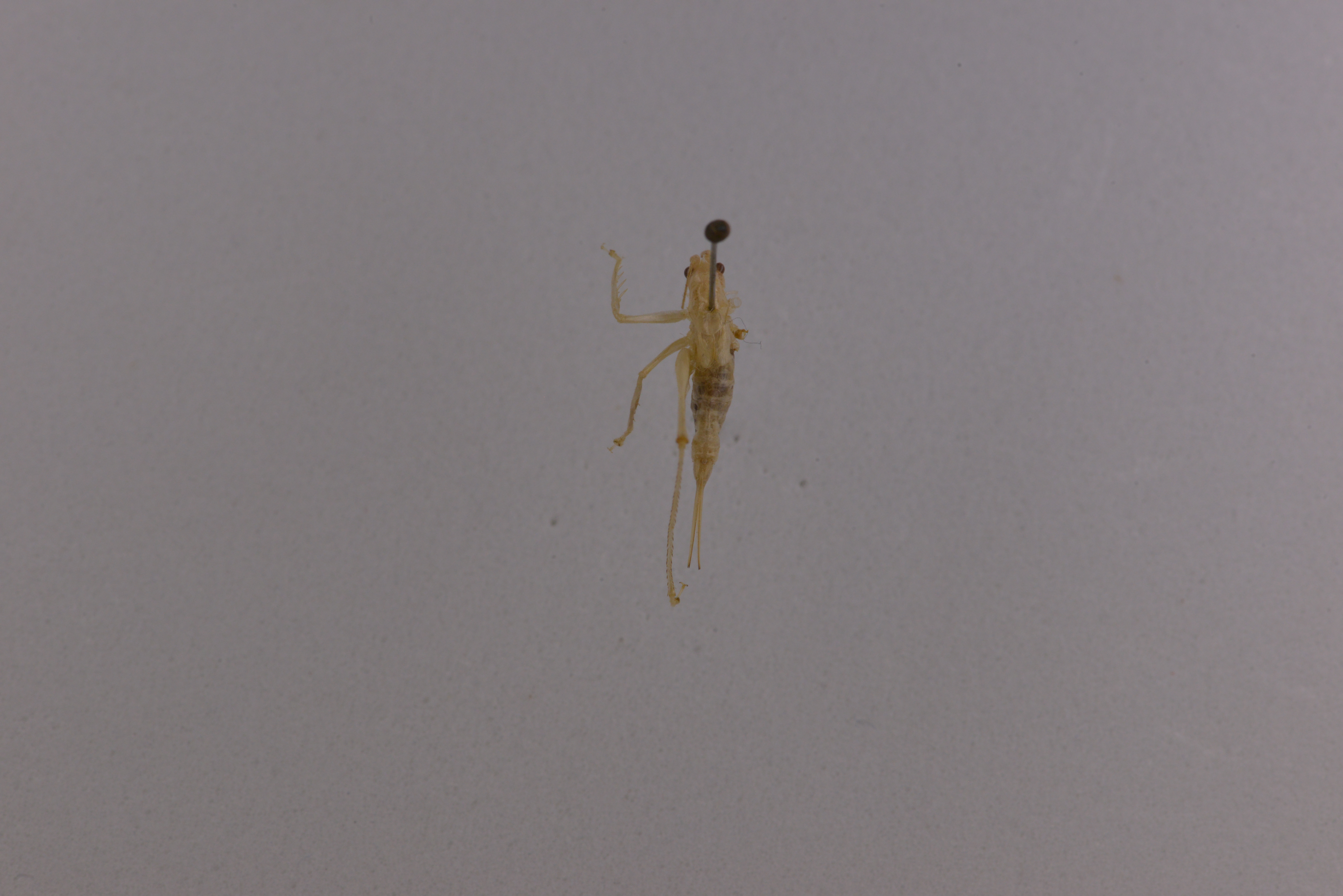 Thoracic auditory spiracle totally exposed. Tegmina short, too transparent to notice while alive, hind margin