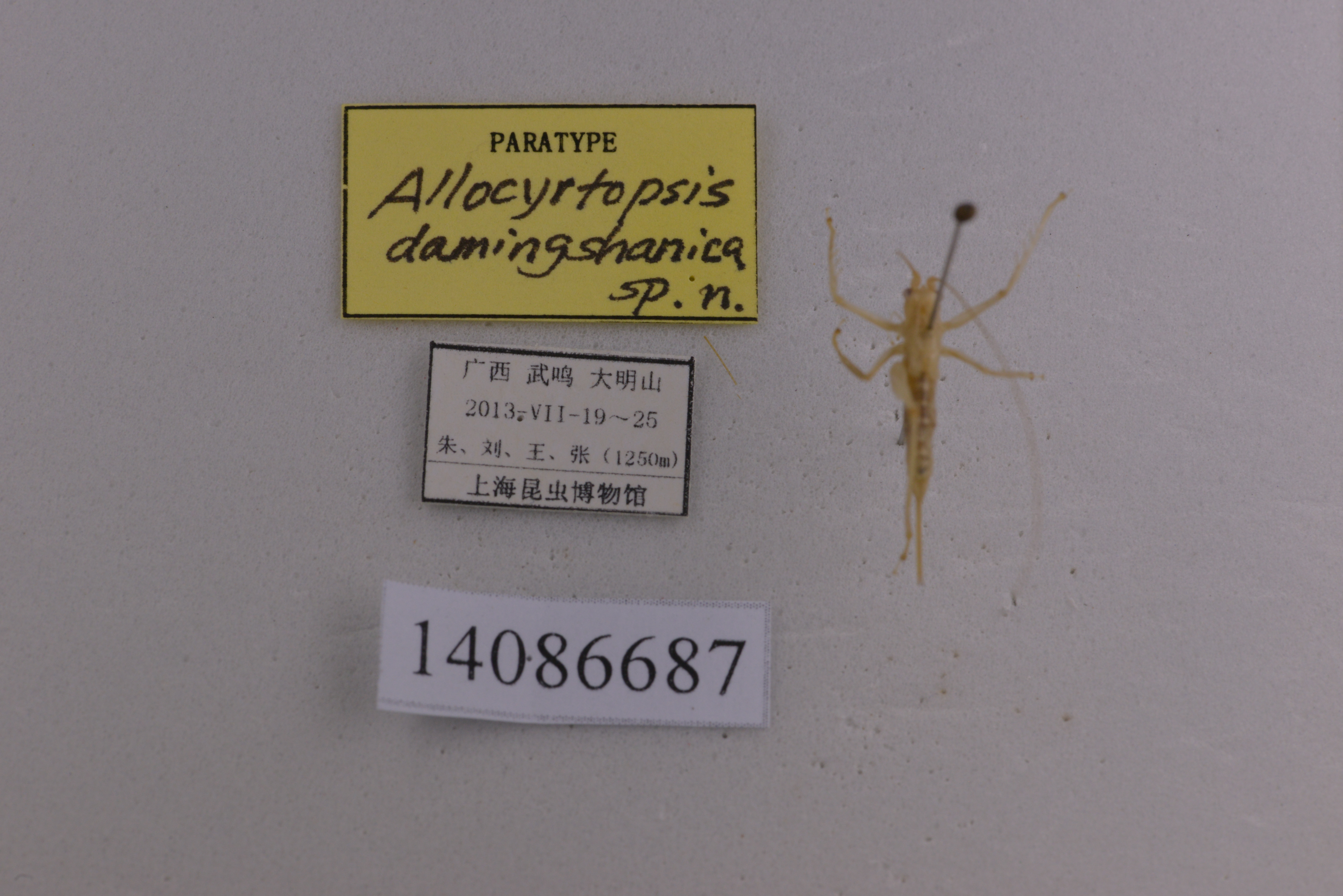 描述:Male. Fastigium of vertex conical, apically blunt and dorsally furrowed. Head hypognathous, last