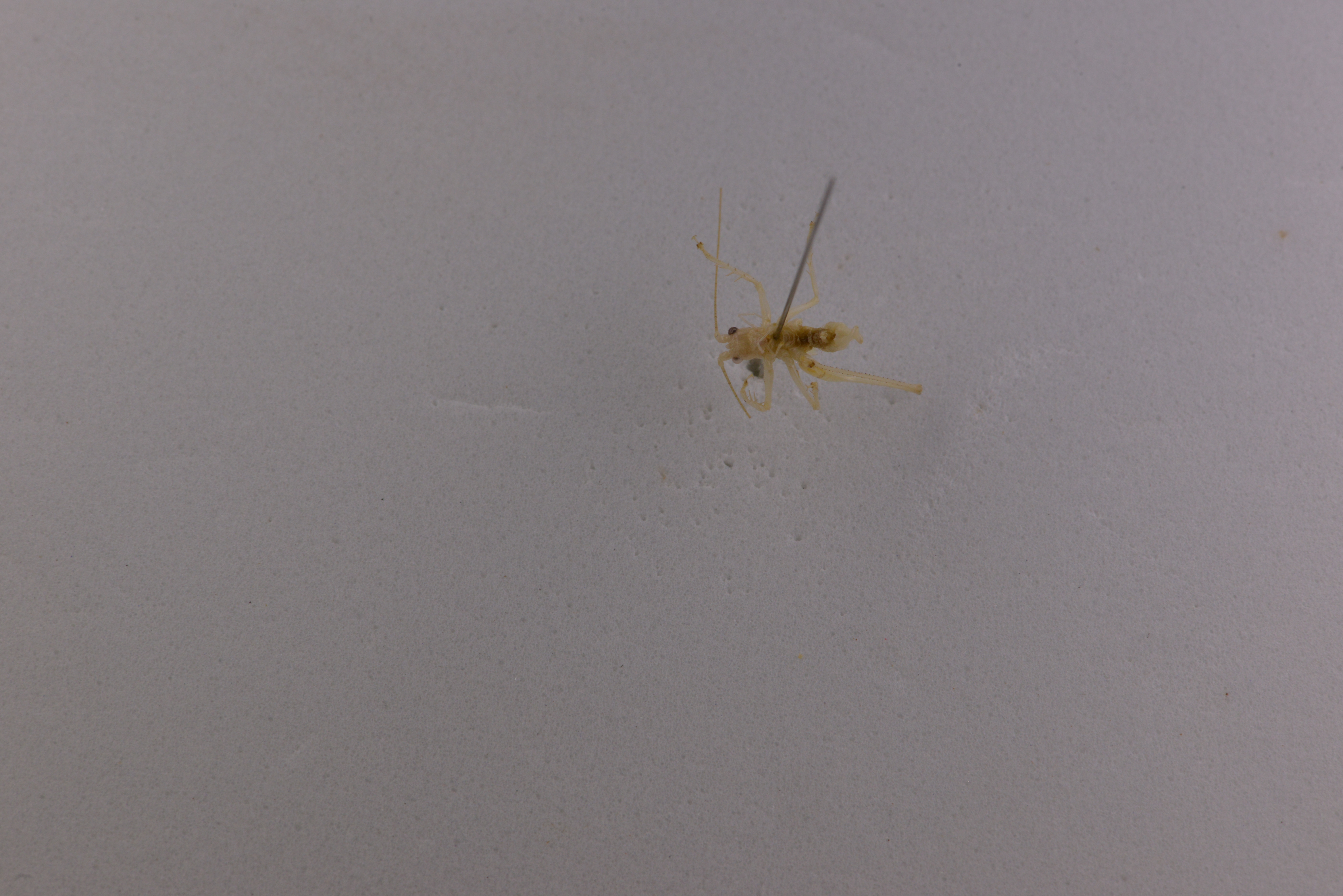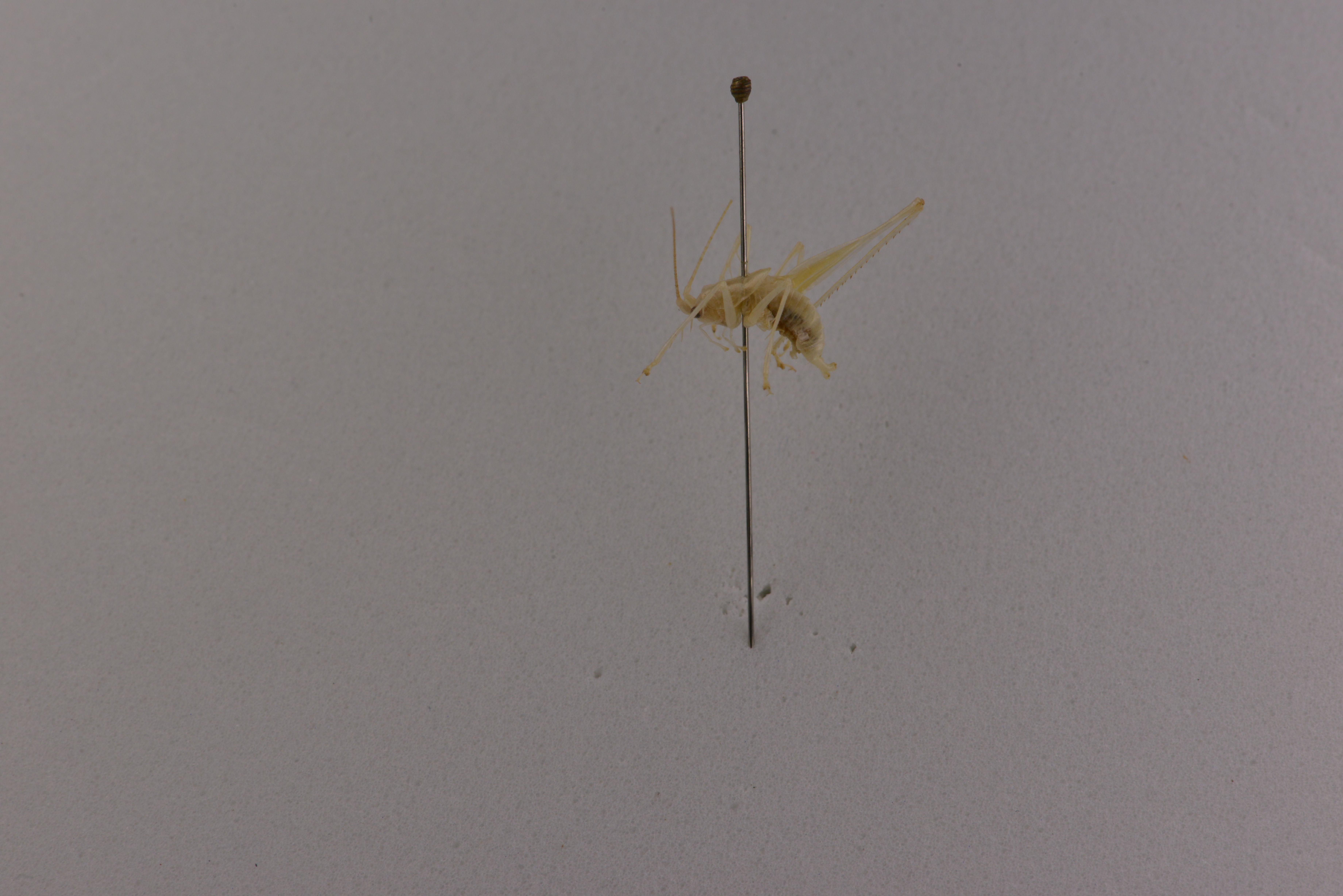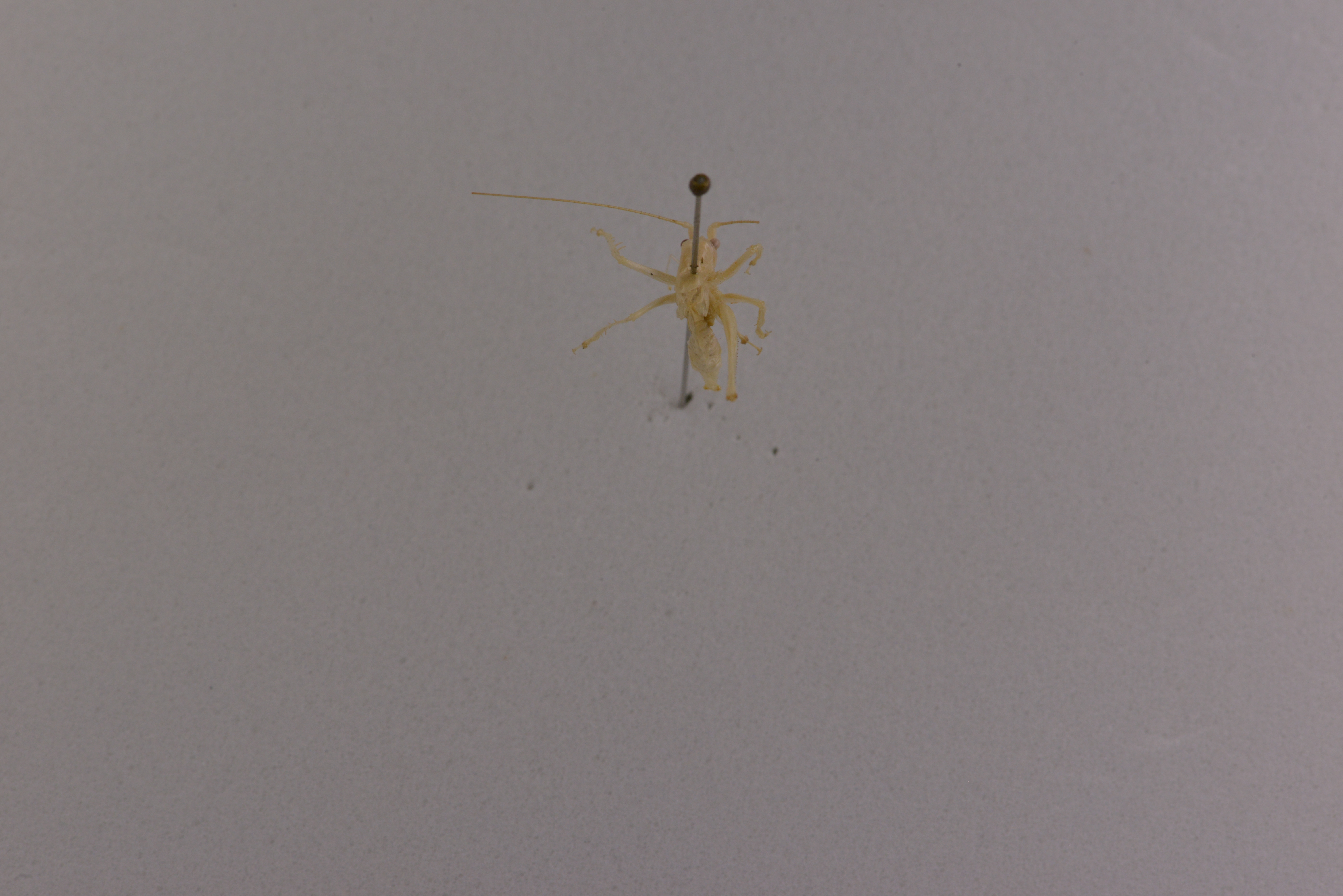 Thoracic auditory spiracle totally exposed. Tegmina short, too transparent to notice while alive, hind margin