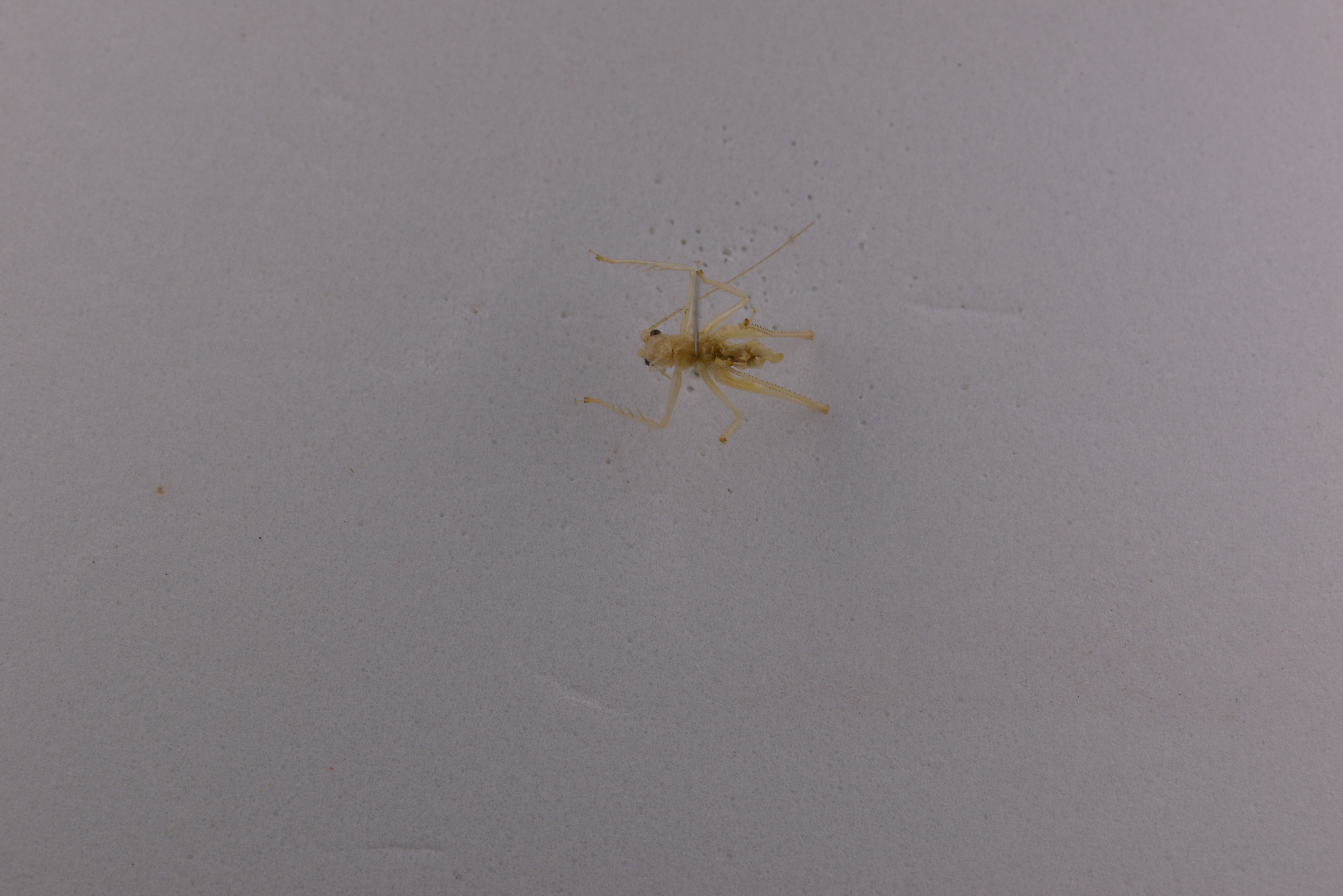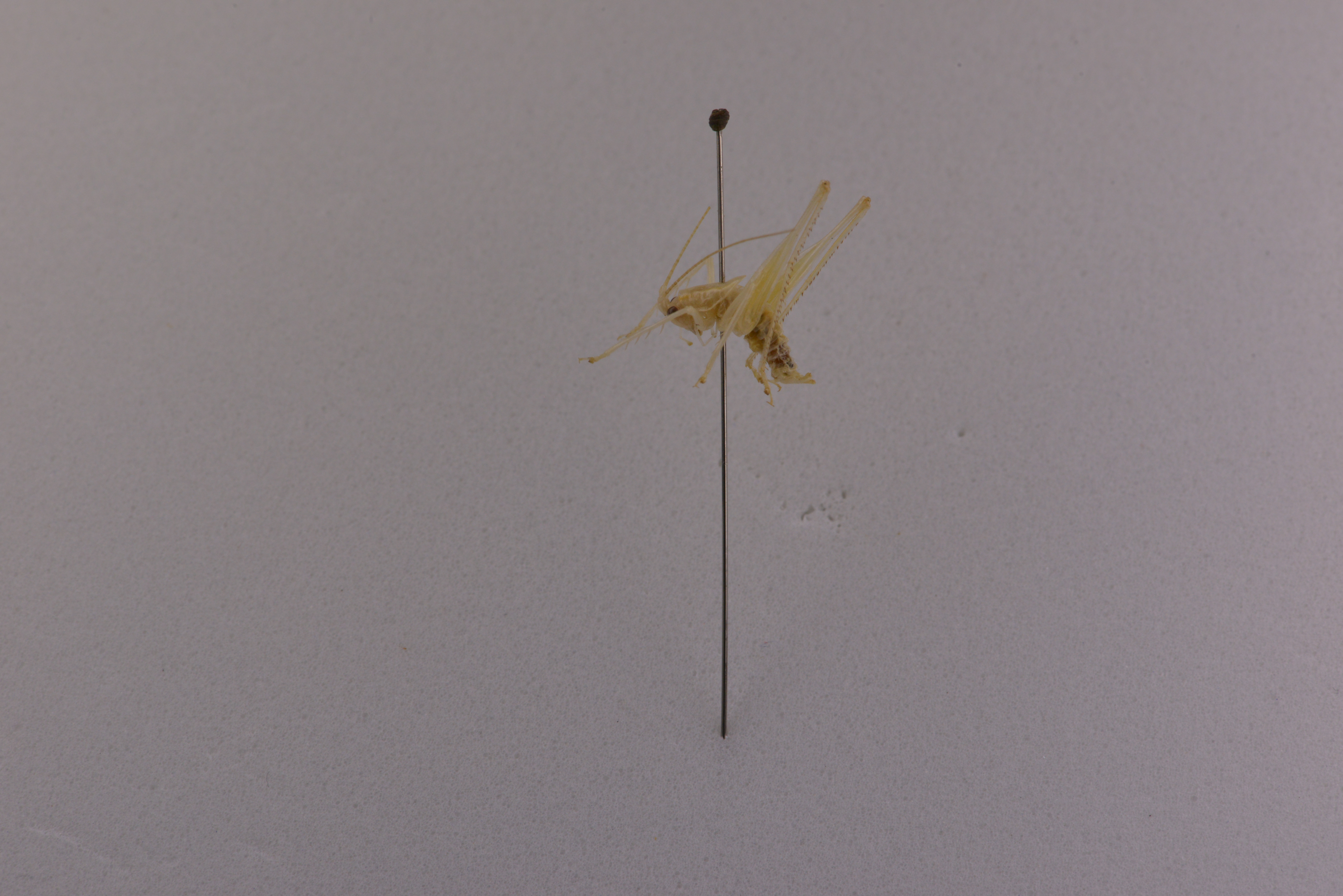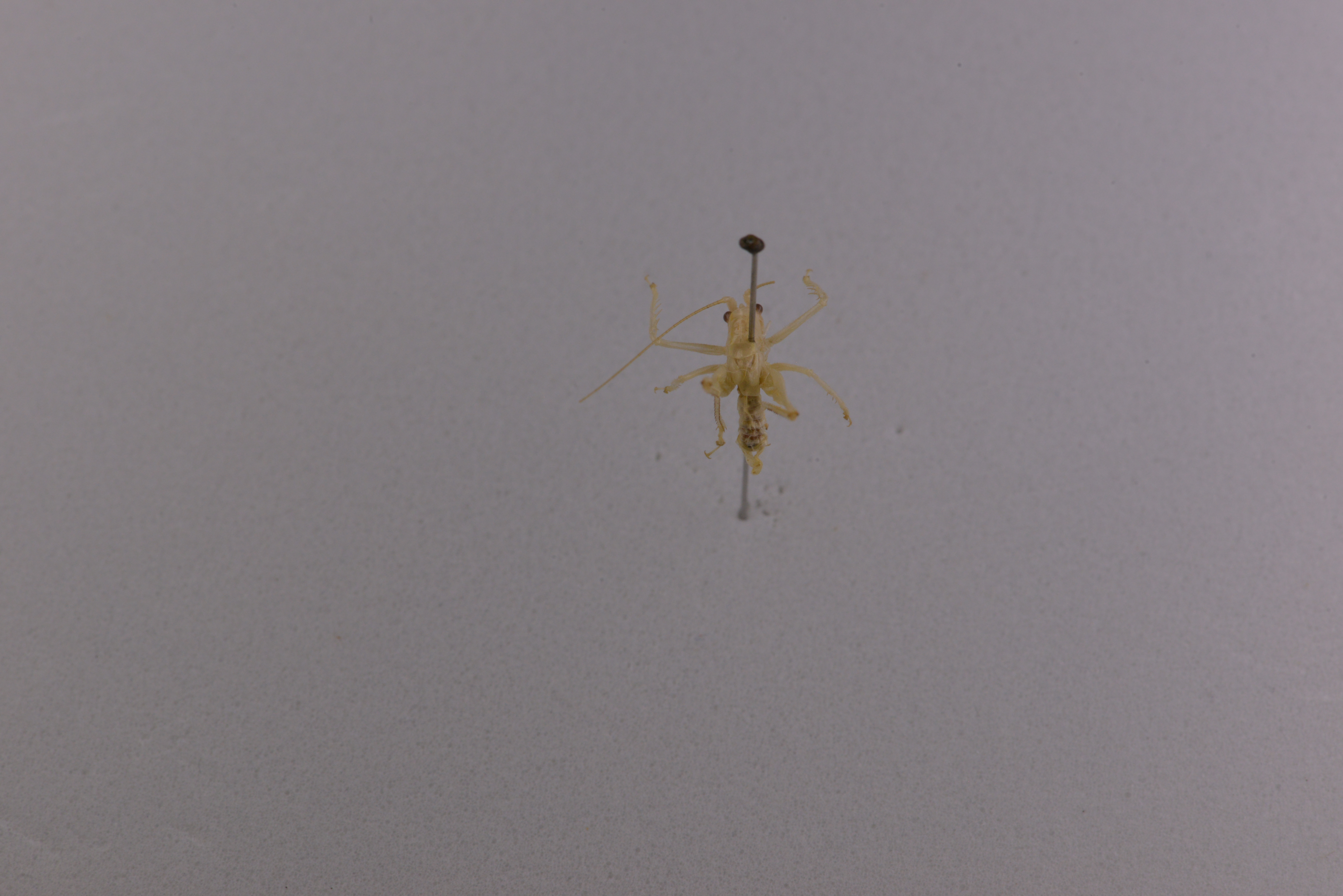 Thoracic auditory spiracle totally exposed. Tegmina short, too transparent to notice while alive, hind margin