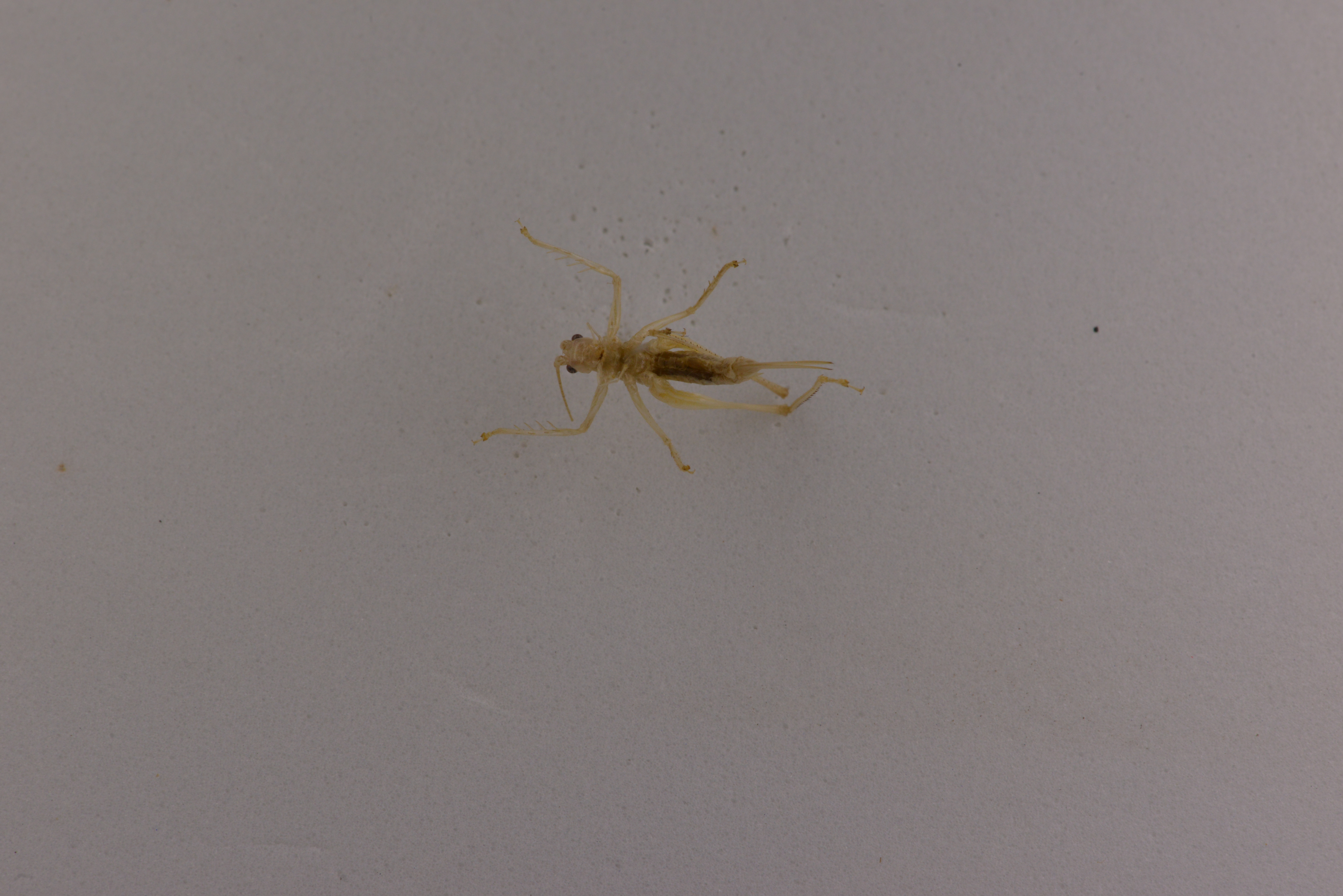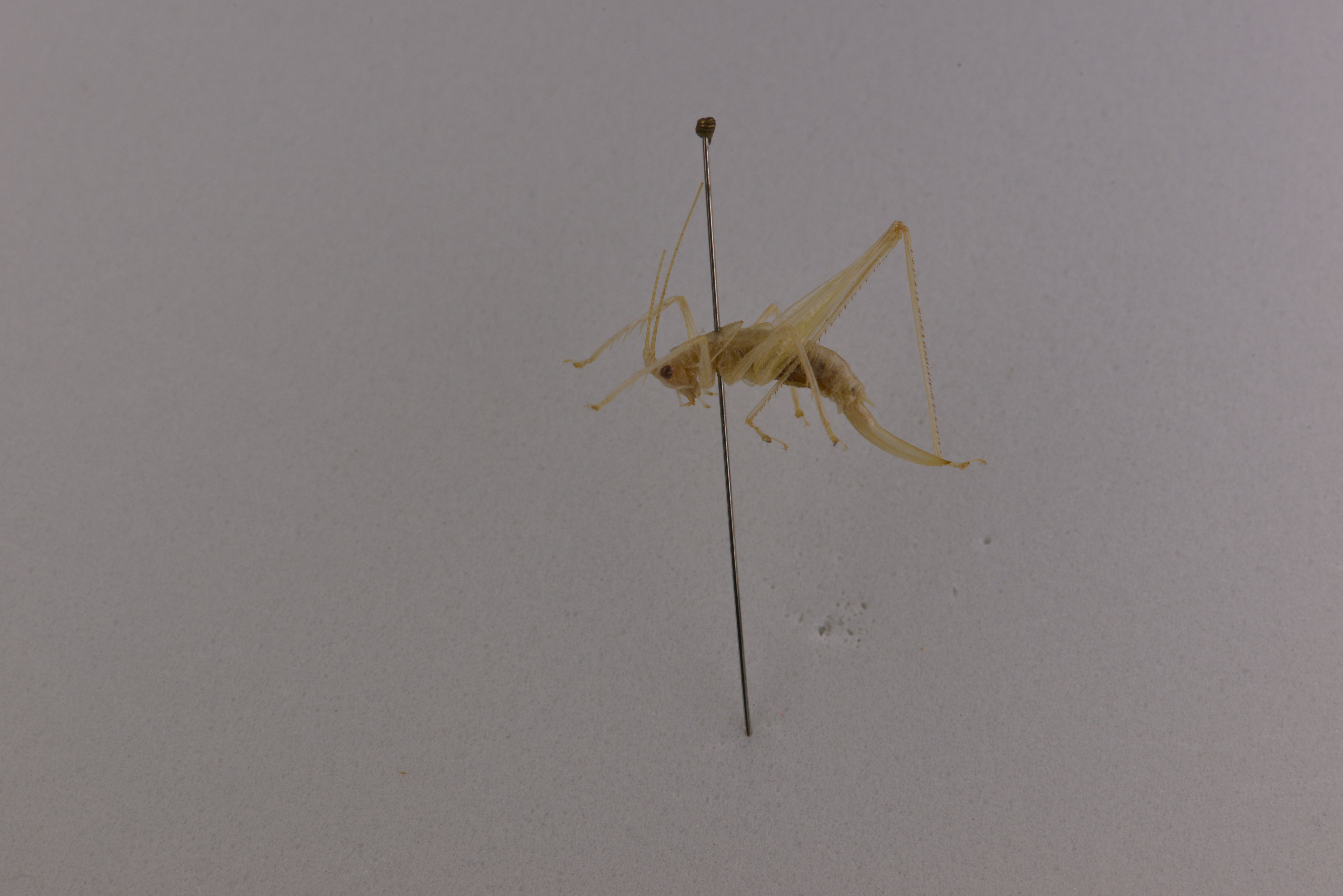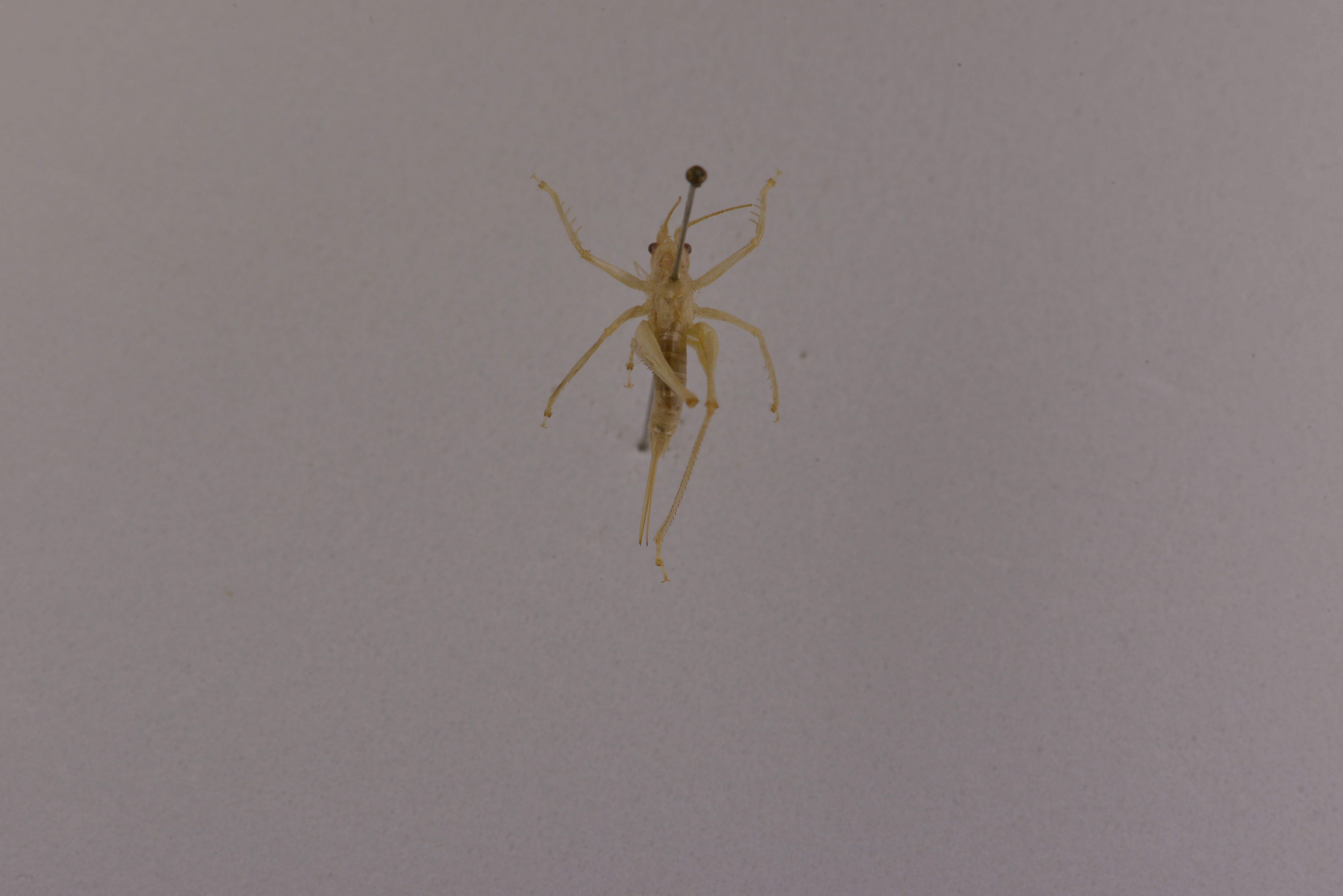 Thoracic auditory spiracle totally exposed. Tegmina short, too transparent to notice while alive, hind margin