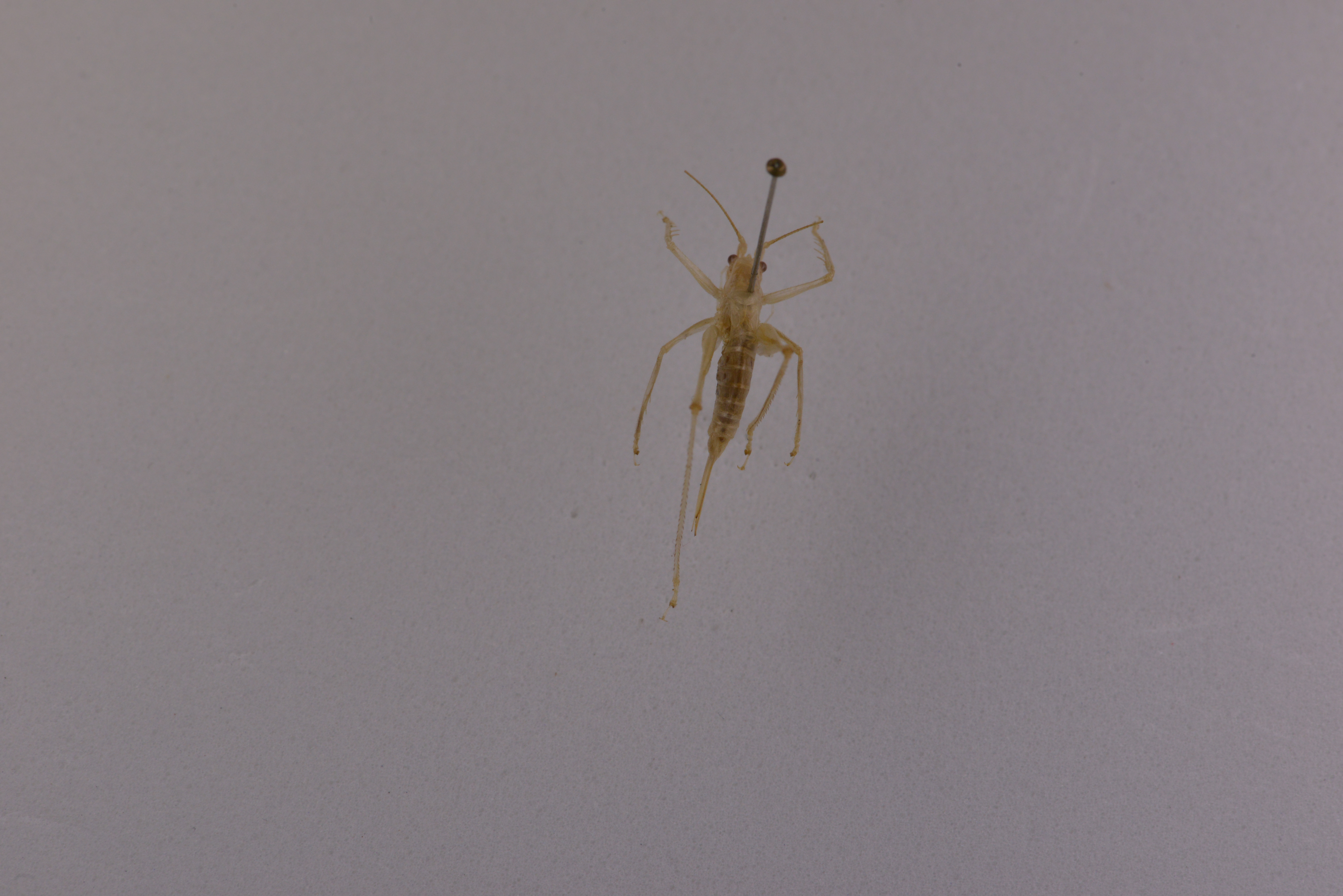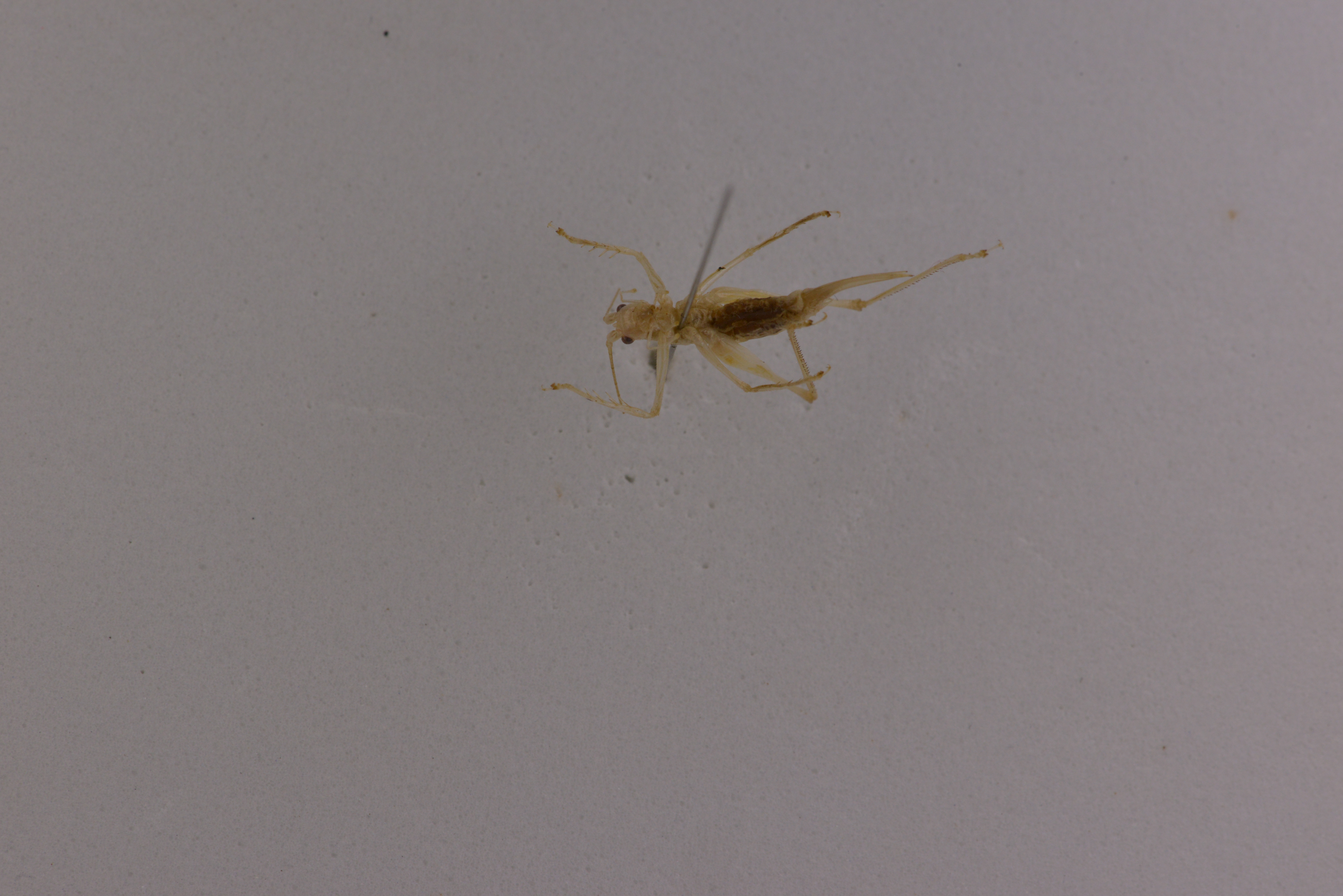 Thoracic auditory spiracle totally exposed. Tegmina short, too transparent to notice while alive, hind margin