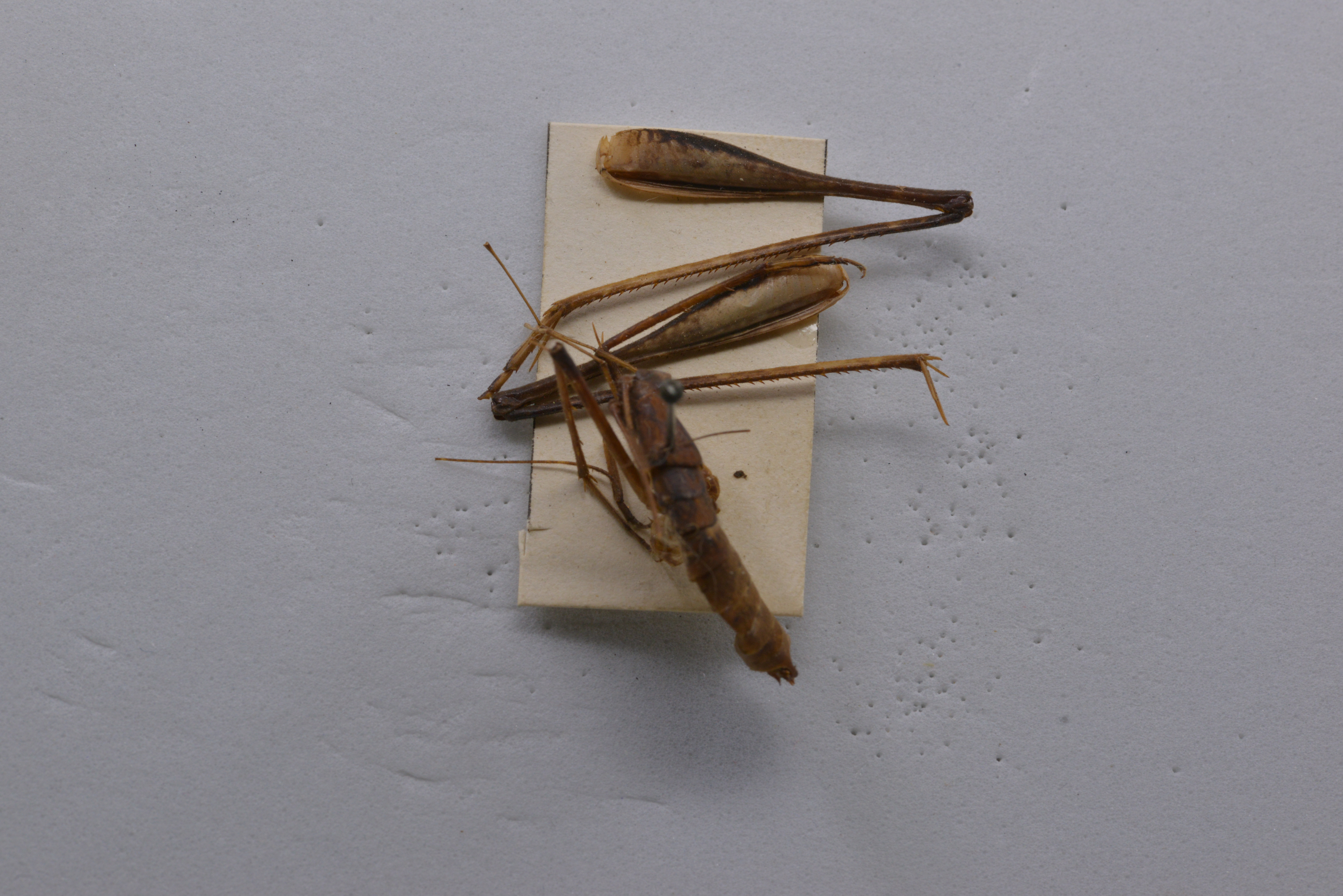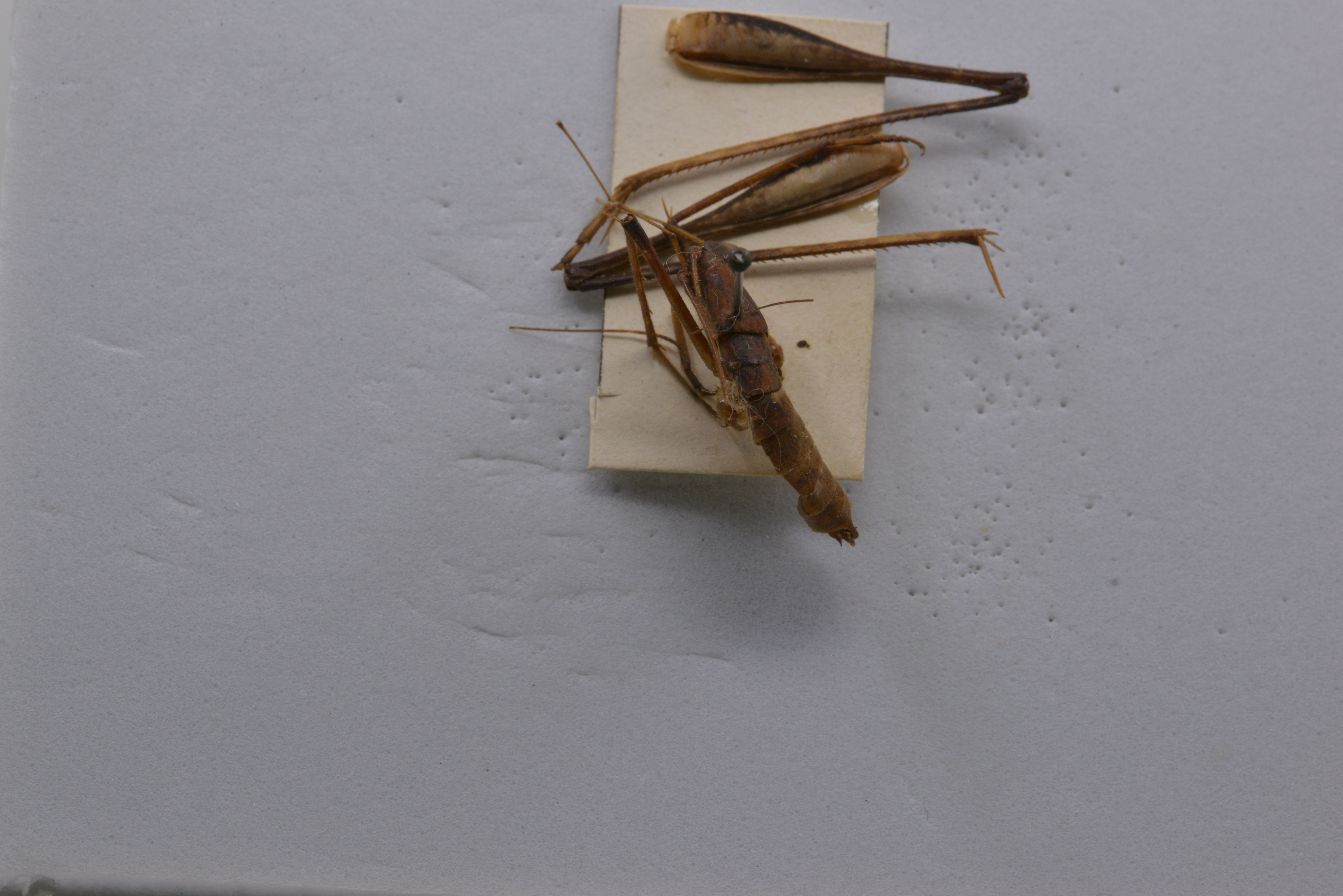 tubercles. Legs long and slender; fore femora about 2.2 times as long as the pronotum, beneath unarmed, internal