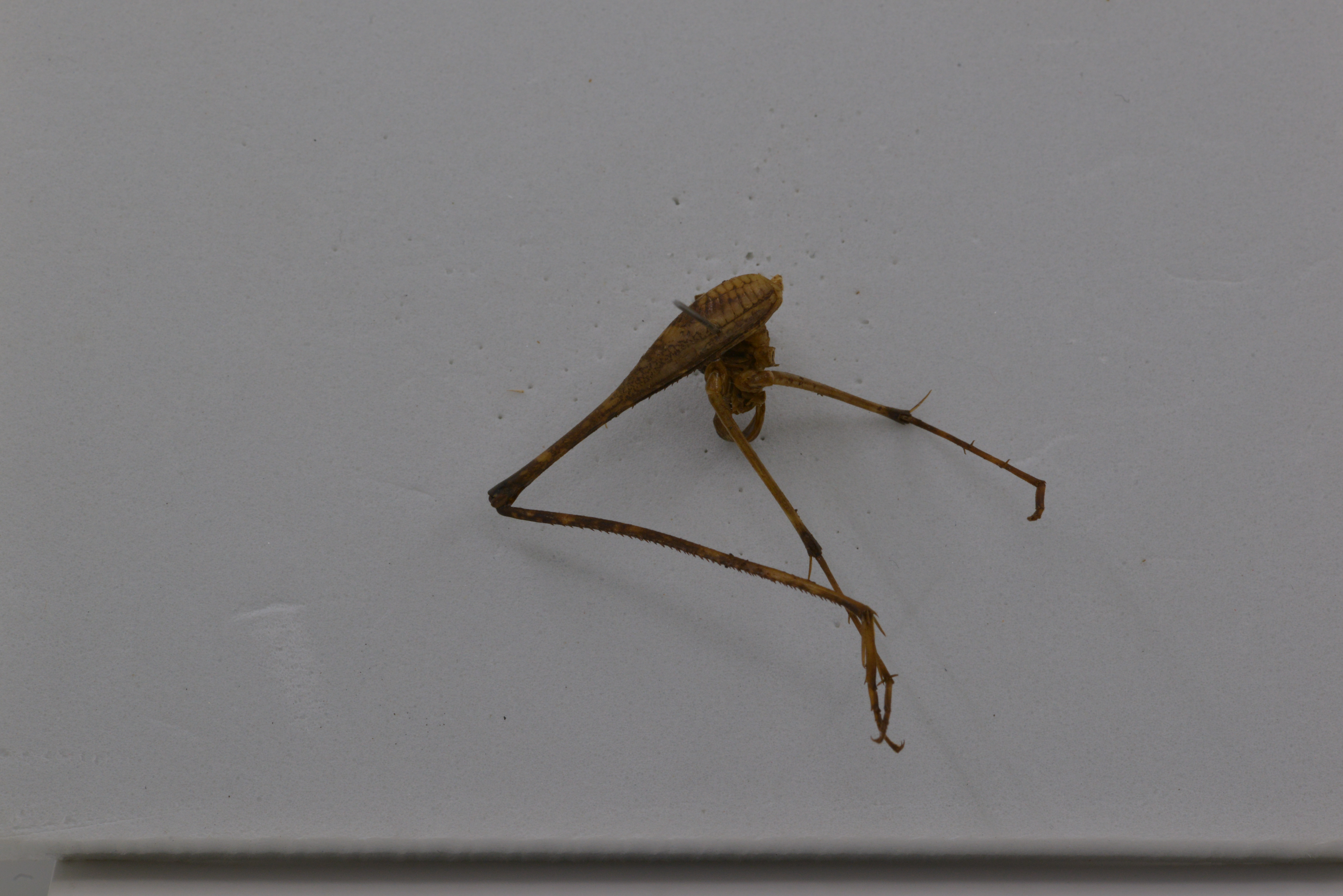 Legs long and slender; fore femora about 2.7 times as long as the pronotum, beneath unarmed, internal knee lobewithout spines, genicular lobe with 1 long movable spur; fore tibia beneath with 2 external and 2 internal spurs,