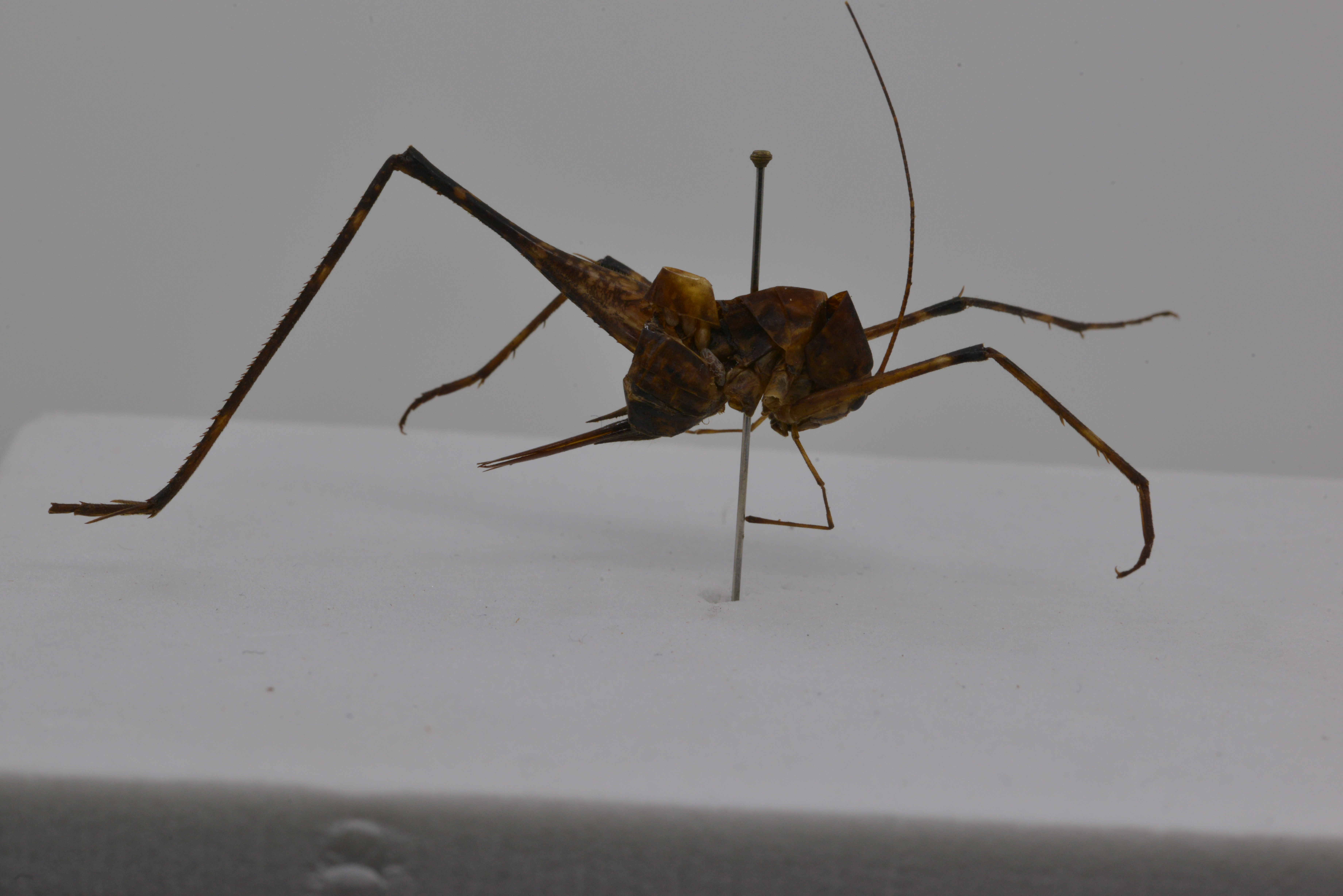 Legs long and slender; fore femora about 2.7 times as long as the pronotum, beneath unarmed, internal knee lobewithout spines, genicular lobe with 1 long movable spur; fore tibia beneath with 2 external and 2 internal spurs,